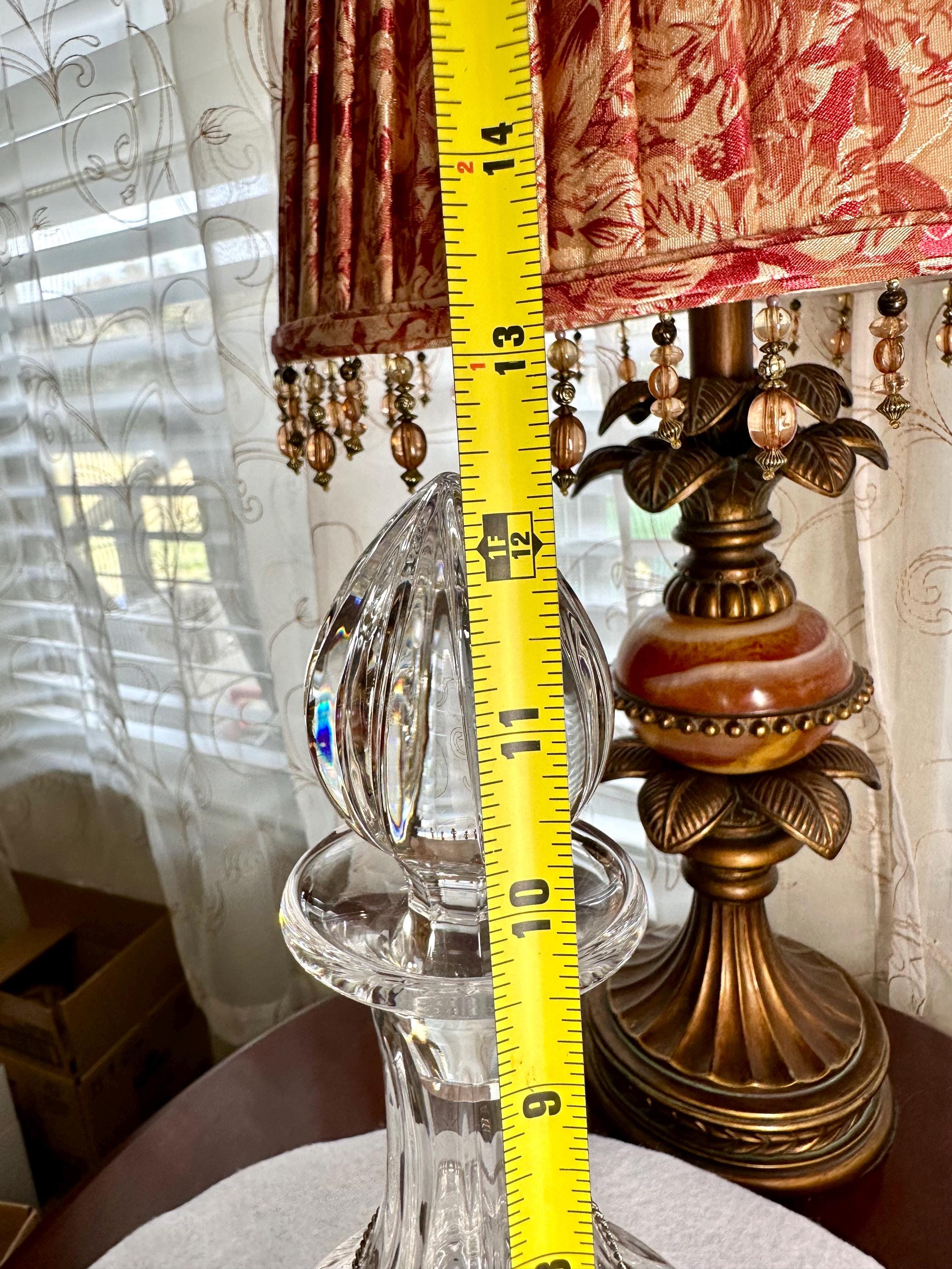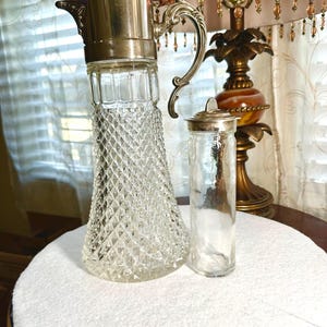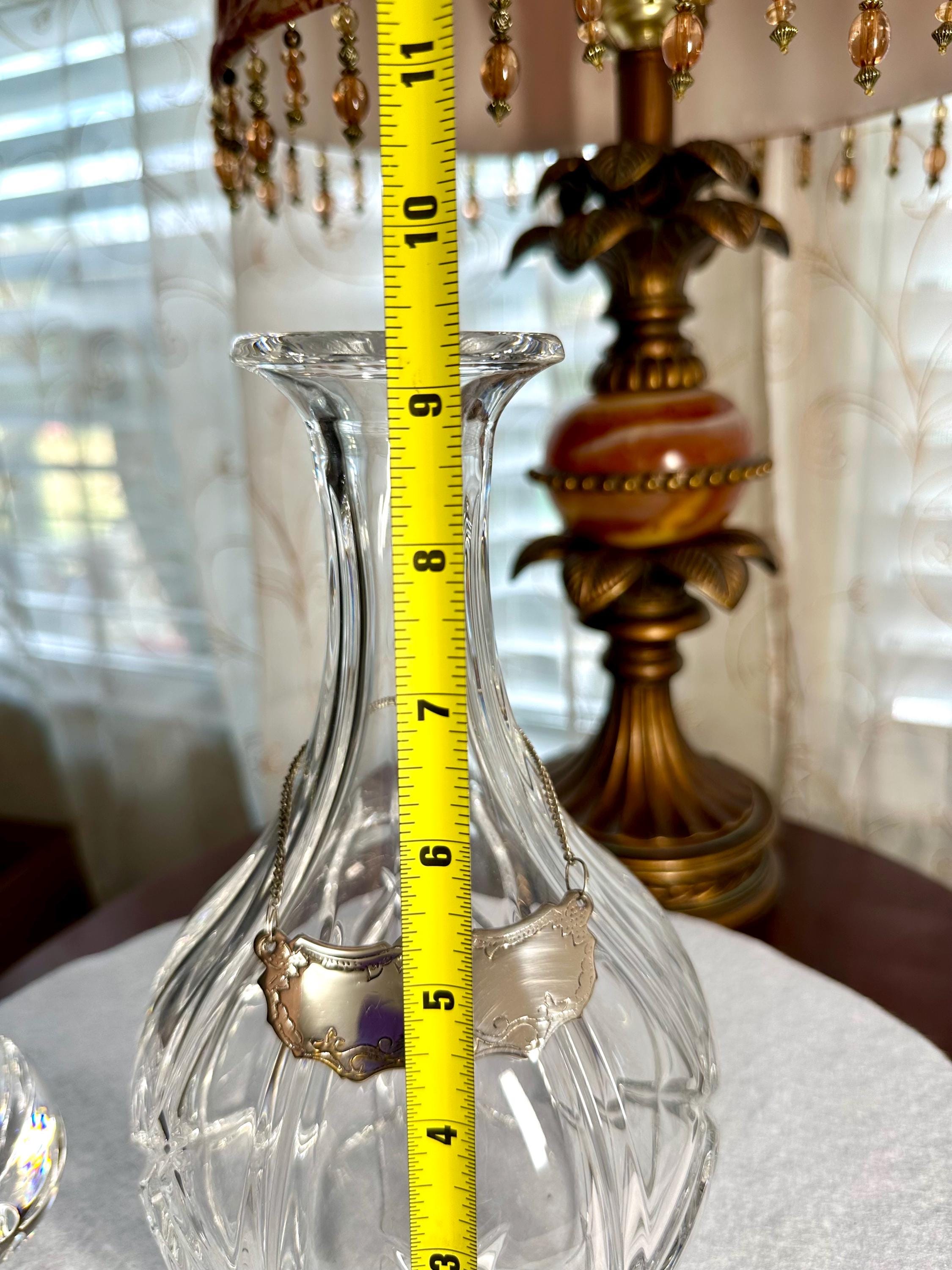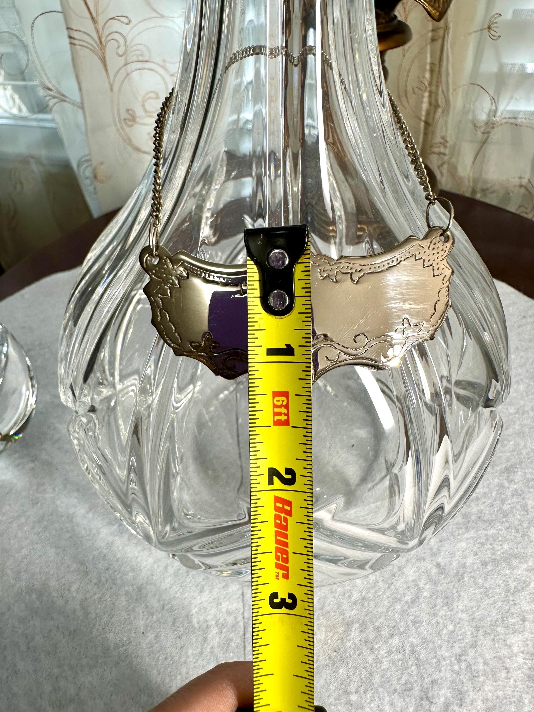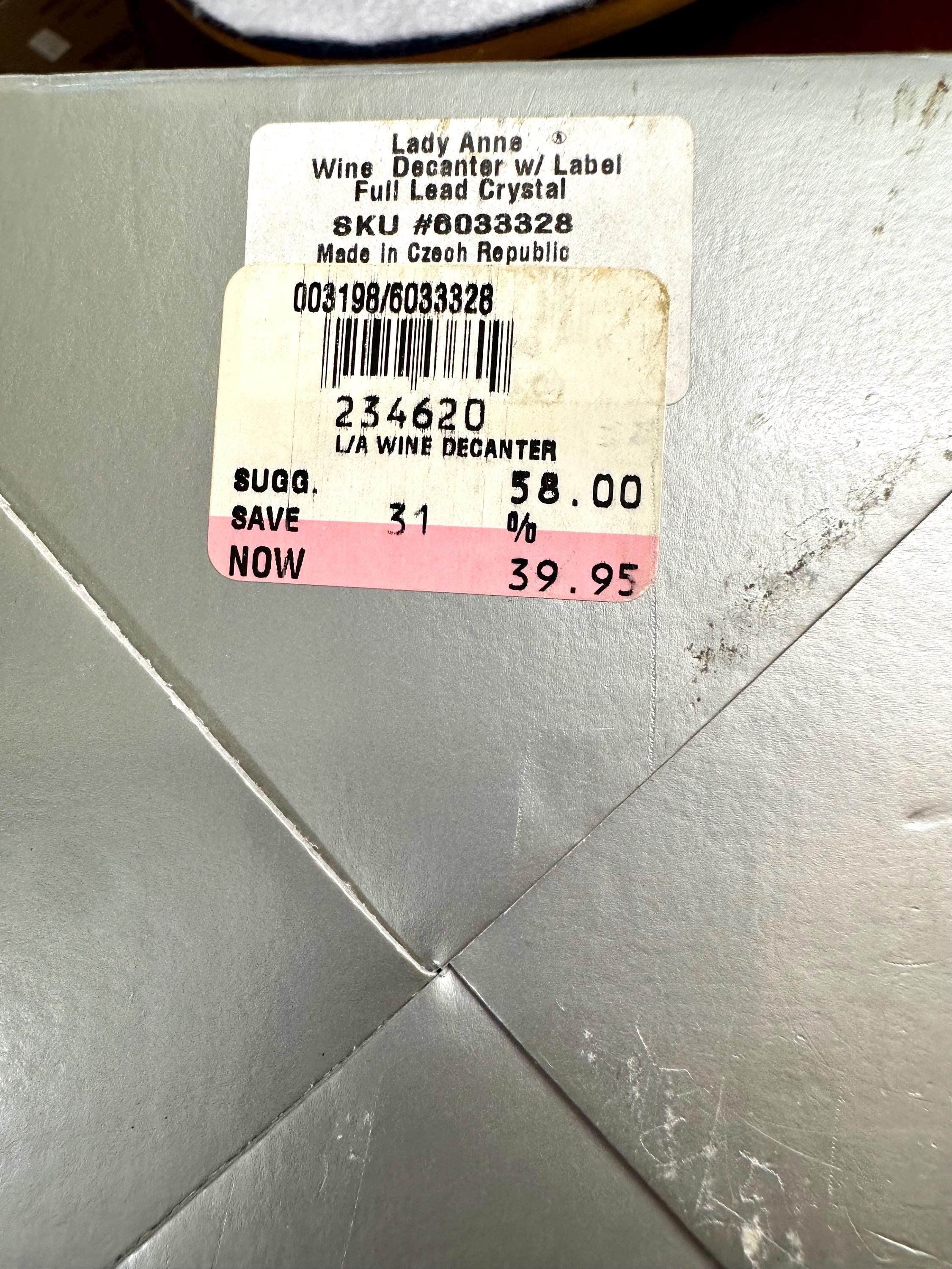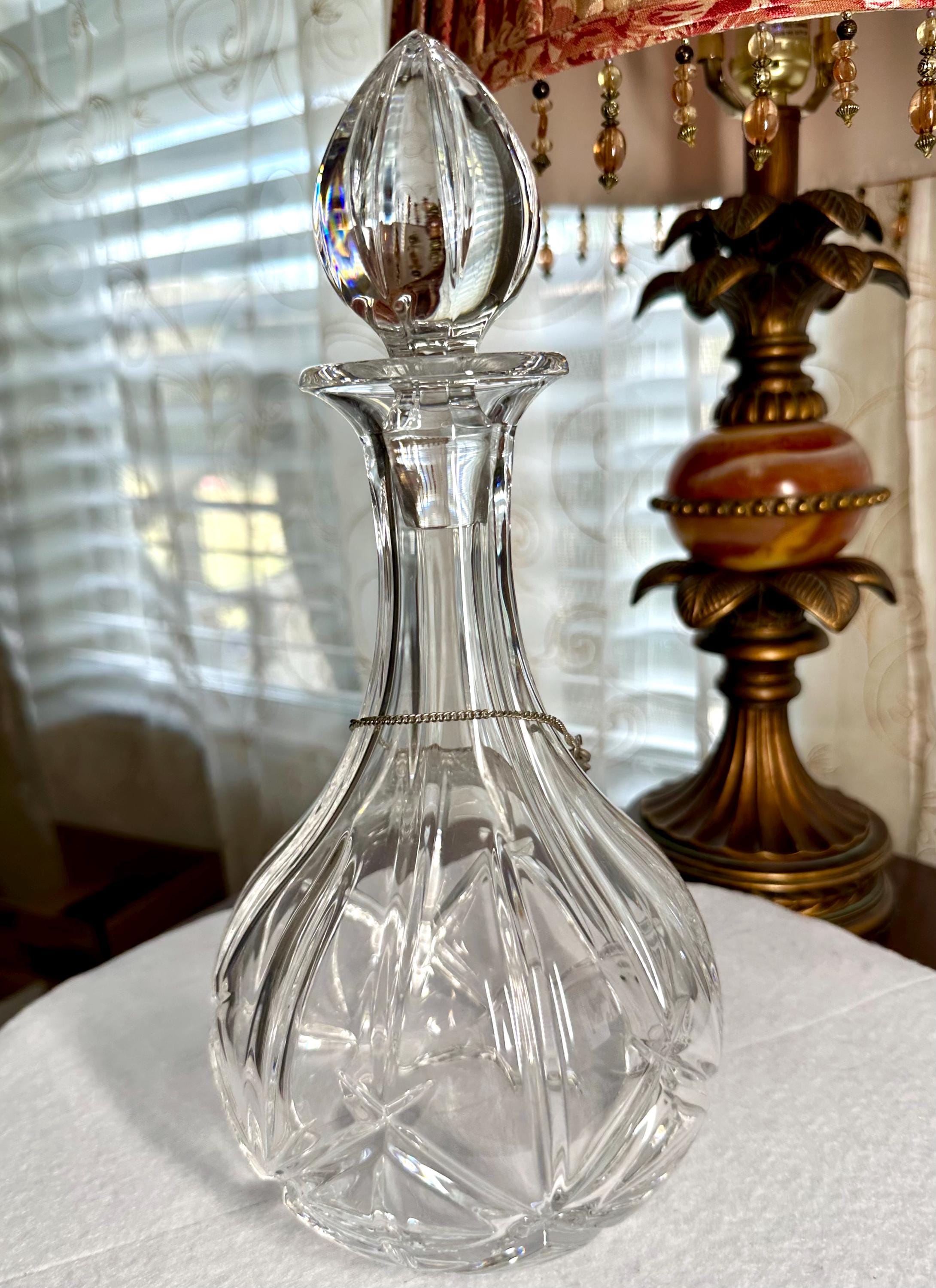 This is a beautiful Gorham Lady Anne Crystal Wine Decanter. This comes with the original box and metal tag that has not been engraved on. This is perfect for your personal bar at home or to be given as a gift. There are no cracks, scratches, or blemishes that I have been able to find. There is a slight discoloration on the metal tag. The stopper in the decanter is 12 1/2 inches tall; without the stopper, the decanter is 9 inches tall. The metal tag is 2 1/2 inches long and 1/2 inch tall. There are pictures of the blemished tag and the dimensions of the decanter. We do not recommend that you put this item in the dishwasher, microwave, or on the stove. Hand wash this item only with mild soap and warm water.