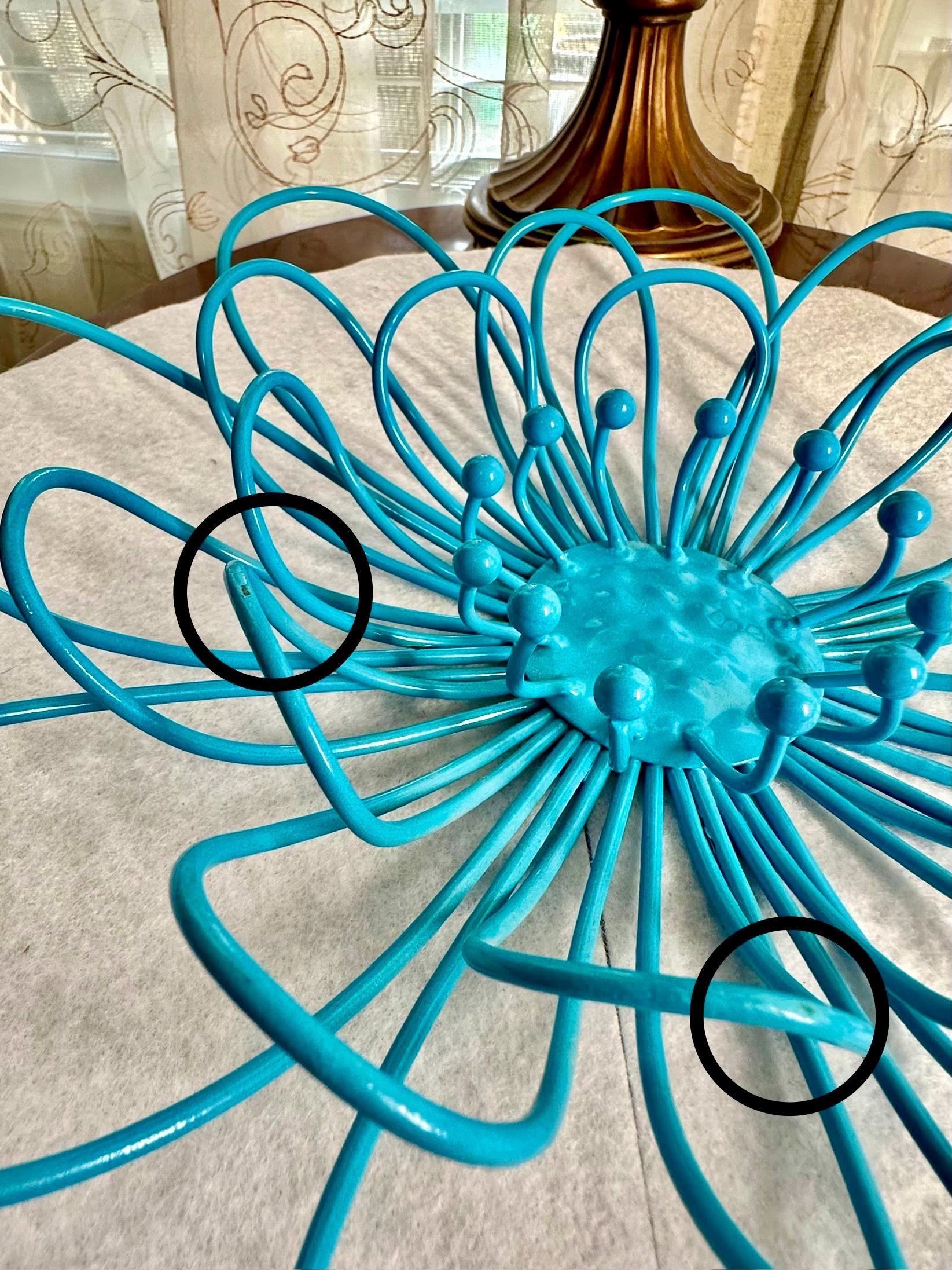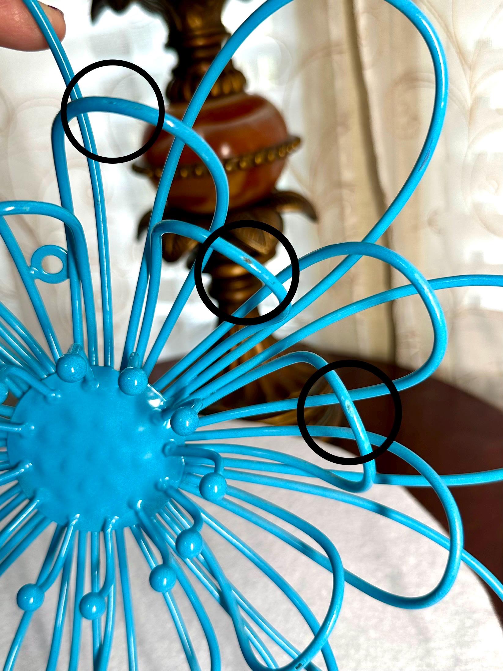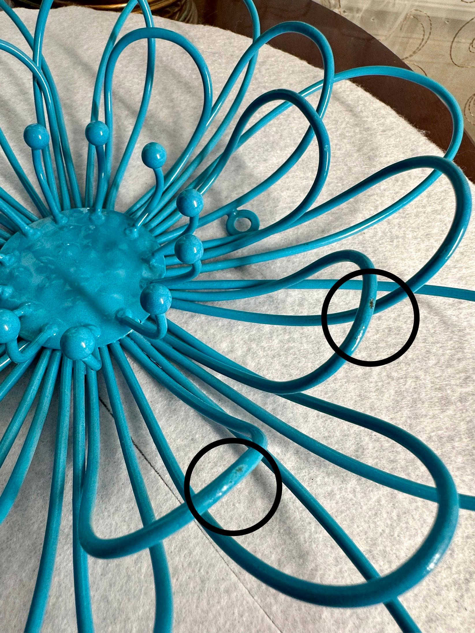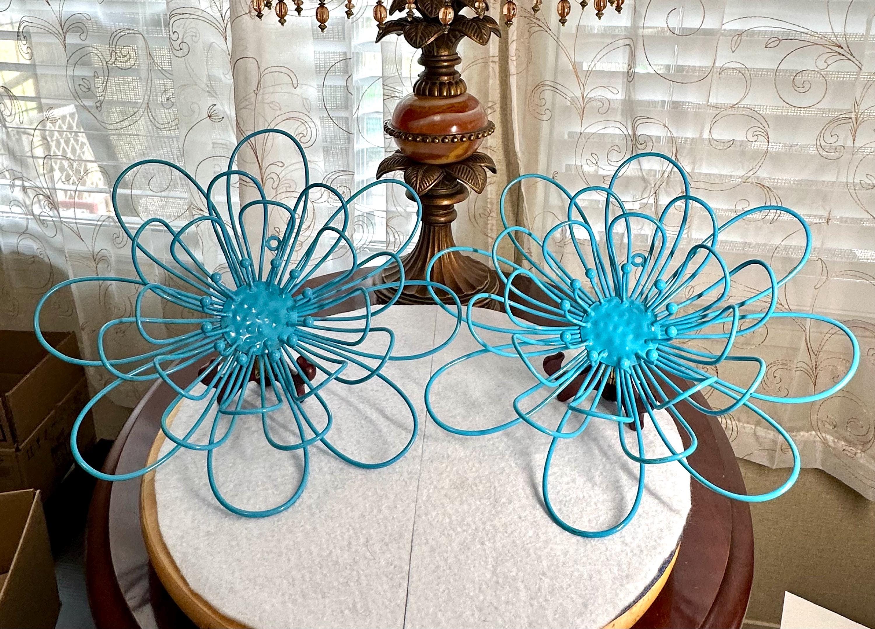 This is a pair of Atomic Turquoise Metal Flowers. These do have a few spots on them where the coating has rubbed off. The areas are small and can be repaired easily. I did not have the correct paint to use to cover up the small areas. I have pictures included. These are 12 inches wide. If you would like additional pictures, please contact me.