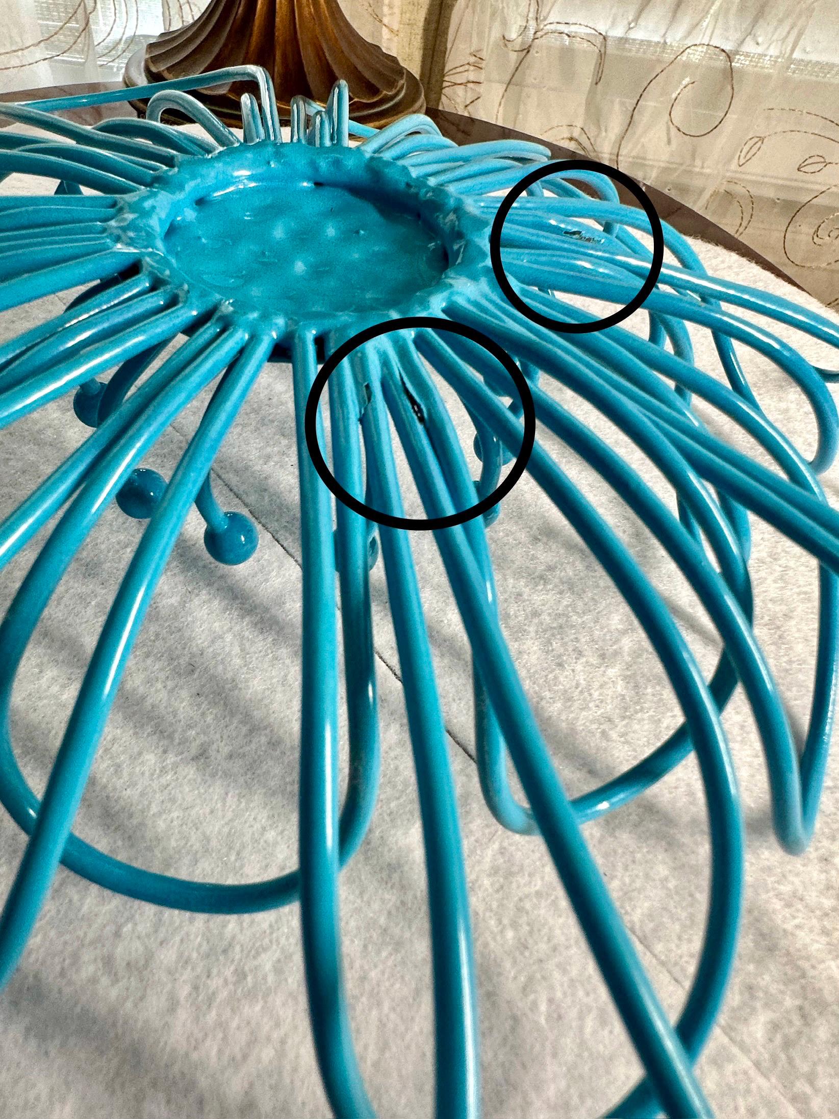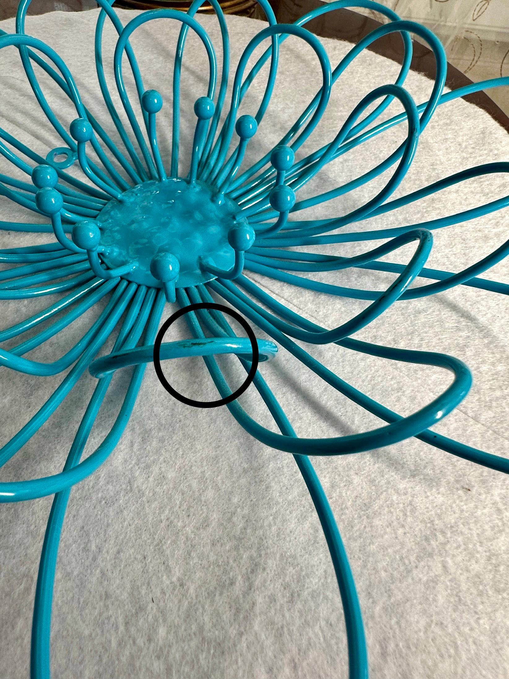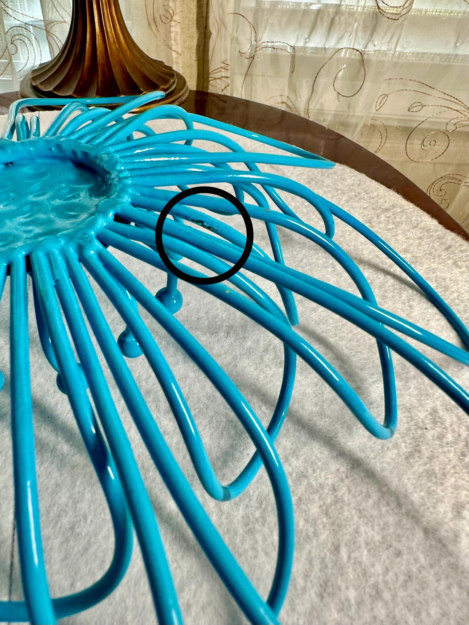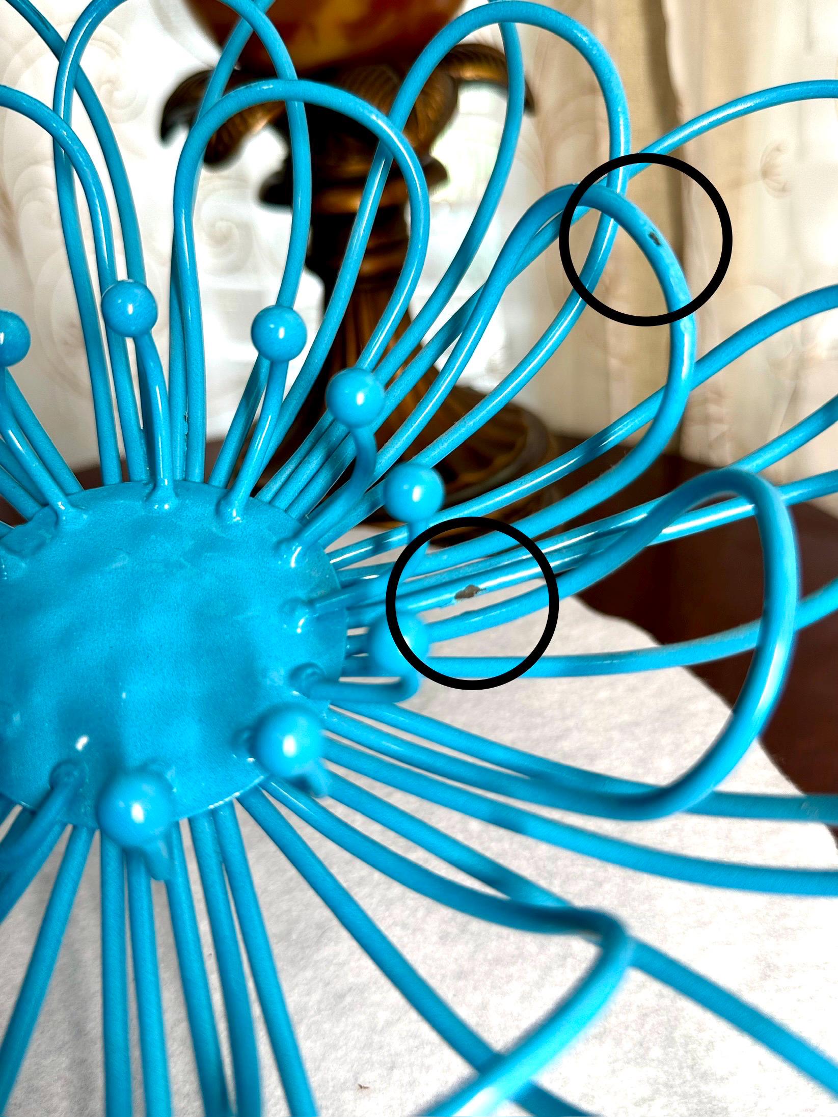 This is a pair of Atomic Turquoise Metal Flowers. These do have a few spots on them where the coating has rubbed off. The areas are small and can be repaired easily. I did not have the correct paint to use to cover up the small areas. I have pictures included. These are 12 inches wide. If you would like additional pictures, please contact me.