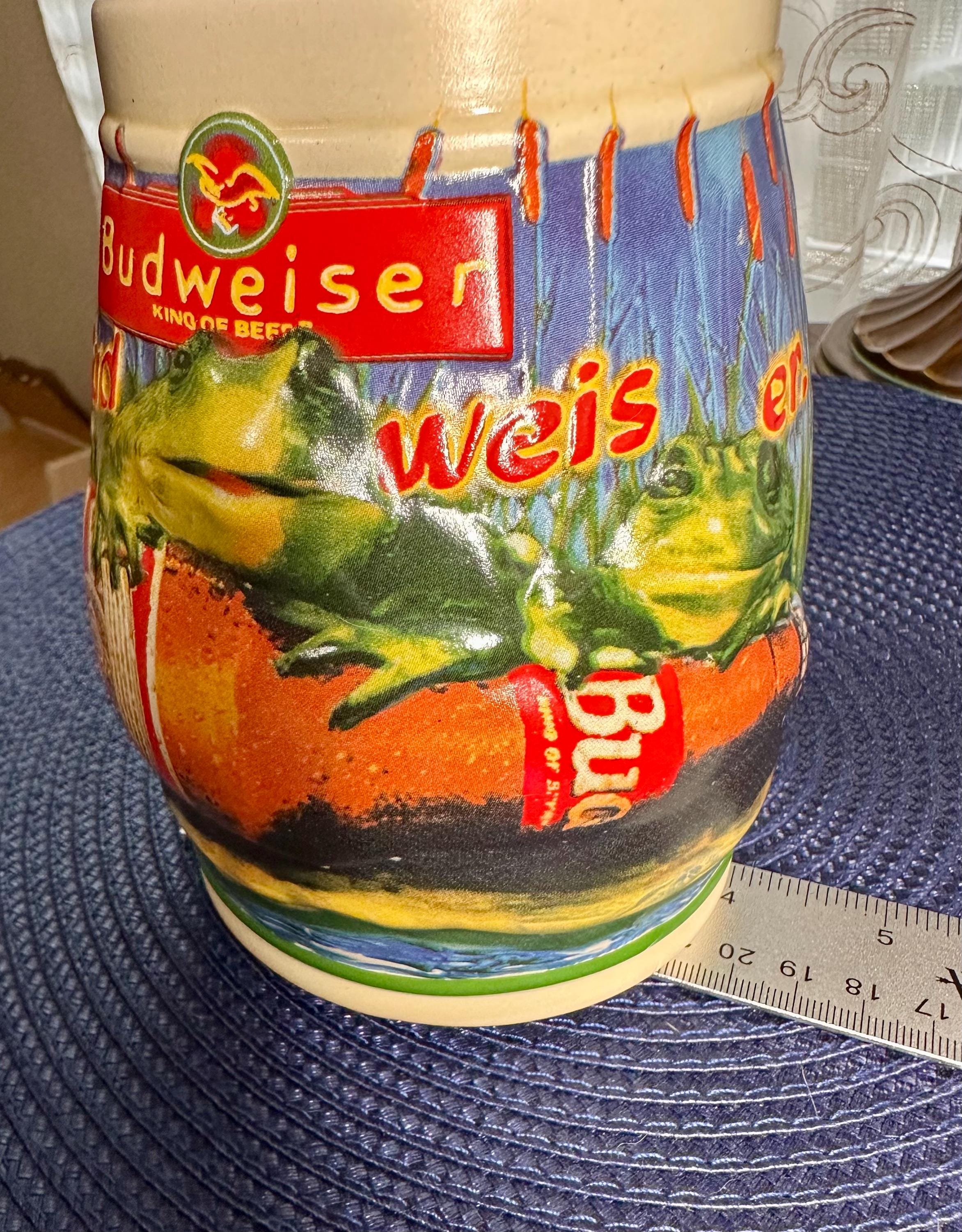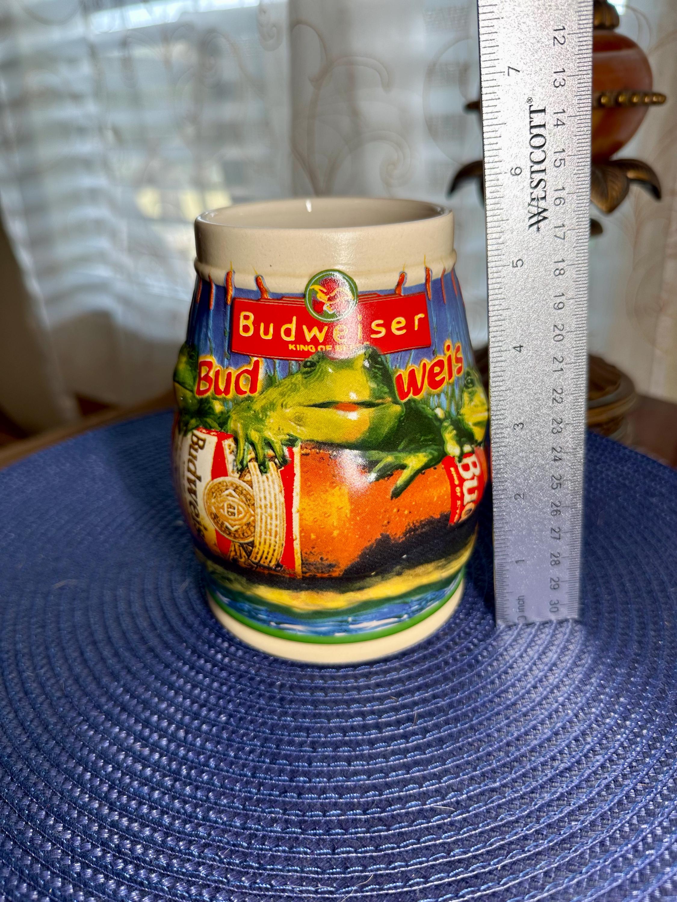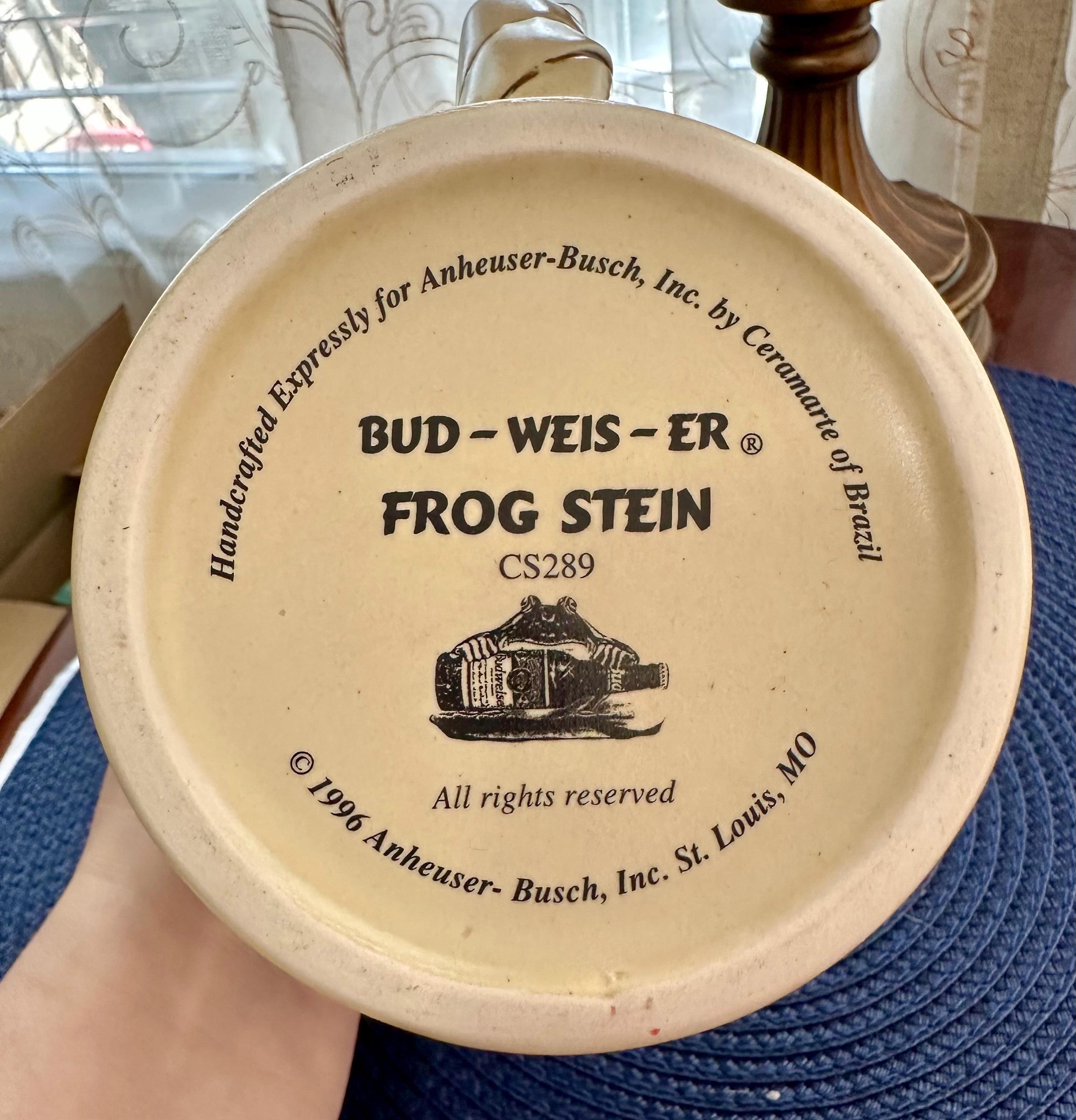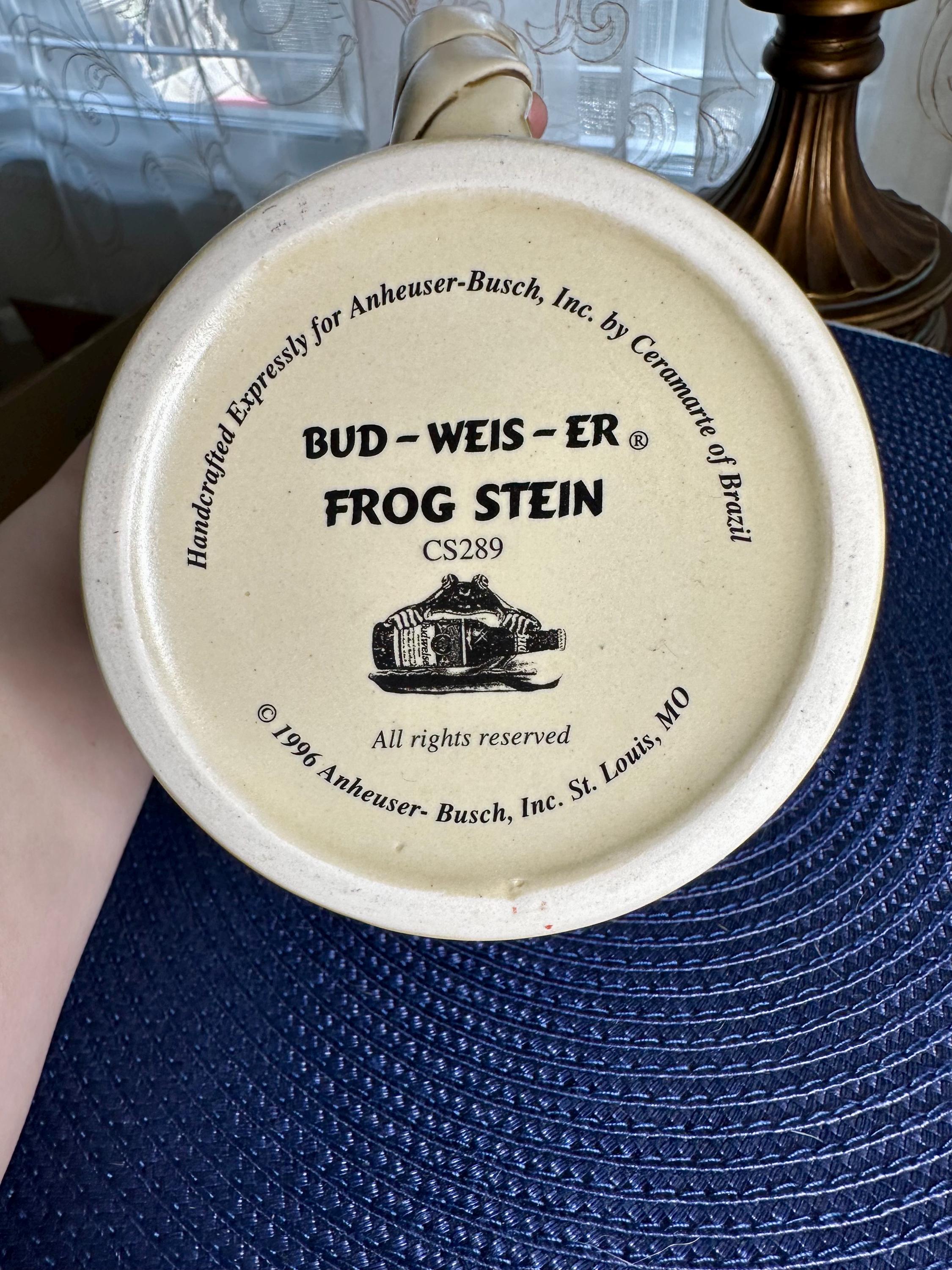 Take a step back into the 90s, where the Budweiser Frogs were all the rage. This is a vintage stein from 1996 with no chips, cracks, or crazing. This stein stands at 6 1/2 inches tall and is 4 inches wide at the base. The bottom of the stein reads: Handcrafted Expressly for Anheuser-Busch Inc. by Carmate of Brazil BUD-WEIS-ER FROG STEIN CS289 All rights reserved 1996 Anheuser-Busch Inc., St. Louis, MO