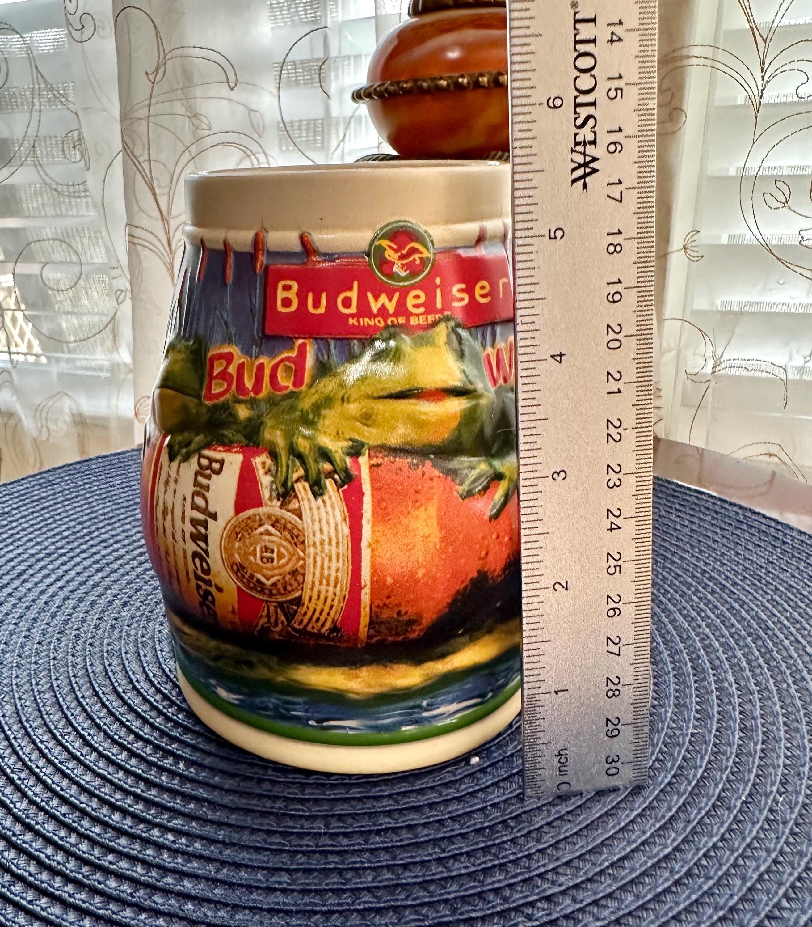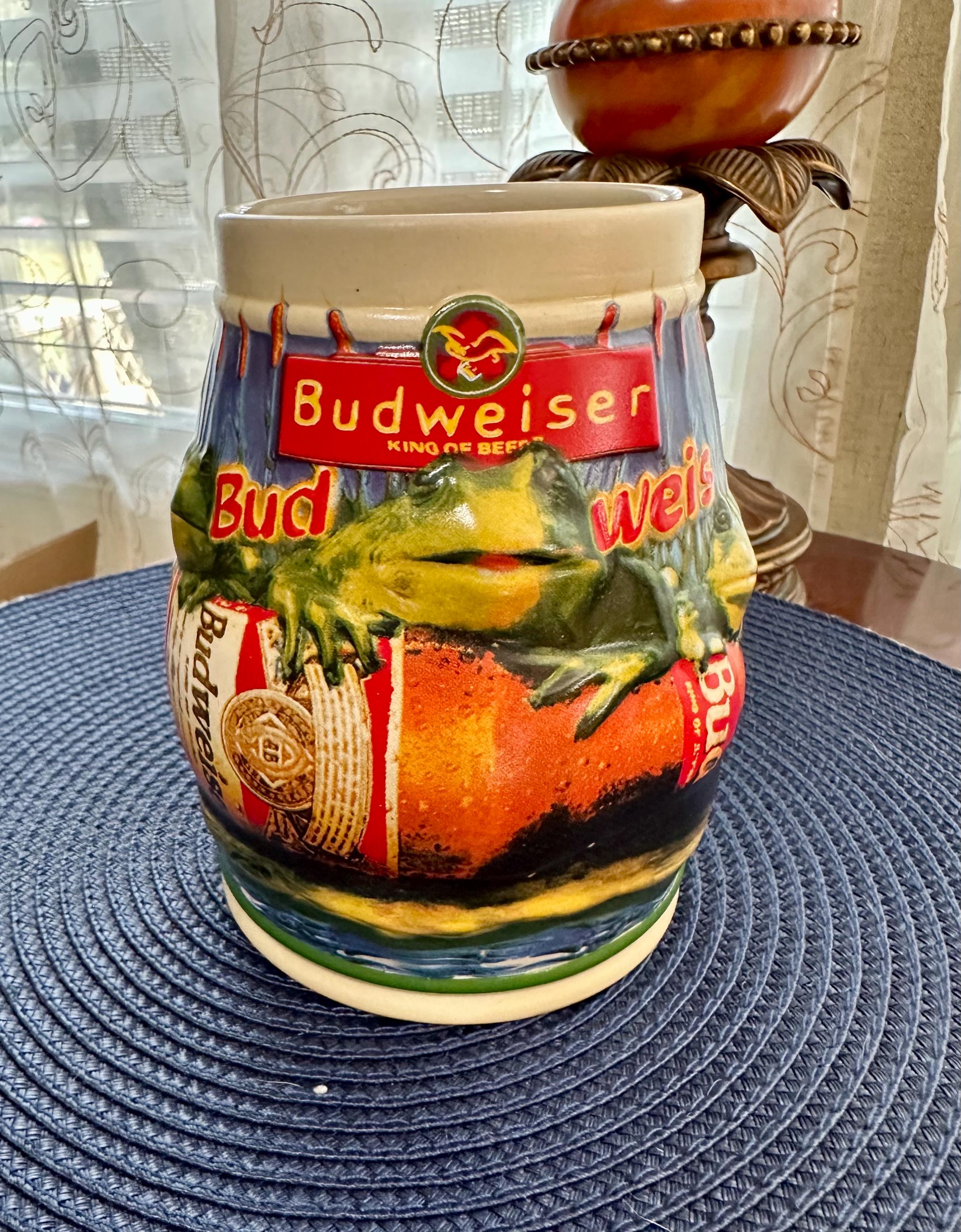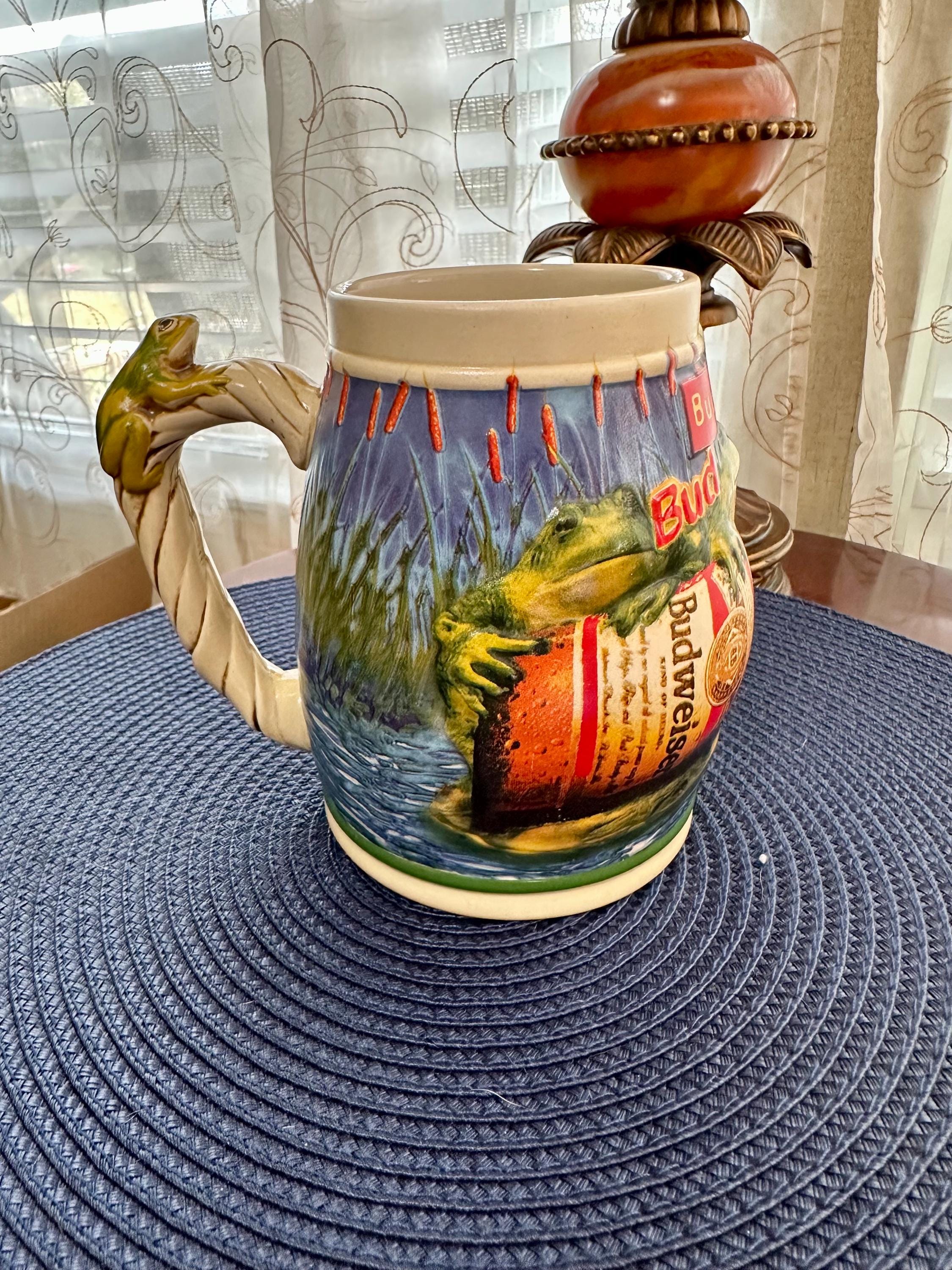 Take a step back into the 90s, where the Budweiser Frogs were all the rage. This is a vintage stein from 1996 with no chips, cracks, or crazing. This stein stands at 6 1/2 inches tall and is 4 inches wide at the base. The bottom of the stein reads: Handcrafted Expressly for Anheuser-Busch Inc. by Carmate of Brazil BUD-WEIS-ER FROG STEIN CS289 All rights reserved 1996 Anheuser-Busch Inc., St. Louis, MO