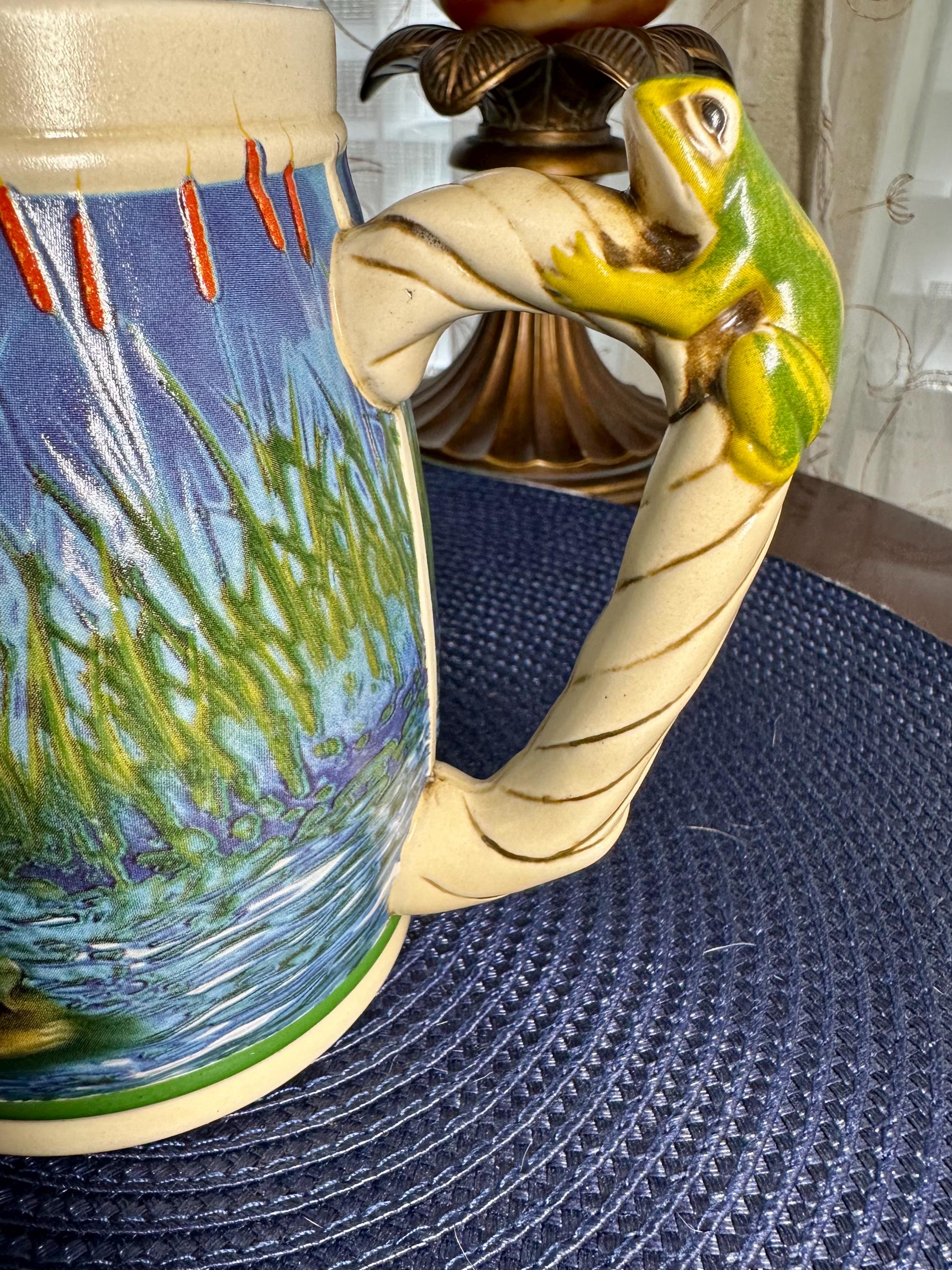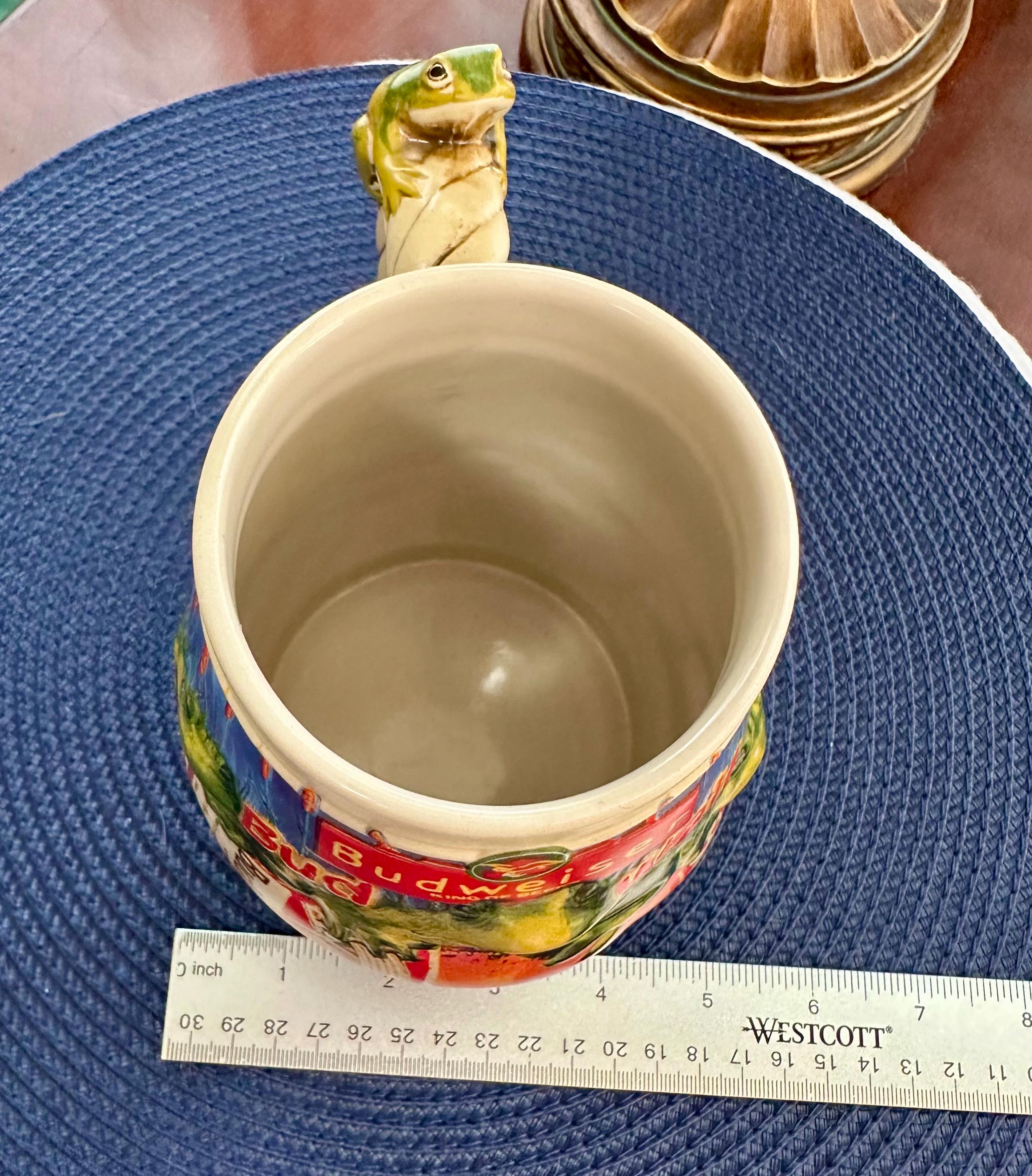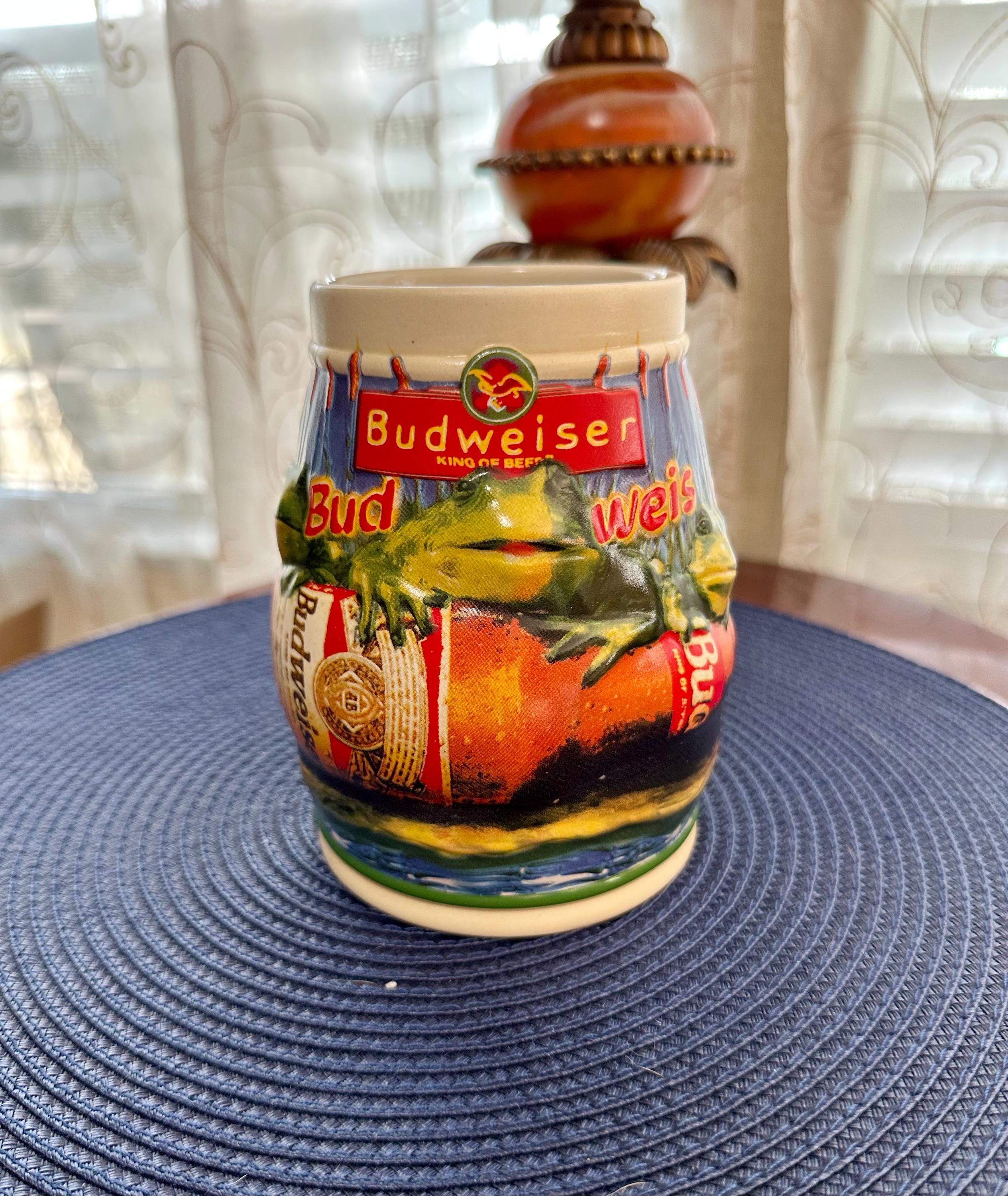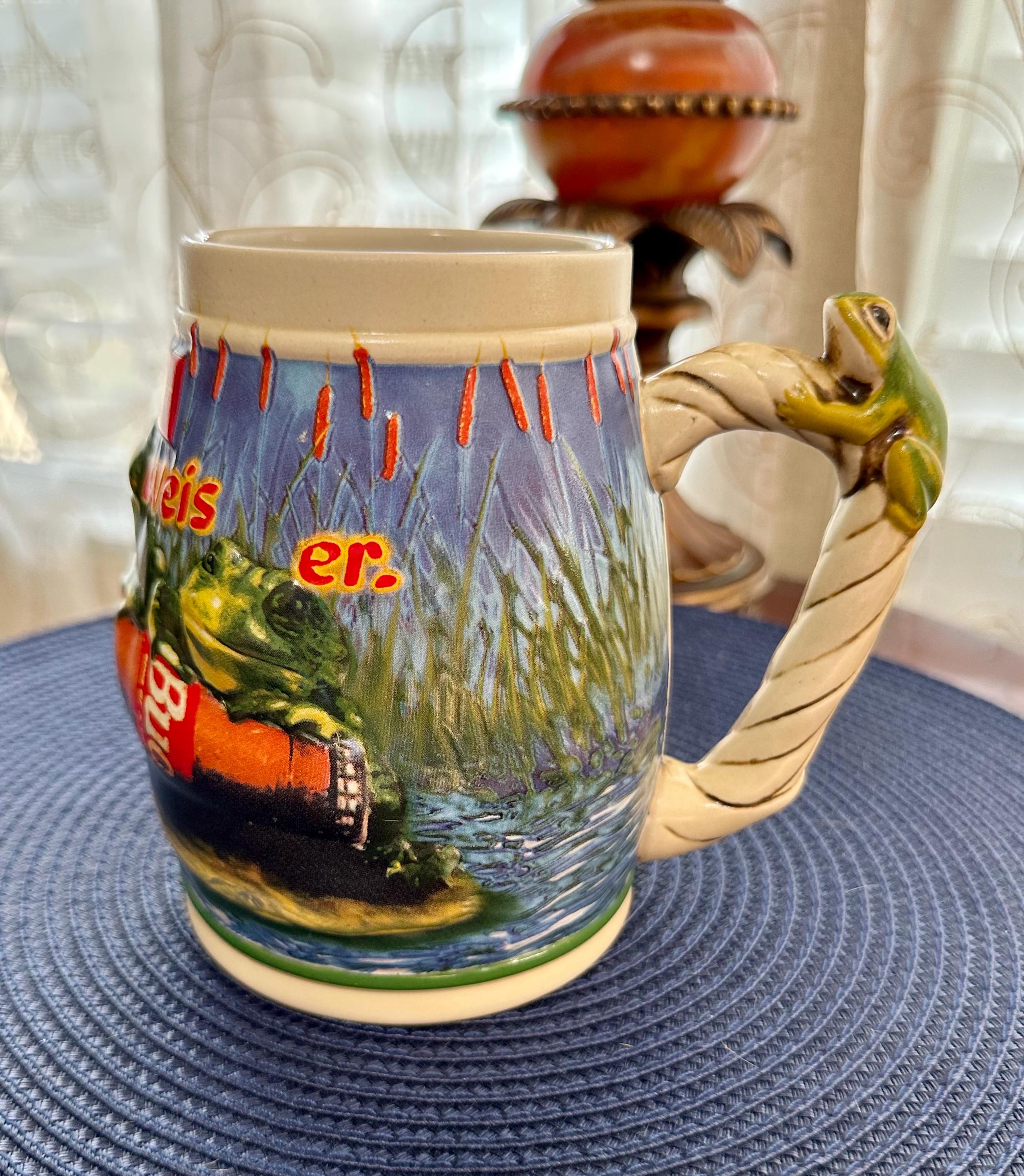 Take a step back into the 90s, where the Budweiser Frogs were all the rage. This is a vintage stein from 1996 with no chips, cracks, or crazing. This stein stands at 6 1/2 inches tall and is 4 inches wide at the base. The bottom of the stein reads: Handcrafted Expressly for Anheuser-Busch Inc. by Carmate of Brazil BUD-WEIS-ER FROG STEIN CS289 All rights reserved 1996 Anheuser-Busch Inc., St. Louis, MO