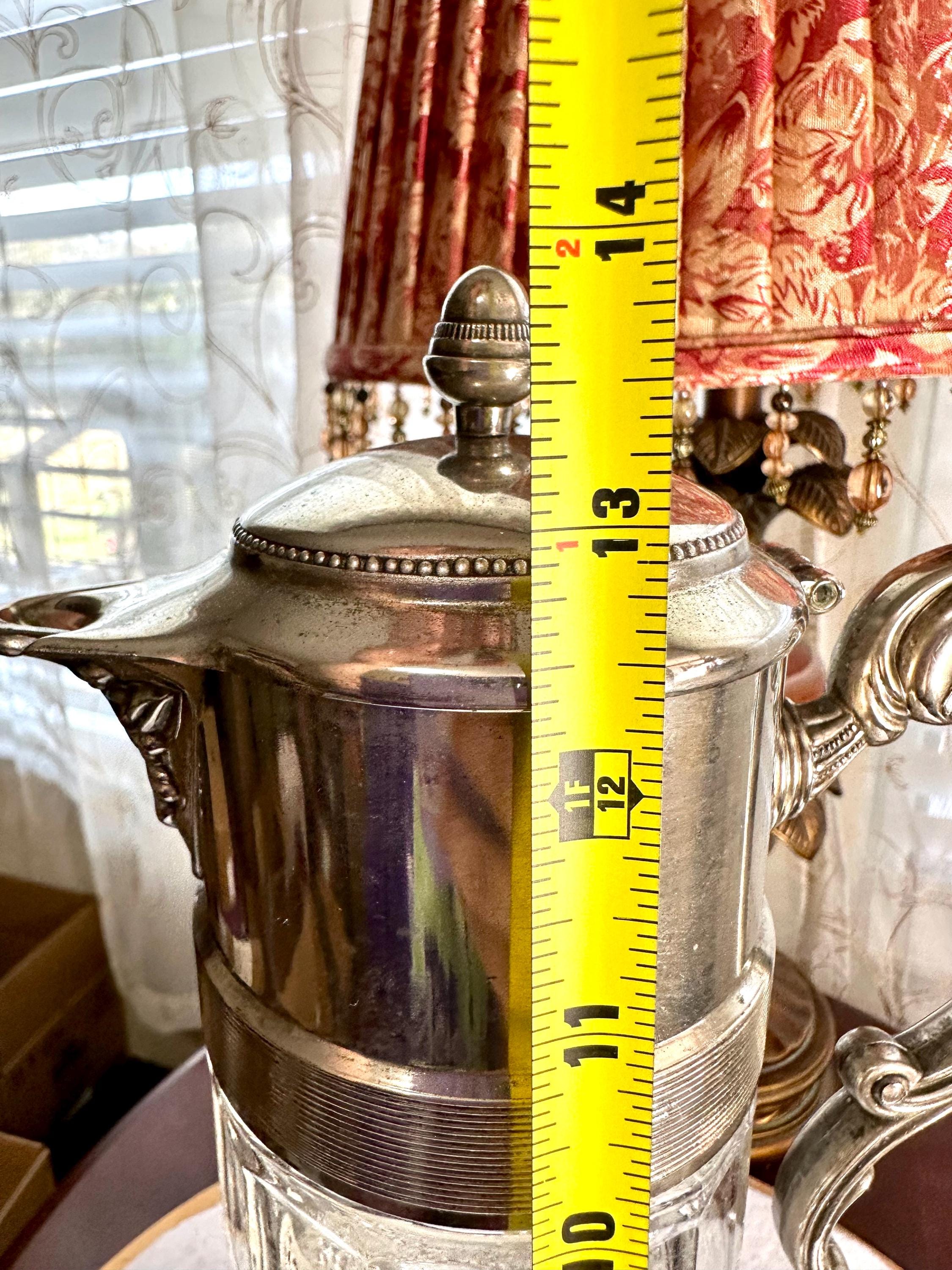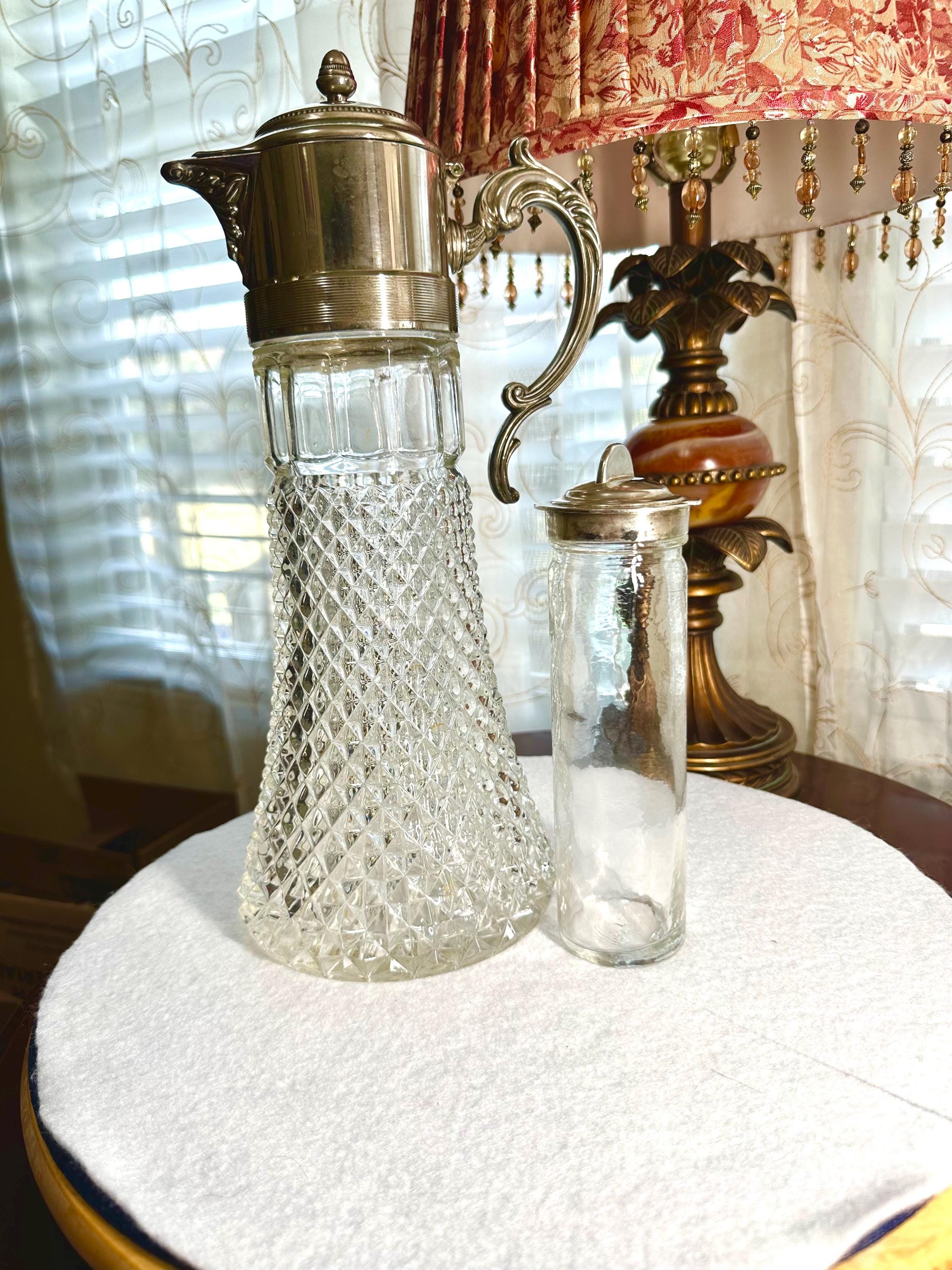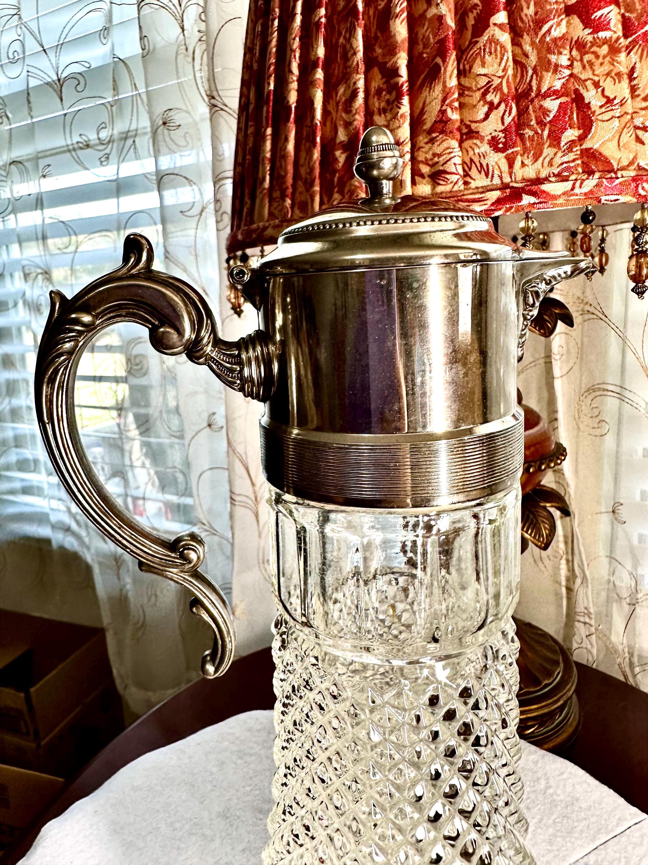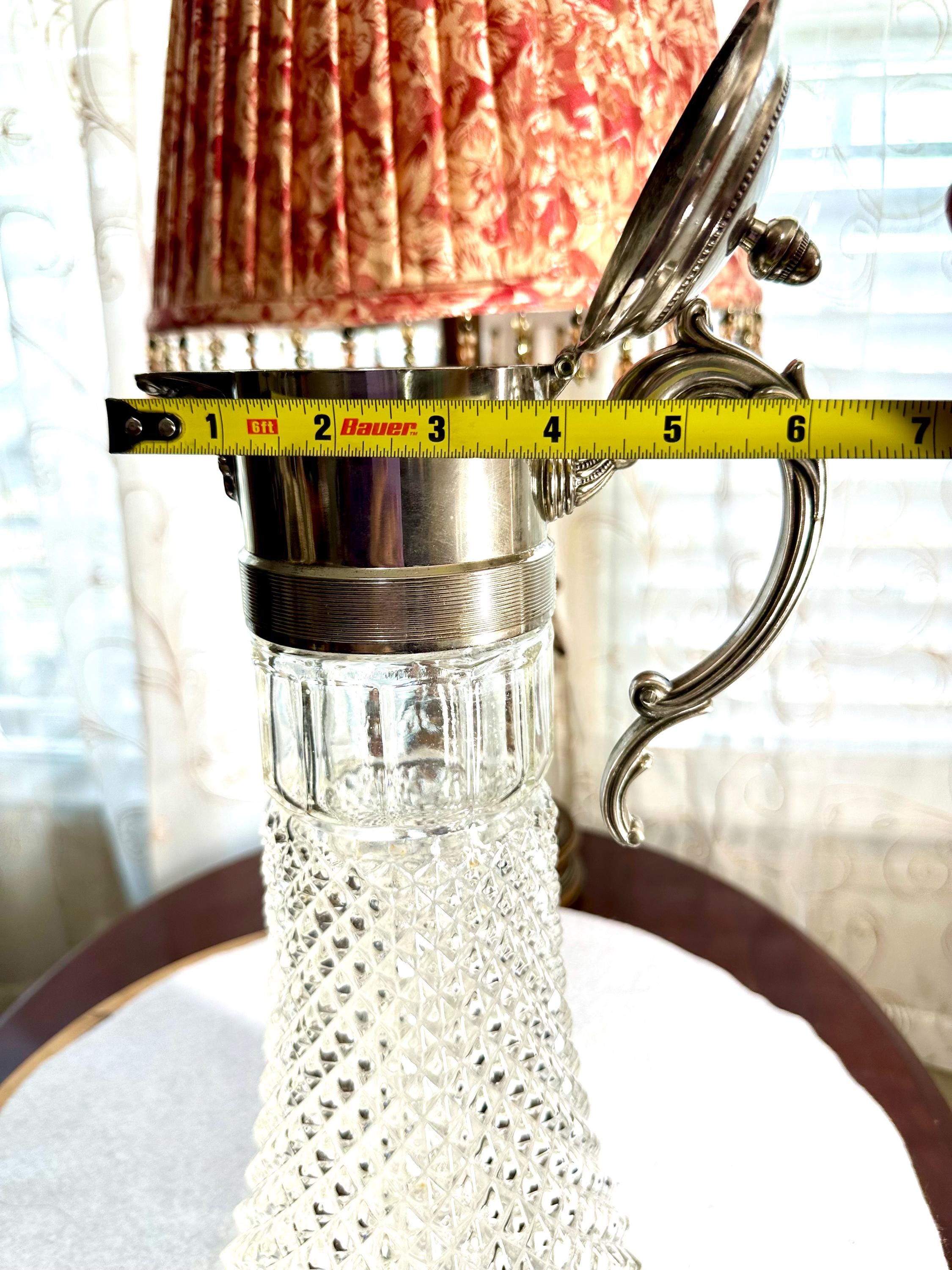 This is a Vintage Crystal Claret Jug with an ice insert. This is NOT in pristine condition. The lid will not unscrew, but the ice insert does come out easily and can be put back in without any effort. There is mild patina on the silver that can be easily buffed out if you would like to do that. There is also tarnish on the inside of the ice lid. I left it in this condition since I know that some people prefer it to have a "vintage" look. There are a few stains on the interior of the glass, but that is only because I could not find a brush long enough to clean the bottom. There are natural bubbles in the glass. Pictures are included. This stands at 14 inches tall, 5 inches wide at the bottom, and 7 inches wide from the handle to the spout. I recommend that this item be hand-washed and not put in the dishwasher, microwave, or on the stove top.