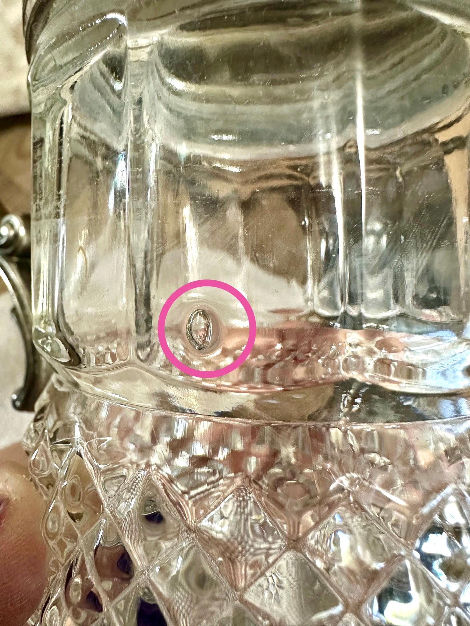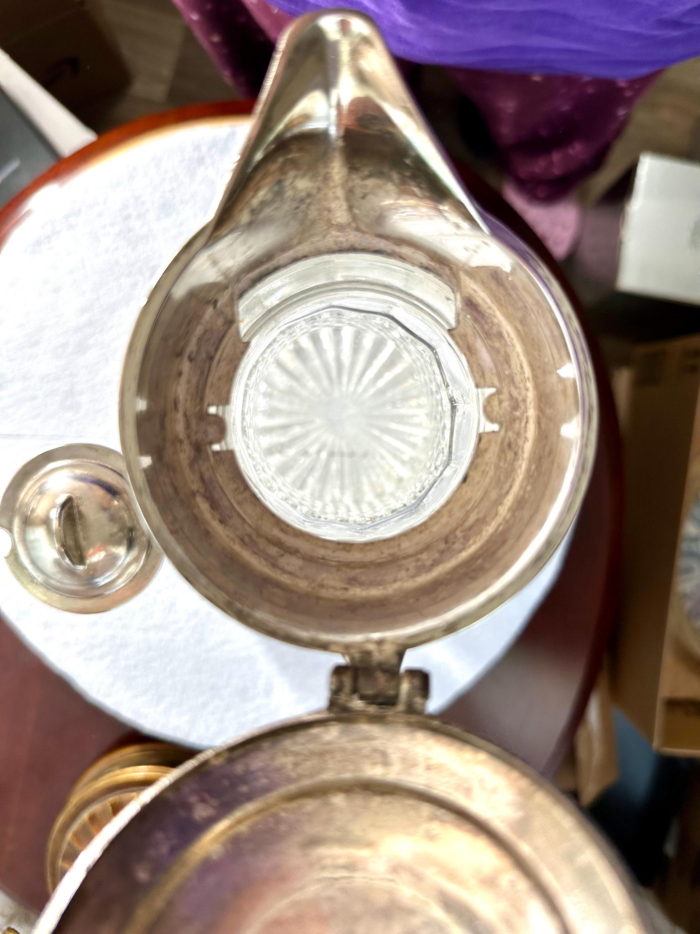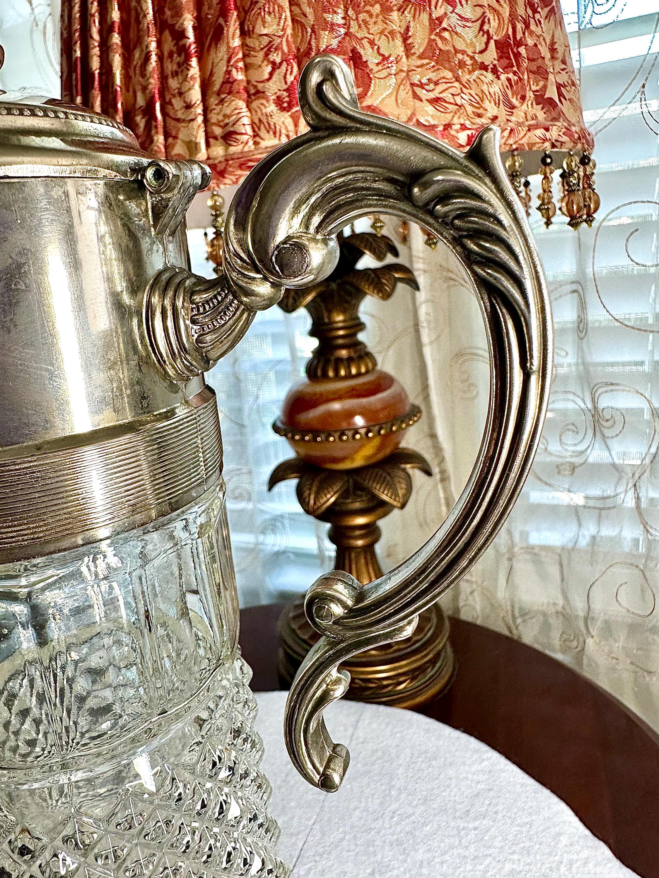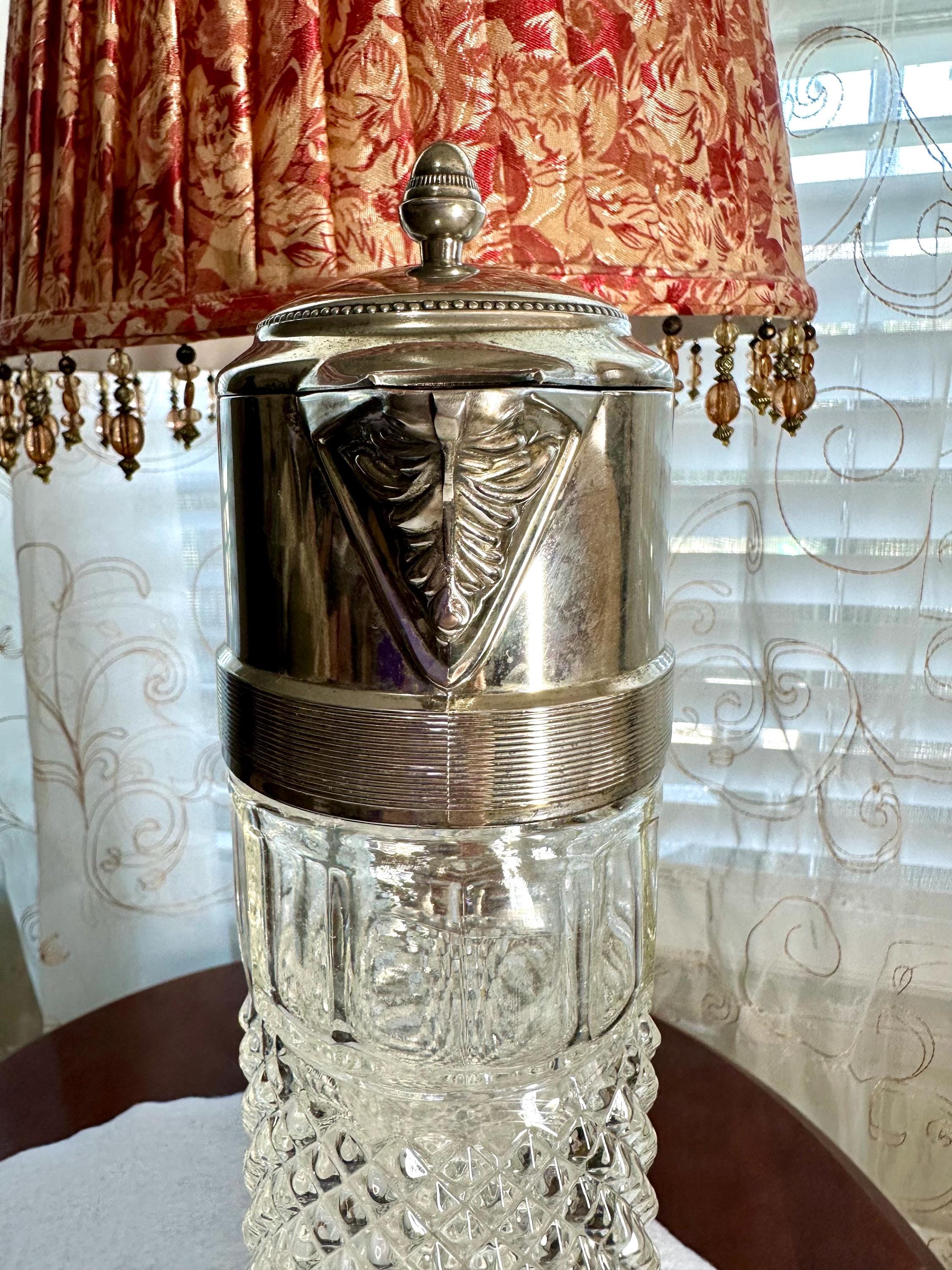 This is a Vintage Crystal Claret Jug with an ice insert. This is NOT in pristine condition. The lid will not unscrew, but the ice insert does come out easily and can be put back in without any effort. There is mild patina on the silver that can be easily buffed out if you would like to do that. There is also tarnish on the inside of the ice lid. I left it in this condition since I know that some people prefer it to have a "vintage" look. There are a few stains on the interior of the glass, but that is only because I could not find a brush long enough to clean the bottom. There are natural bubbles in the glass. Pictures are included. This stands at 14 inches tall, 5 inches wide at the bottom, and 7 inches wide from the handle to the spout. I recommend that this item be hand-washed and not put in the dishwasher, microwave, or on the stove top.