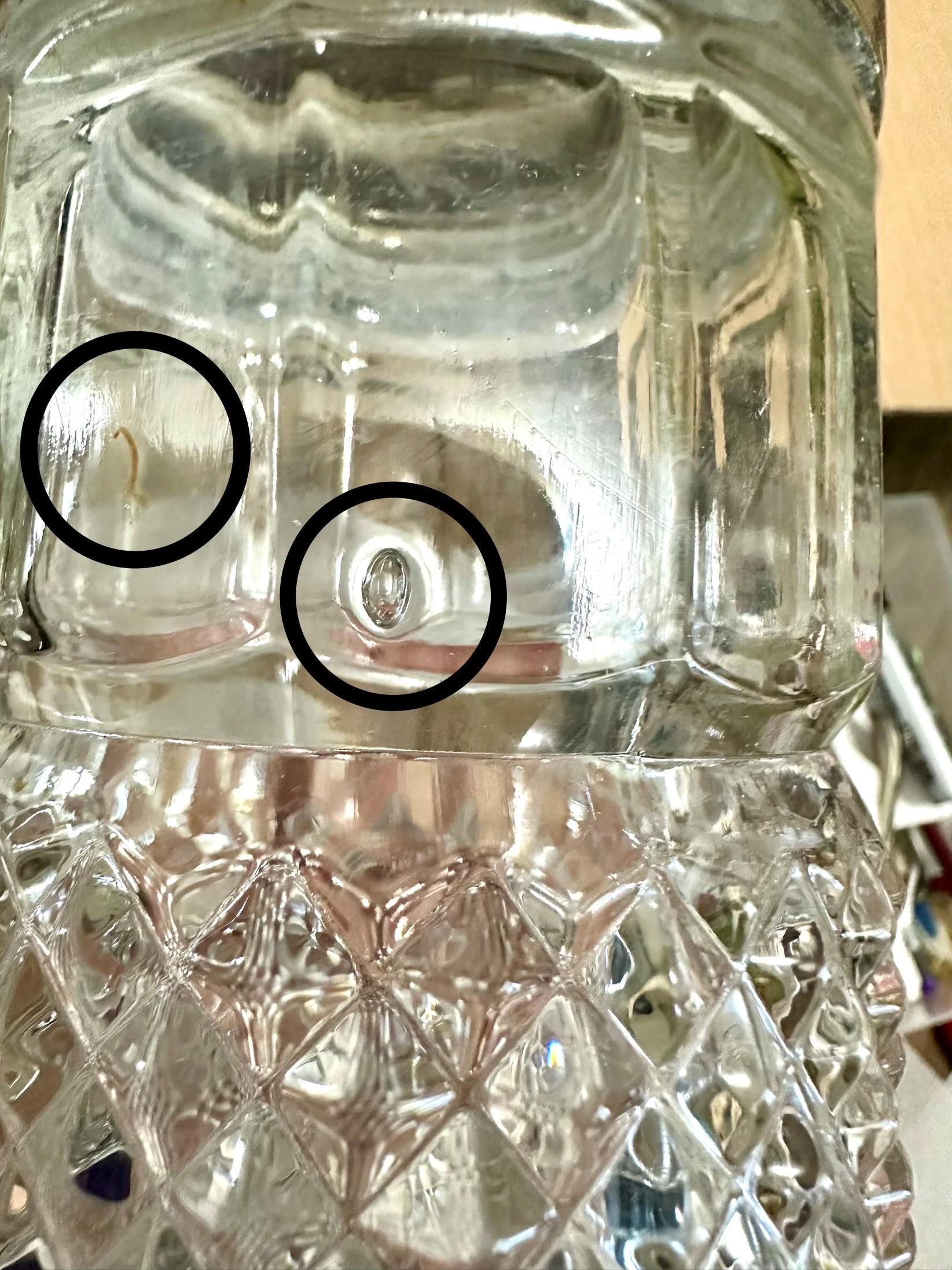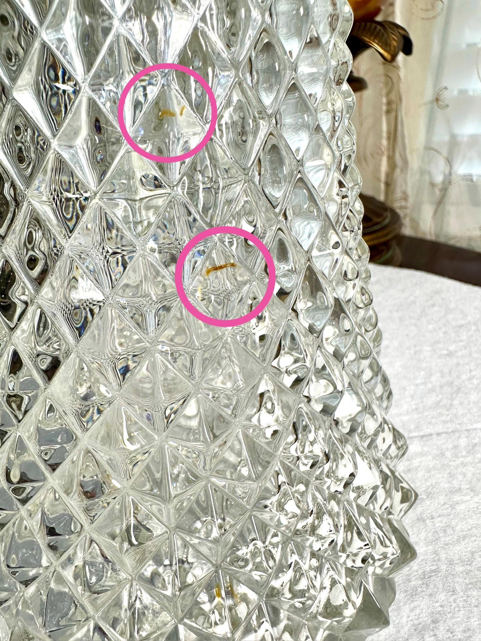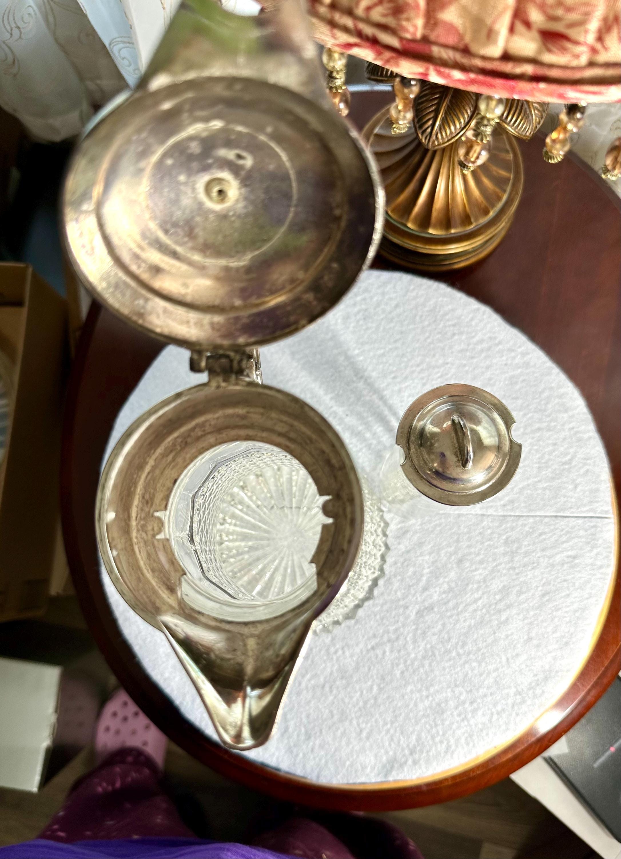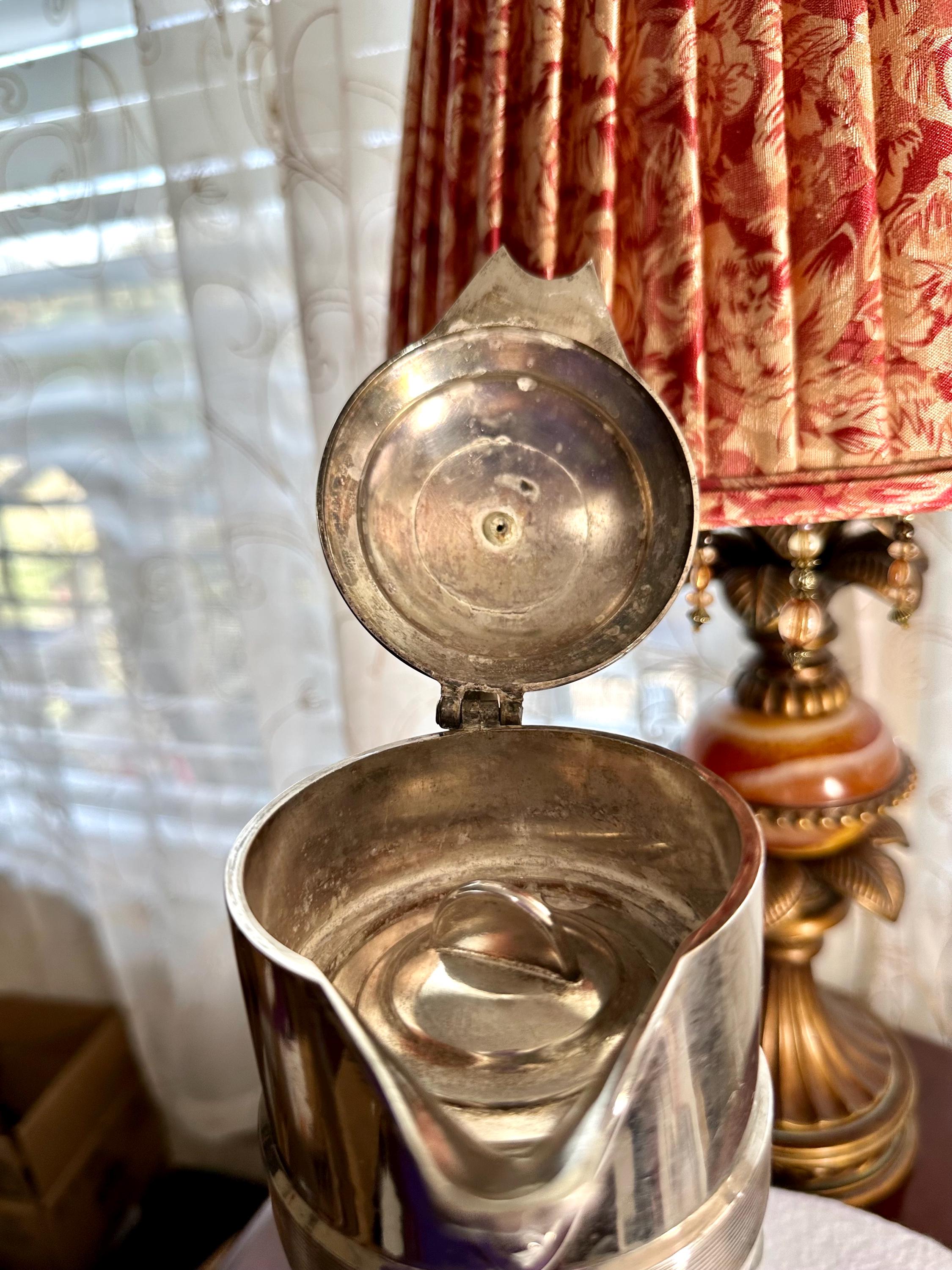 This is a Vintage Crystal Claret Jug with an ice insert. This is NOT in pristine condition. The lid will not unscrew, but the ice insert does come out easily and can be put back in without any effort. There is mild patina on the silver that can be easily buffed out if you would like to do that. There is also tarnish on the inside of the ice lid. I left it in this condition since I know that some people prefer it to have a "vintage" look. There are a few stains on the interior of the glass, but that is only because I could not find a brush long enough to clean the bottom. There are natural bubbles in the glass. Pictures are included. This stands at 14 inches tall, 5 inches wide at the bottom, and 7 inches wide from the handle to the spout. I recommend that this item be hand-washed and not put in the dishwasher, microwave, or on the stove top.