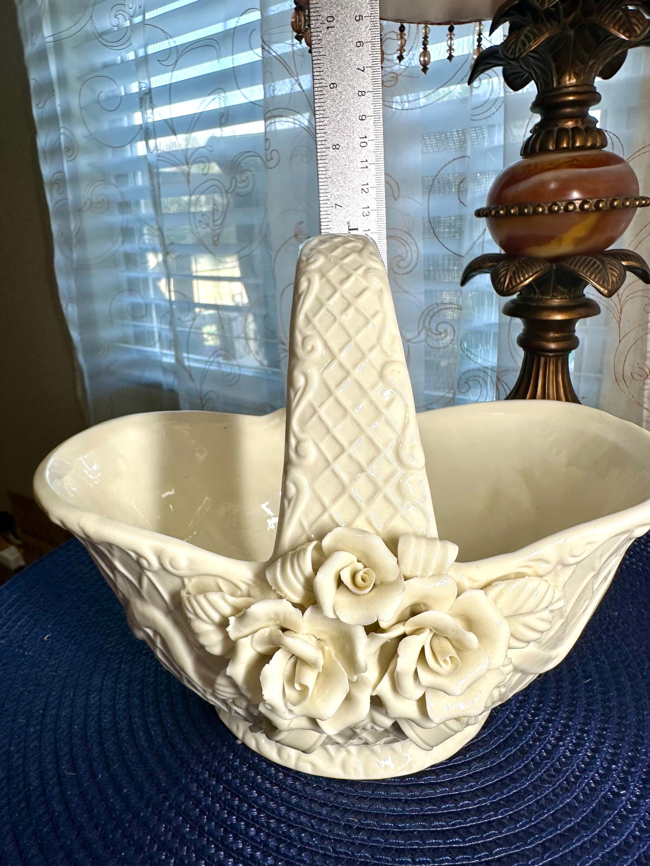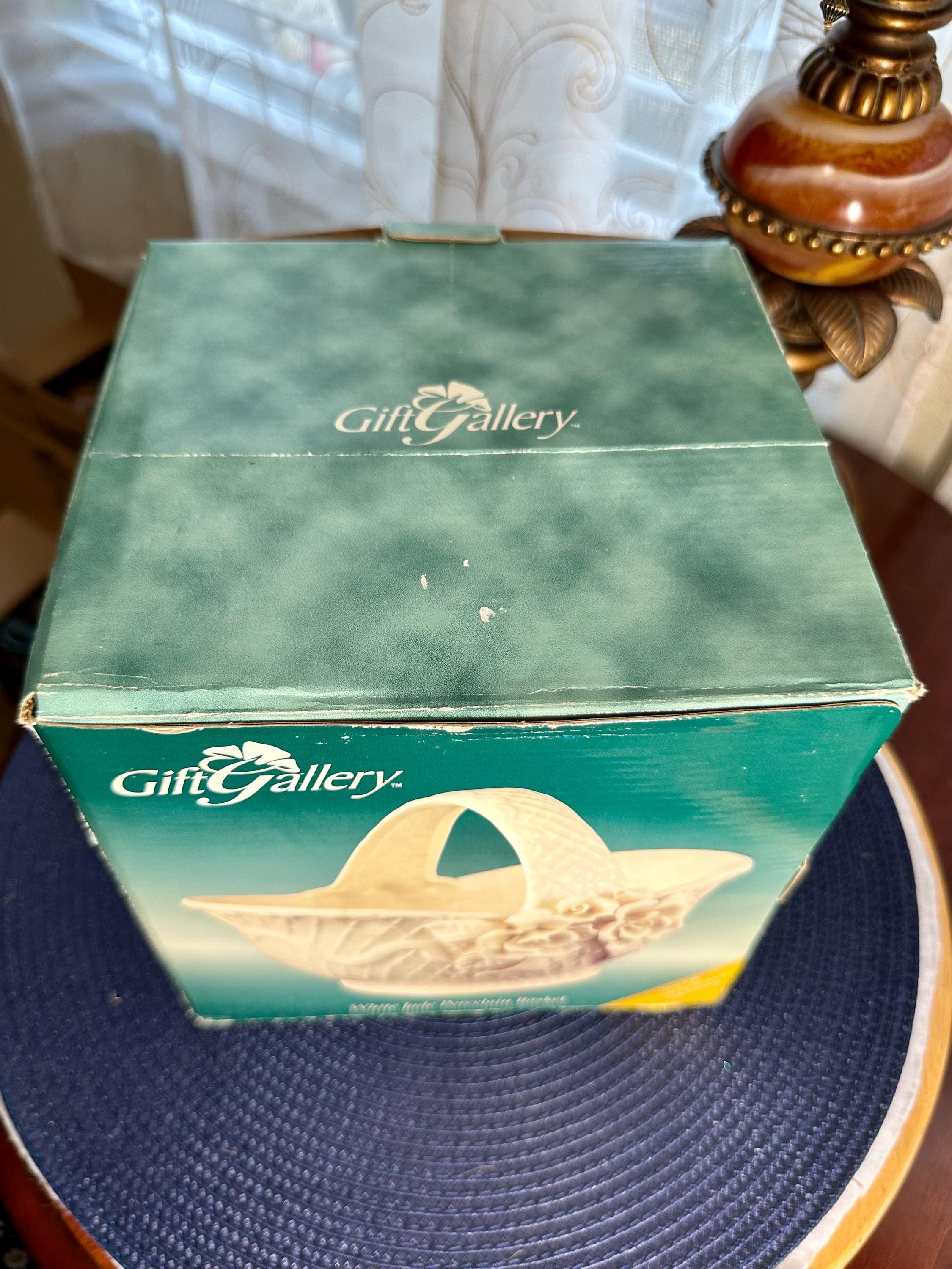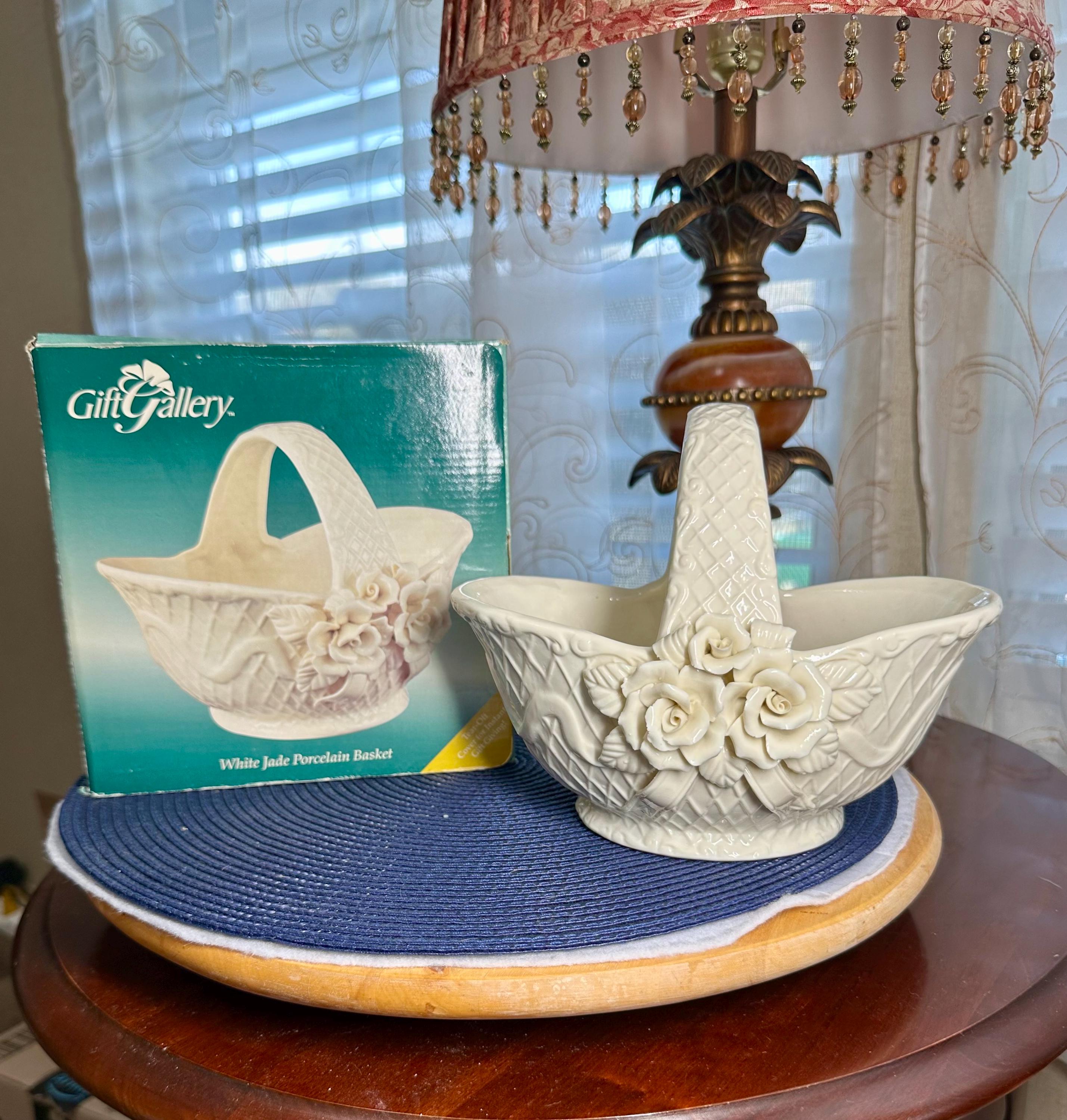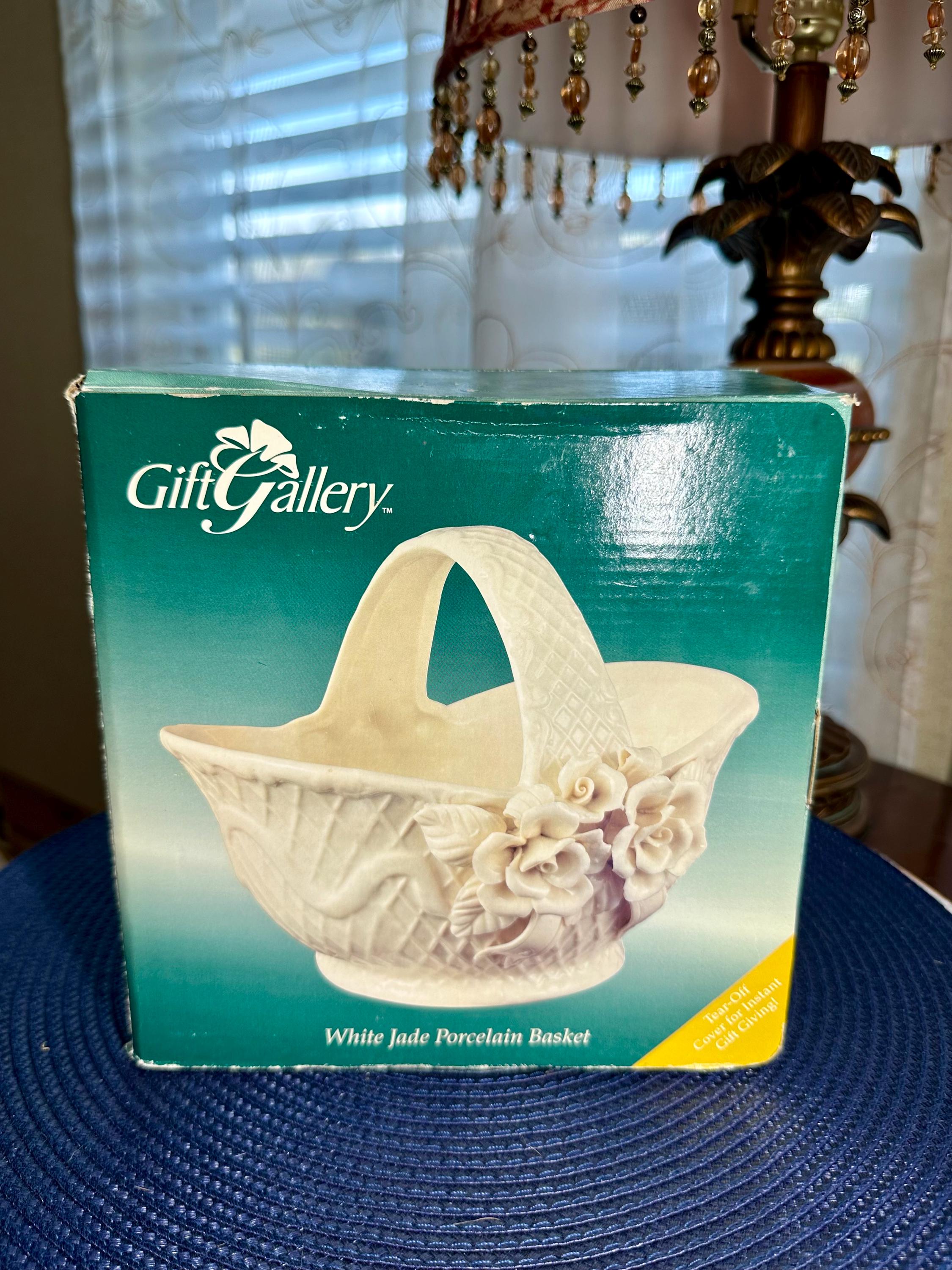 This is a vintage 1980s Gift Gallery White Jade Porcelain Basket. This comes in the original box; the box does have some slight creases. There are no chips or cracks in the porcelain basket. It can be decorated for any season. This is 6 1/2 inches tall and 8 1/2 inches wide.