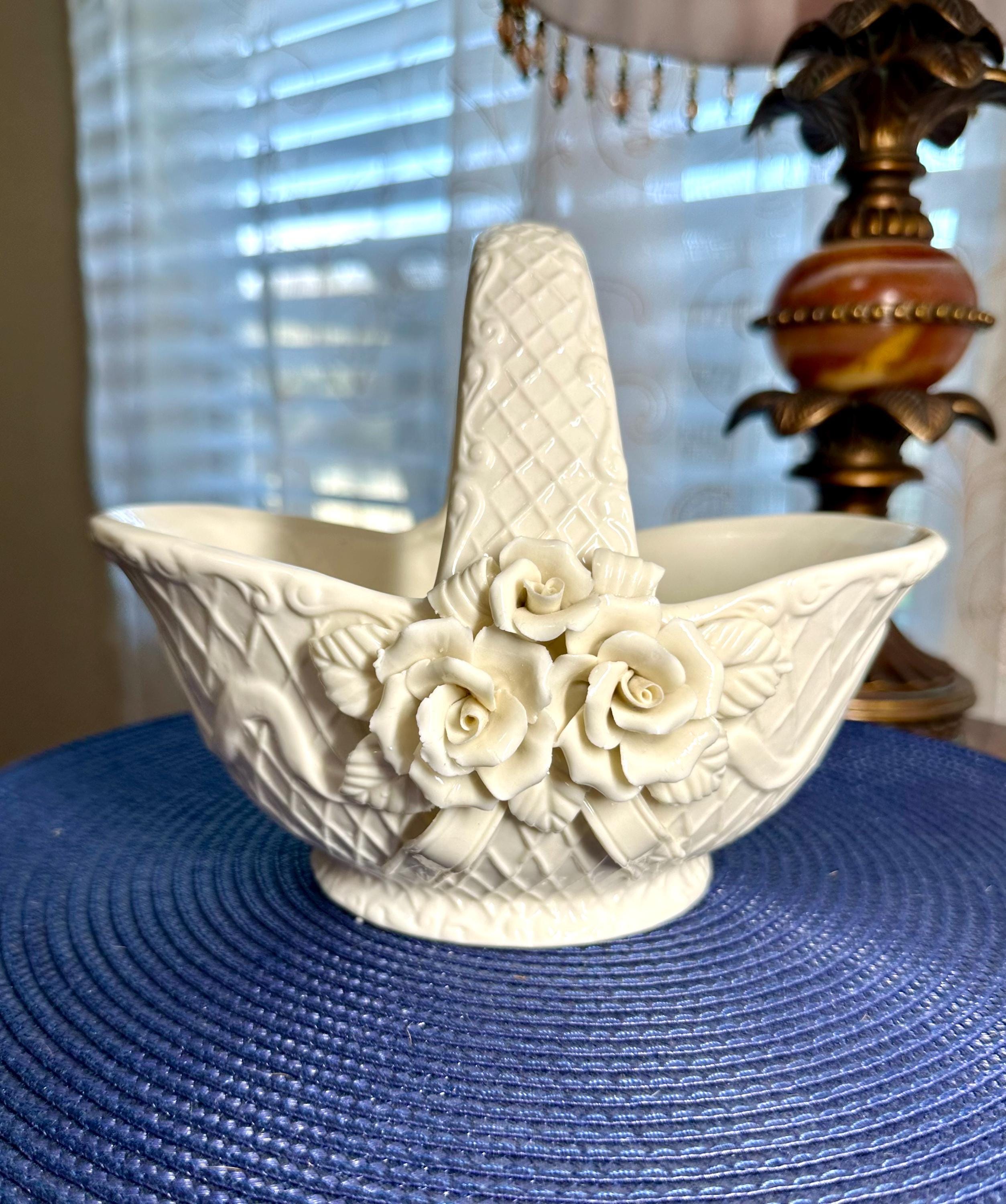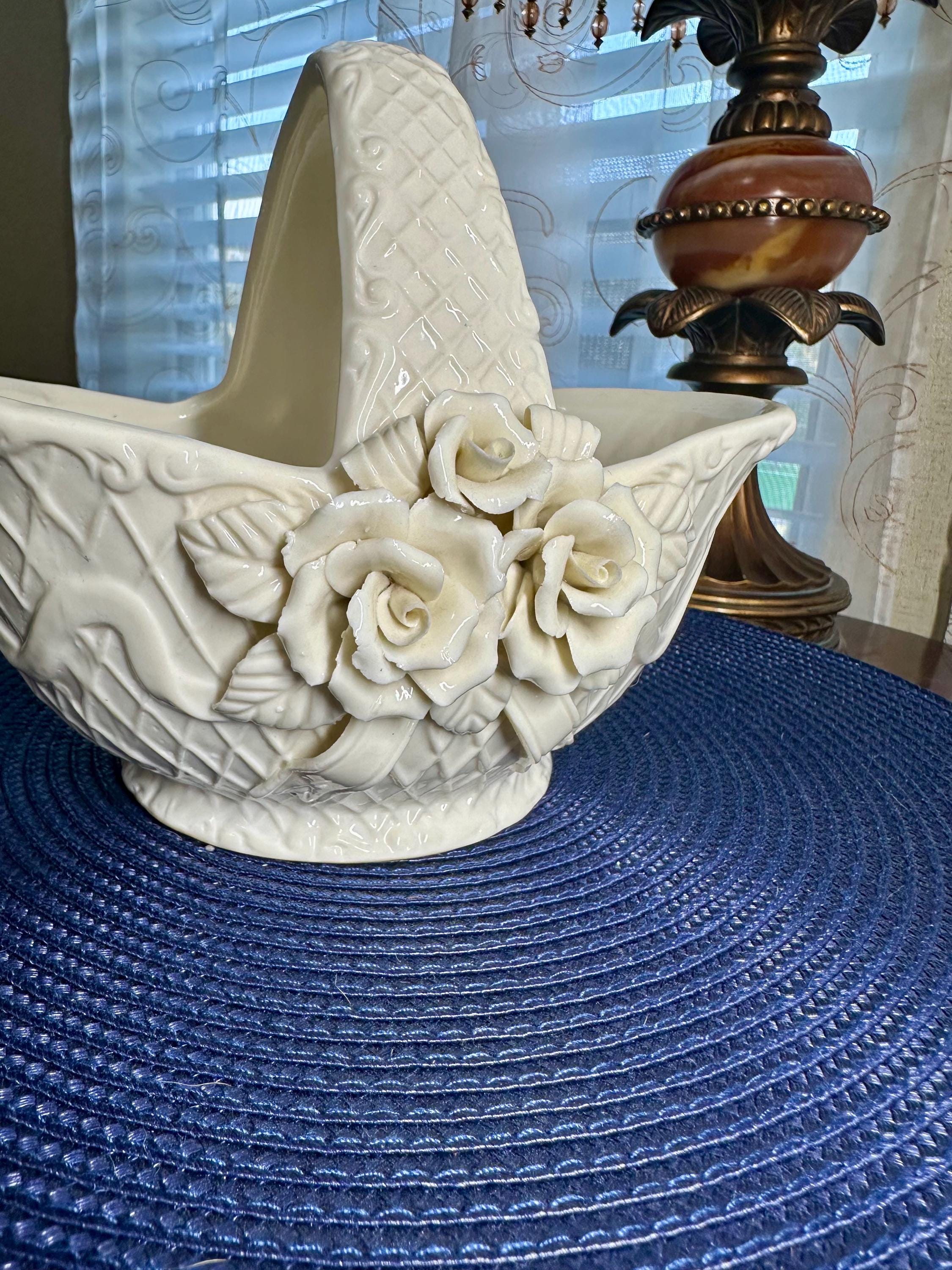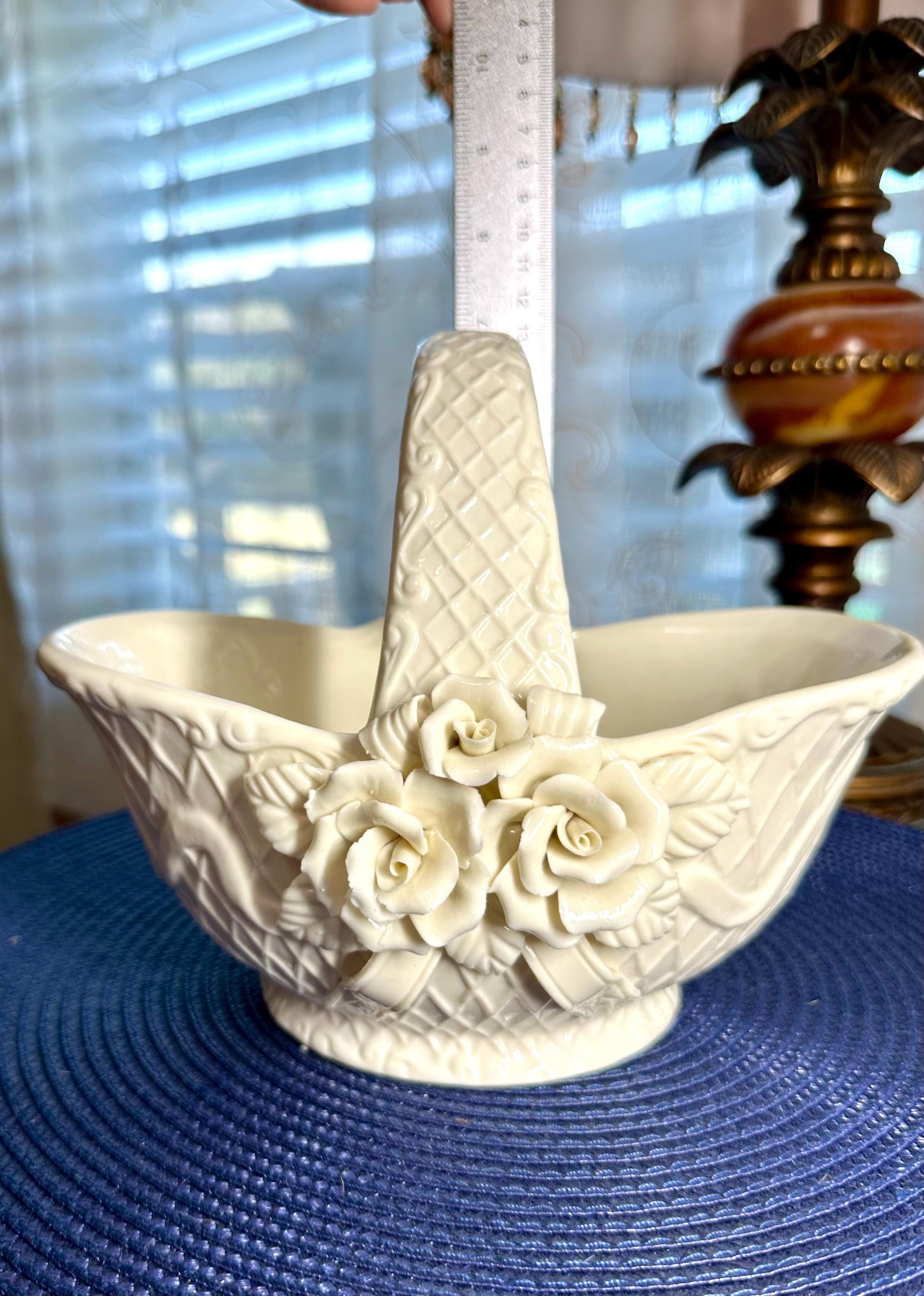 This is a vintage 1980s Gift Gallery White Jade Porcelain Basket. This comes in the original box; the box does have some slight creases. There are no chips or cracks in the porcelain basket. It can be decorated for any season. This is 6 1/2 inches tall and 8 1/2 inches wide.