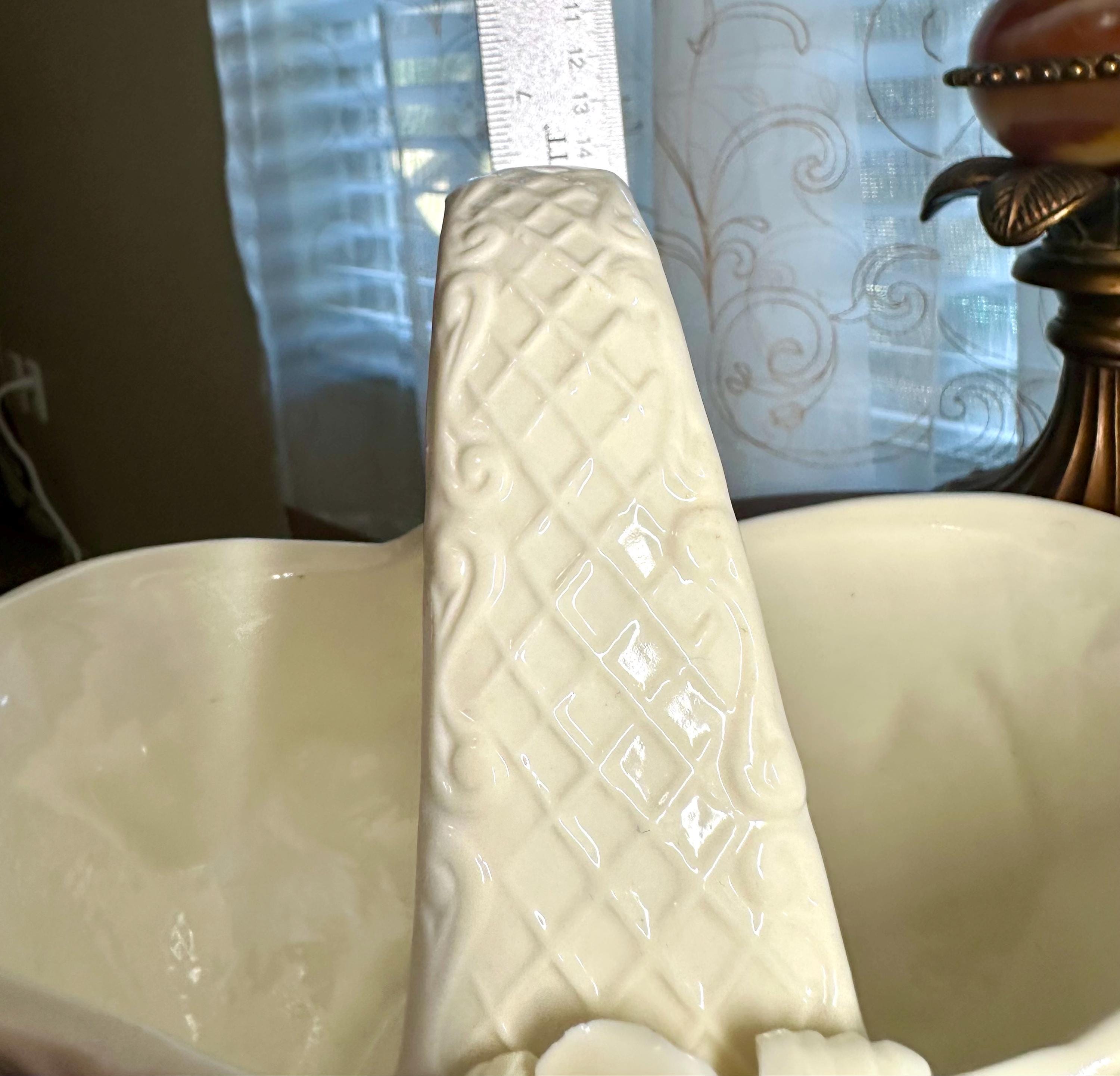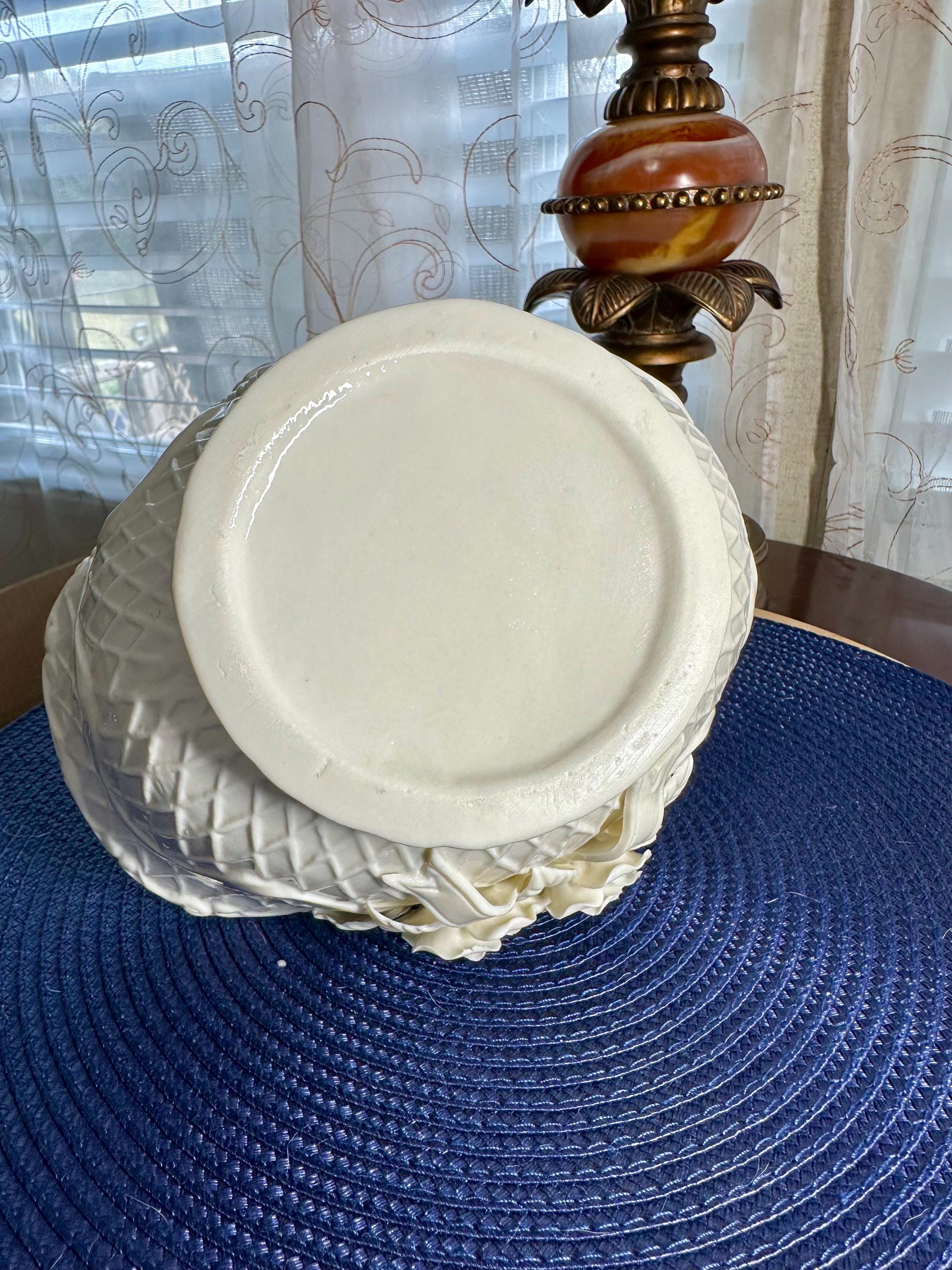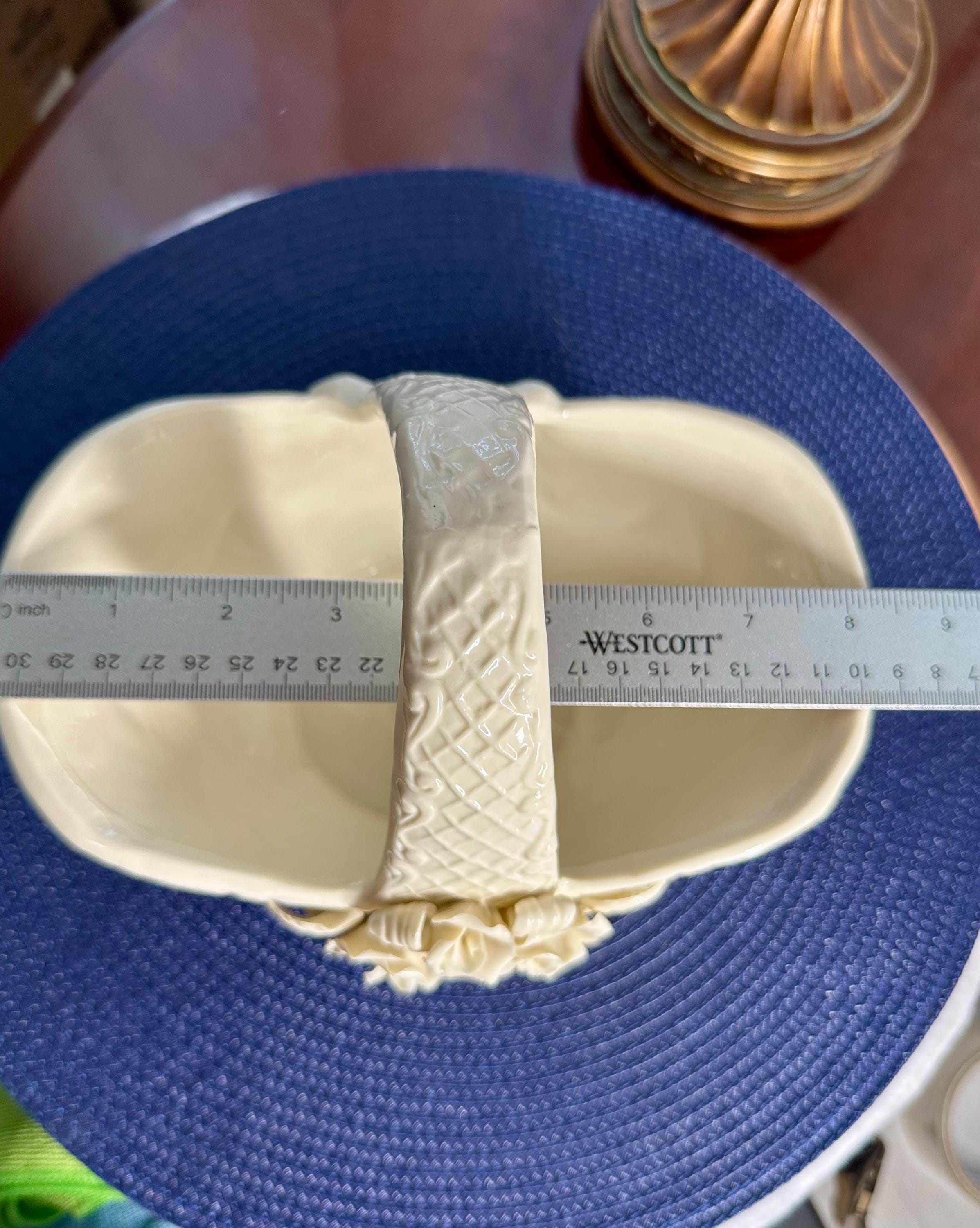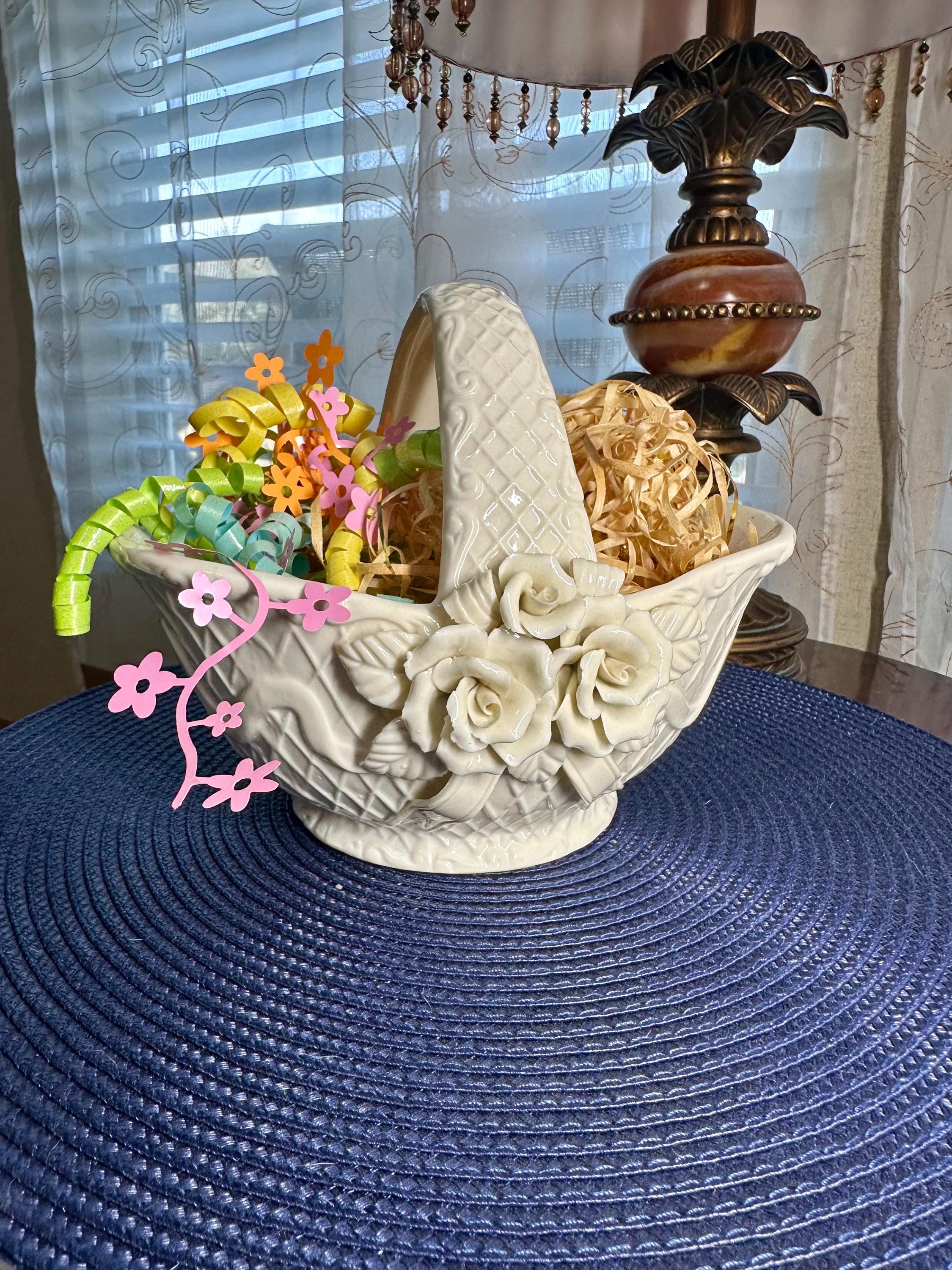 This is a vintage 1980s Gift Gallery White Jade Porcelain Basket. This comes in the original box; the box does have some slight creases. There are no chips or cracks in the porcelain basket. It can be decorated for any season. This is 6 1/2 inches tall and 8 1/2 inches wide.