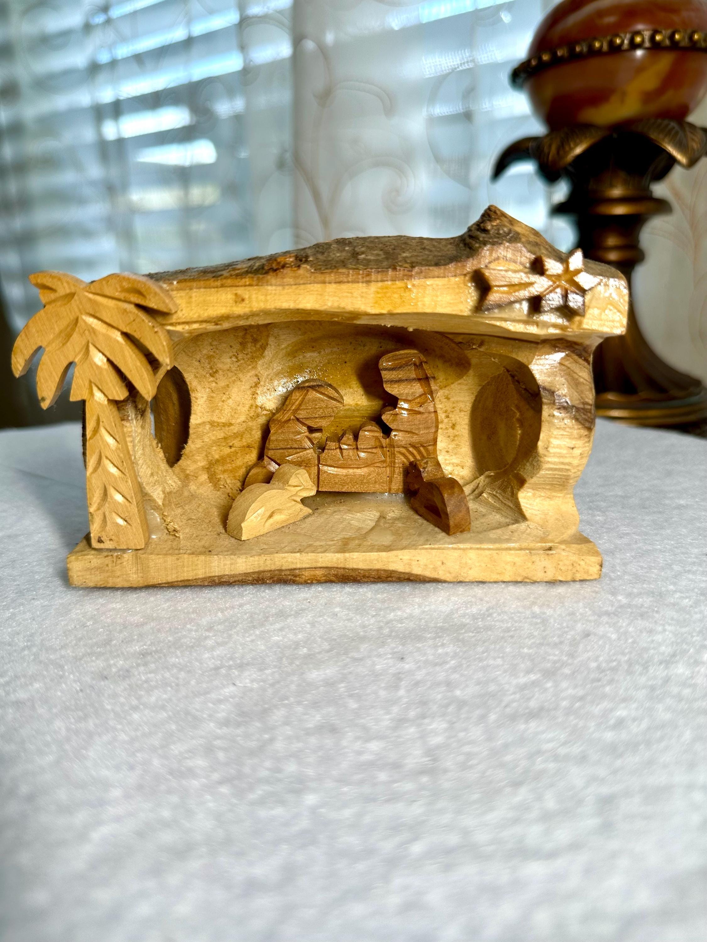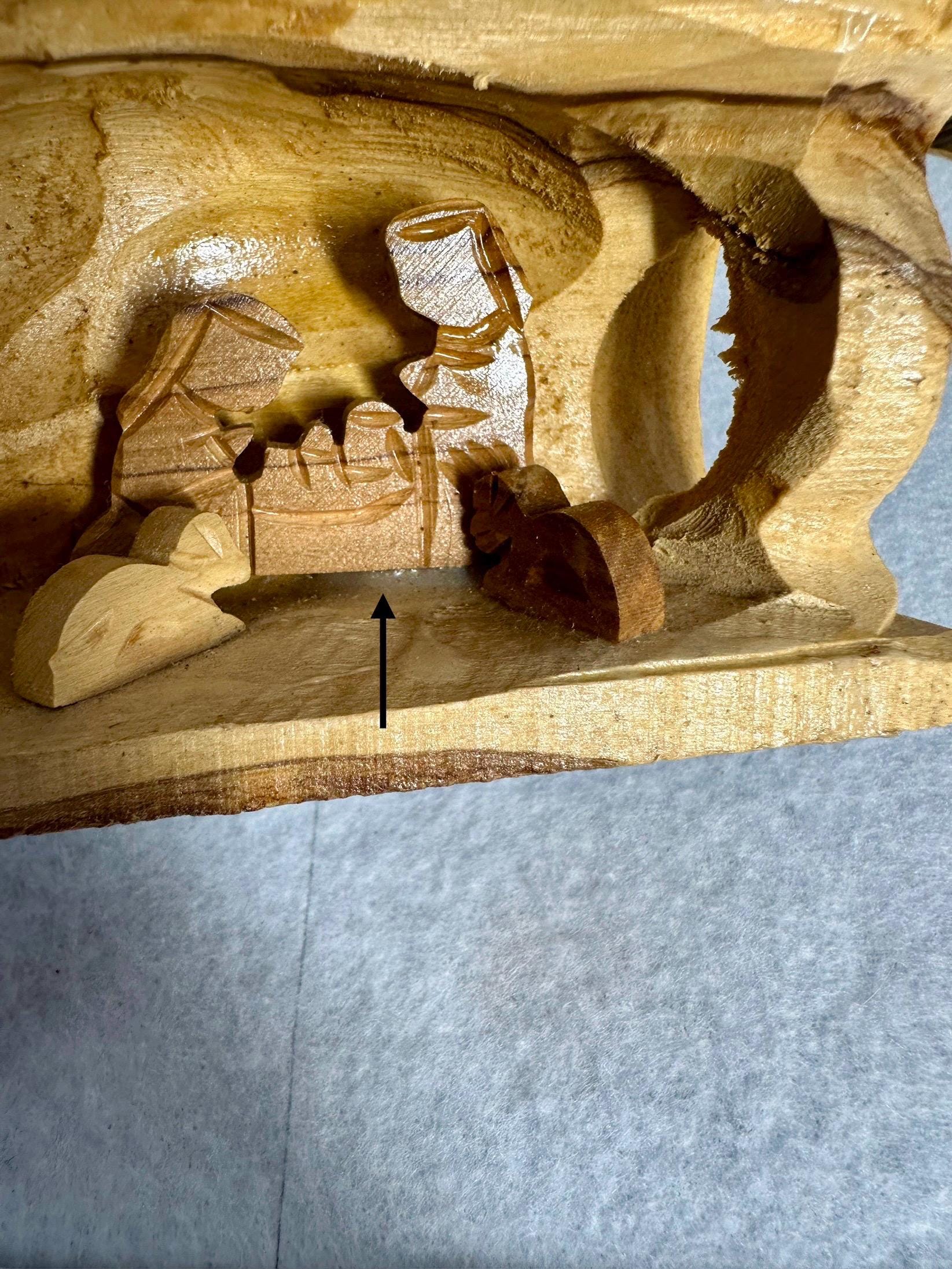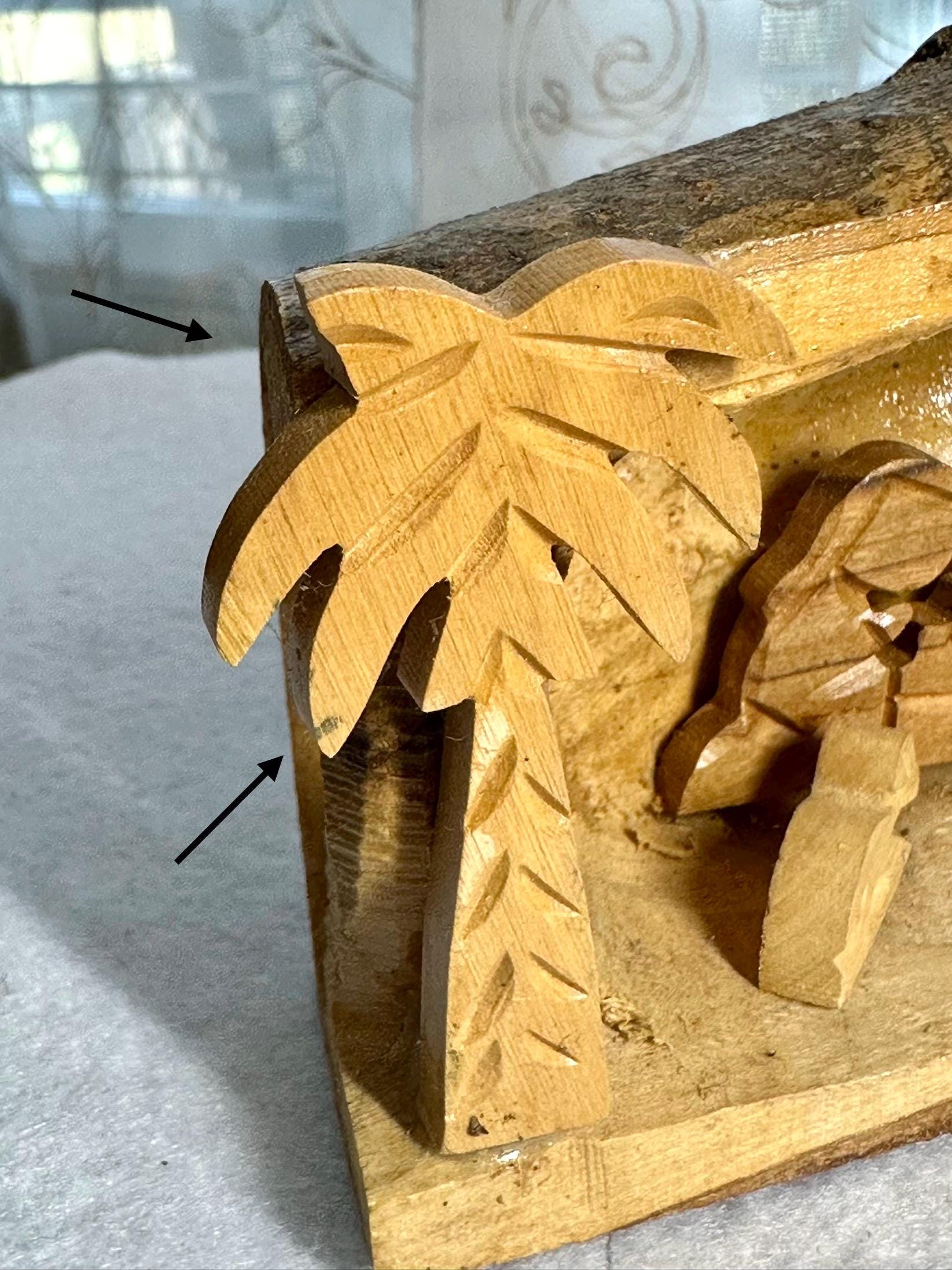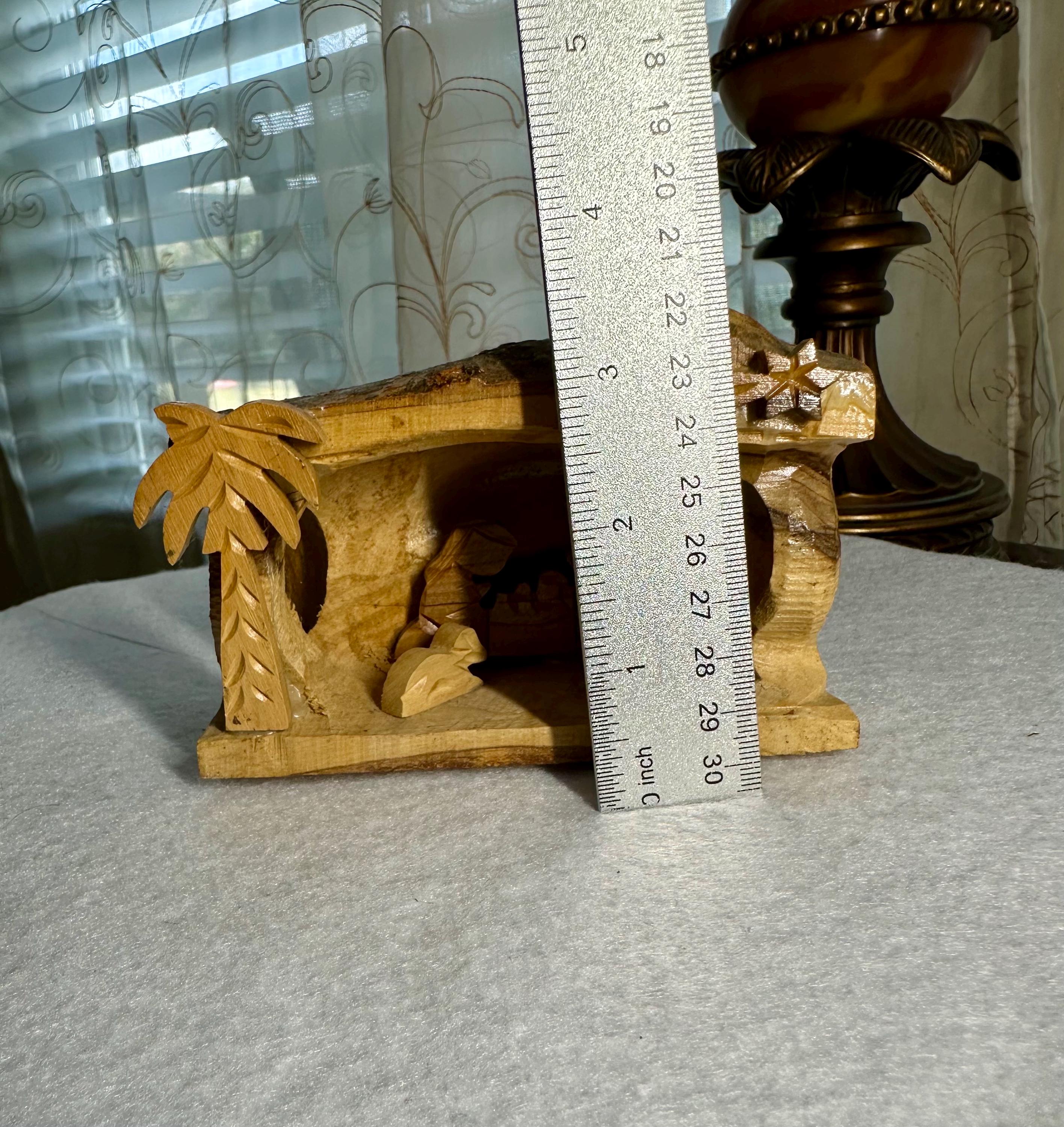 This is a unique hand-carved nativity scene in a piece of wood. This is partially glazed, and you can see the raw wood. This is 3 1/2 inches tall, 5 inches long, and 2 1/4 inches wide. You can see the glue under Joseph and the cradle. There is part of the palm tree branch that is missing. It can be corrected easily by sanding that area down.
