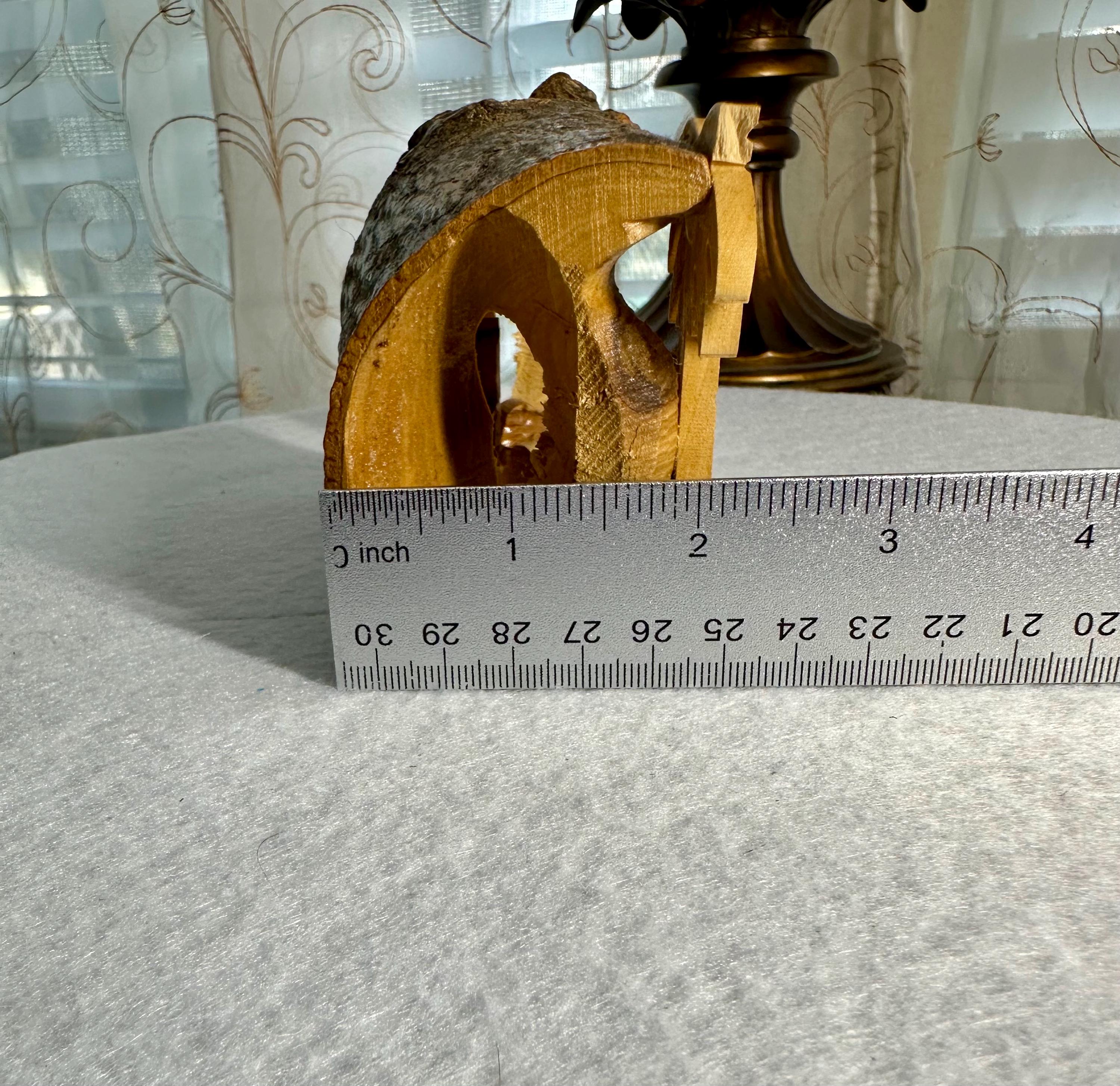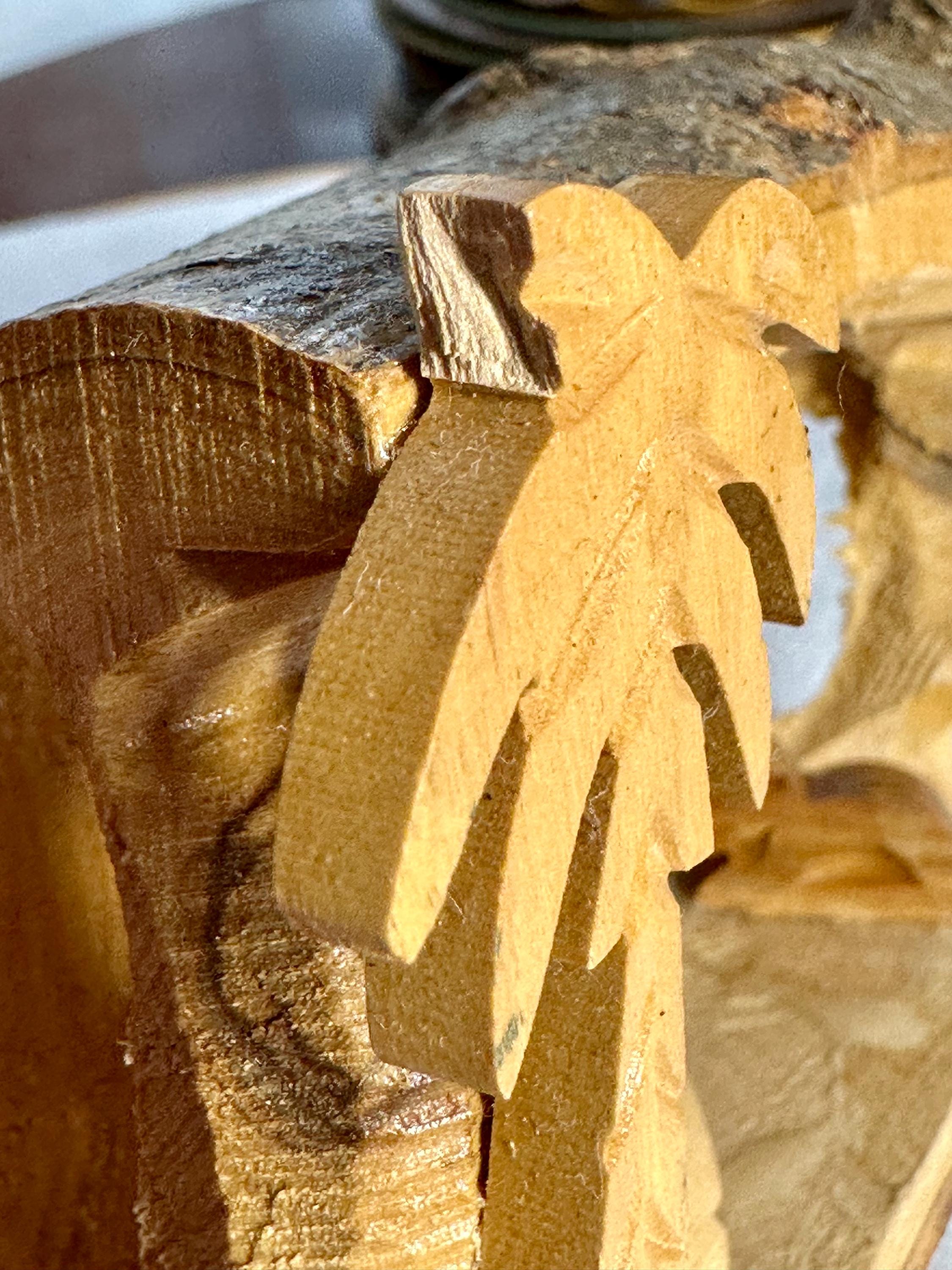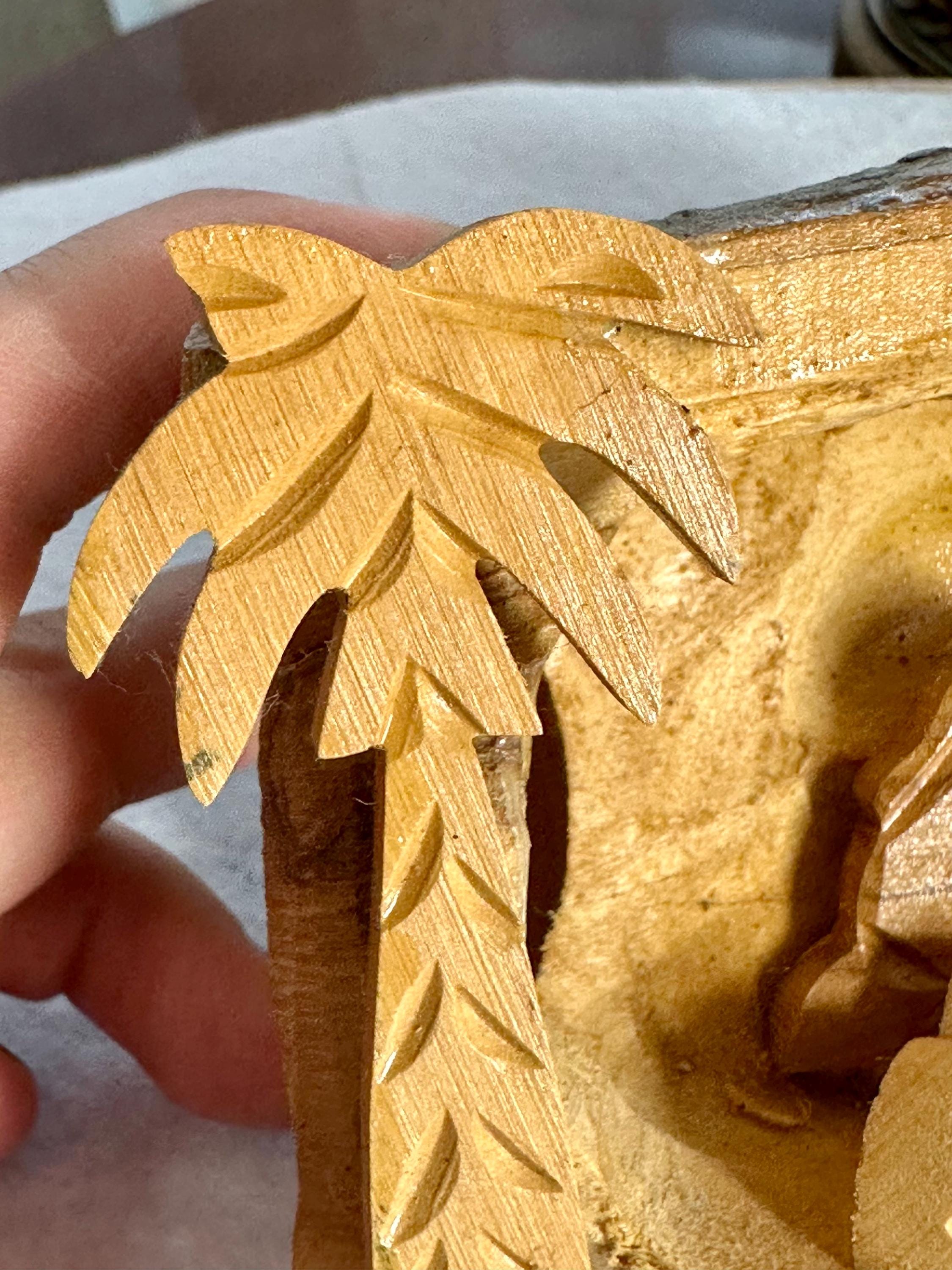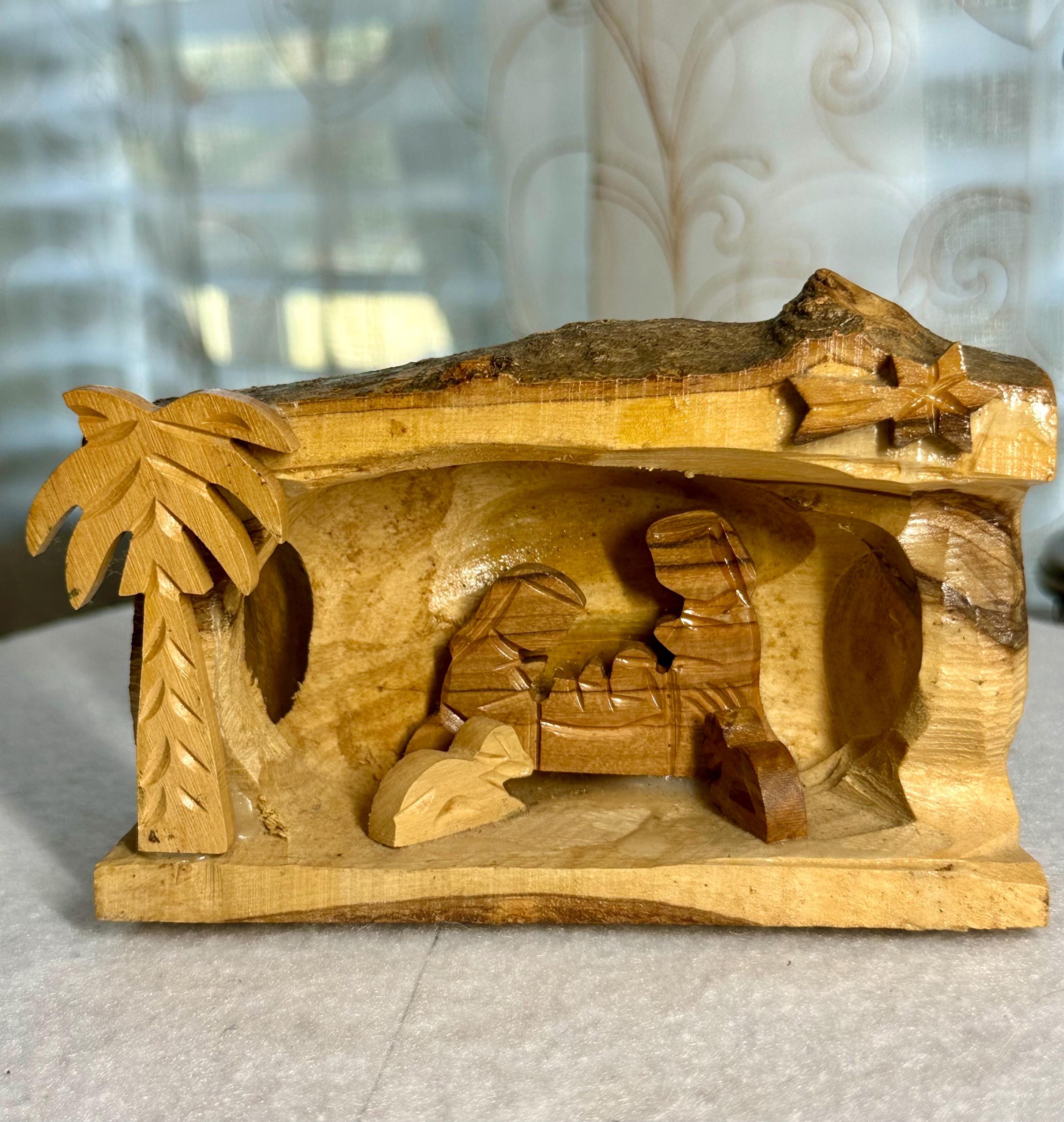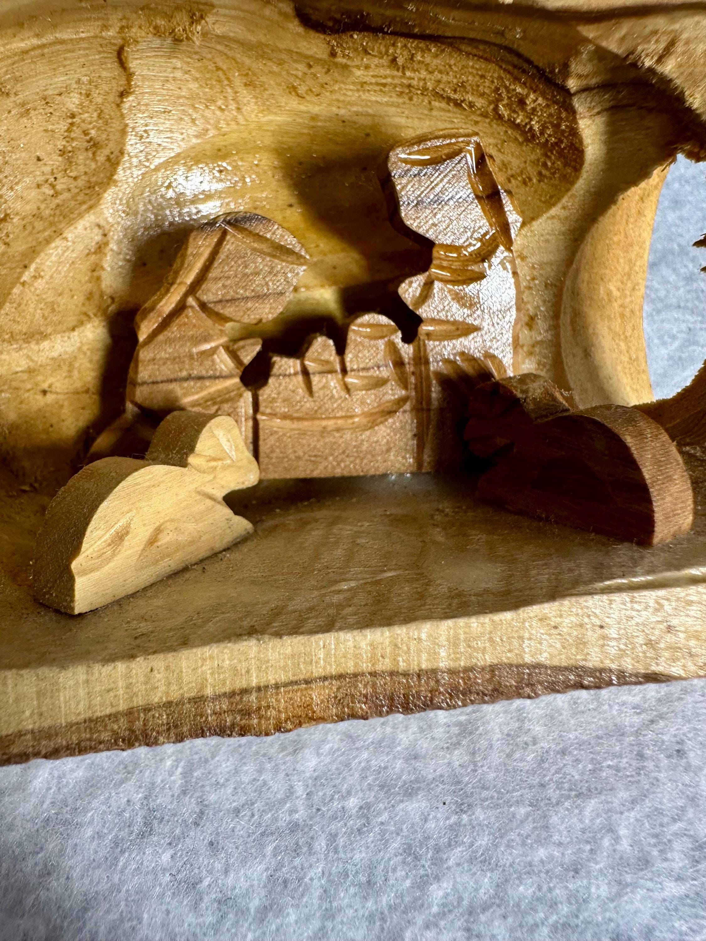 This is a unique hand-carved nativity scene in a piece of wood. This is partially glazed, and you can see the raw wood. This is 3 1/2 inches tall, 5 inches long, and 2 1/4 inches wide. You can see the glue under Joseph and the cradle. There is part of the palm tree branch that is missing. It can be corrected easily by sanding that area down.