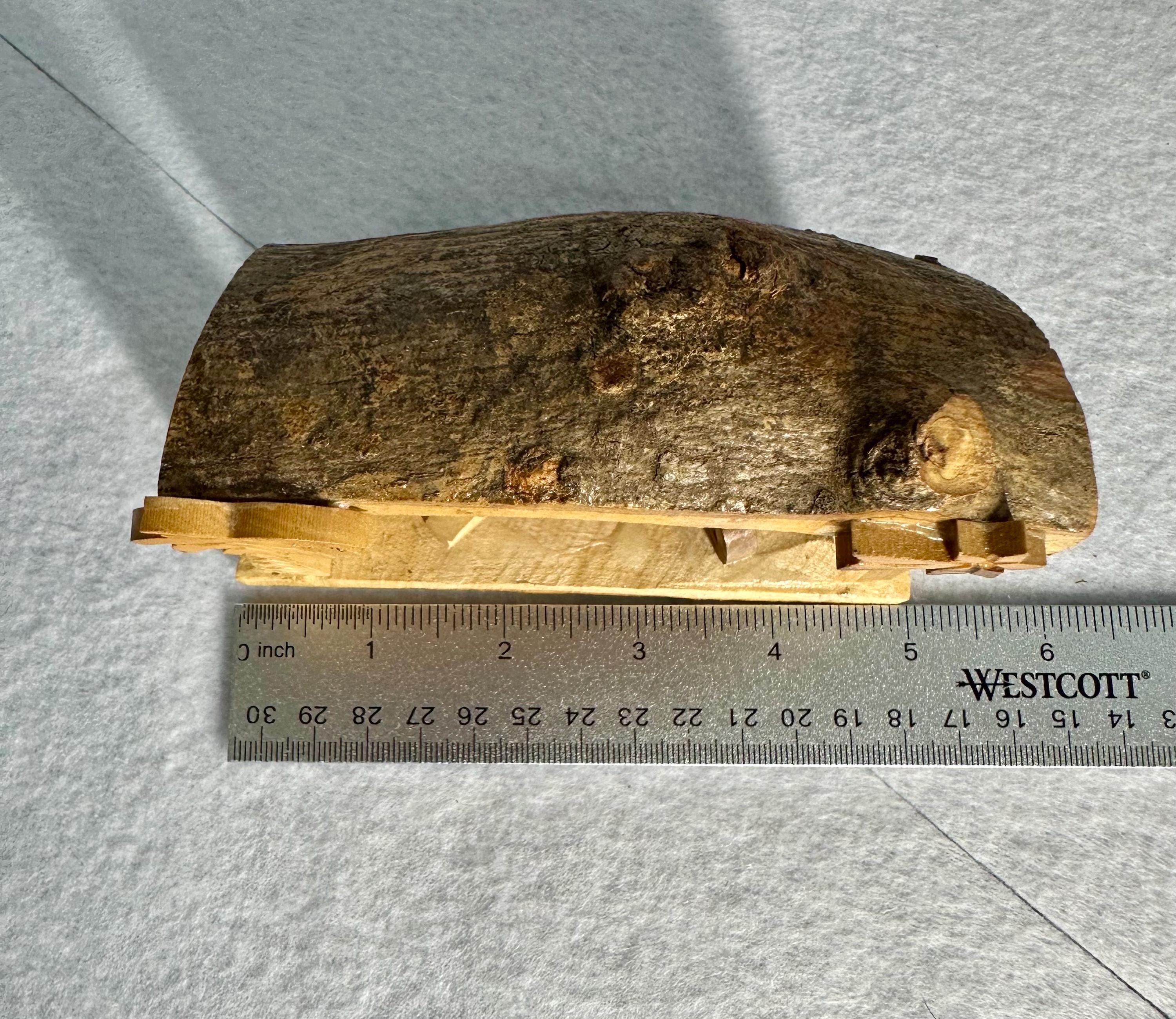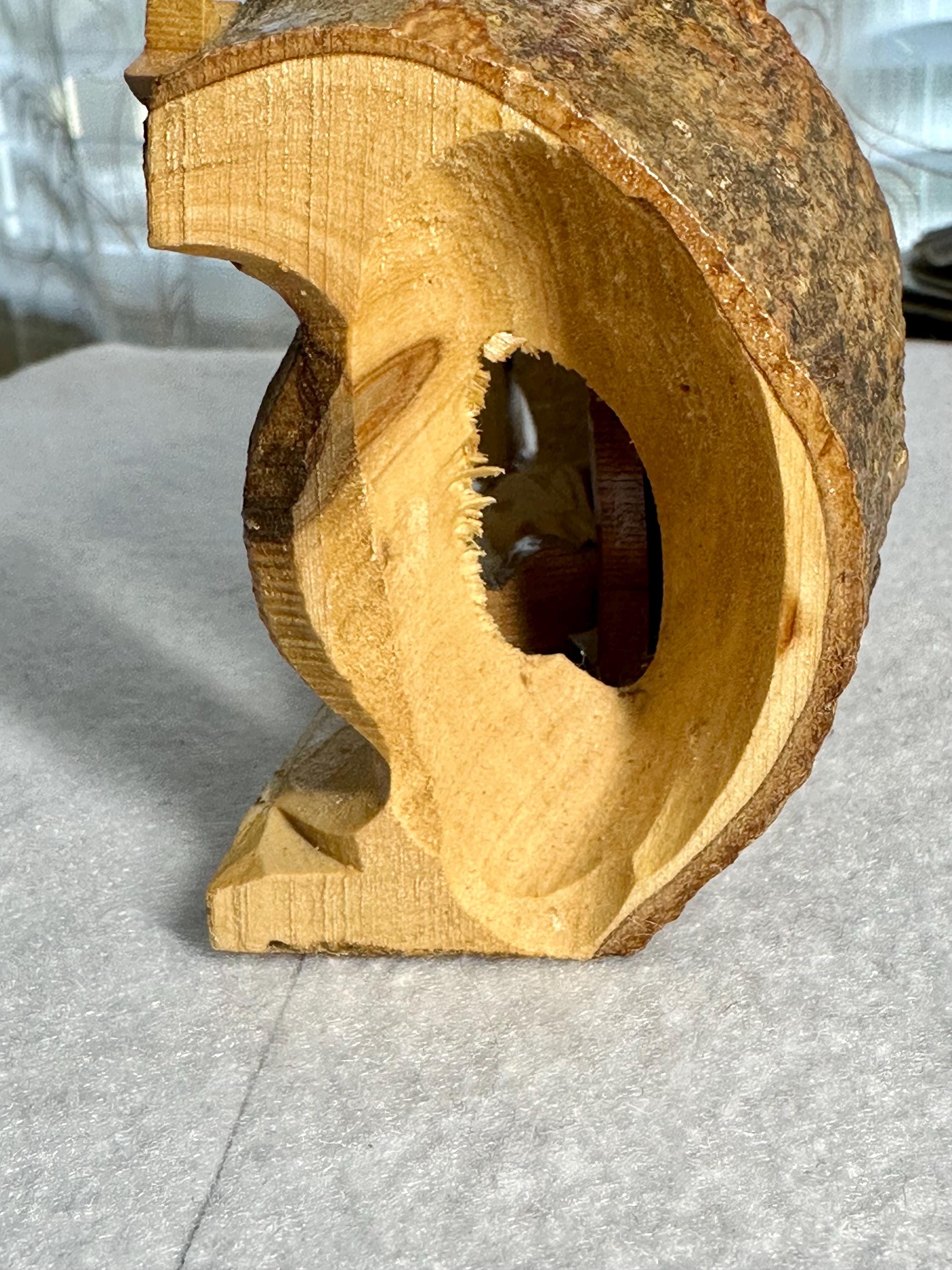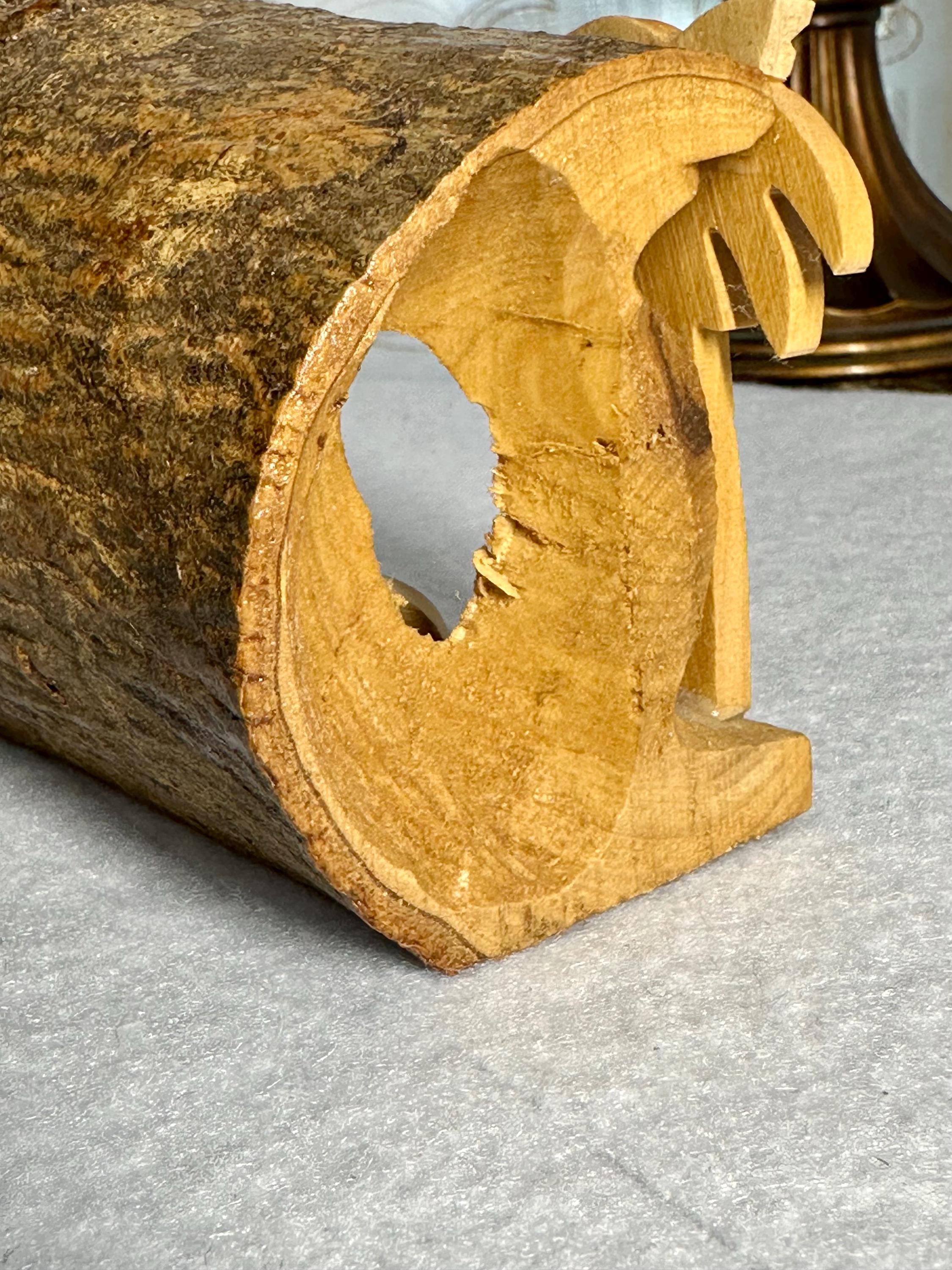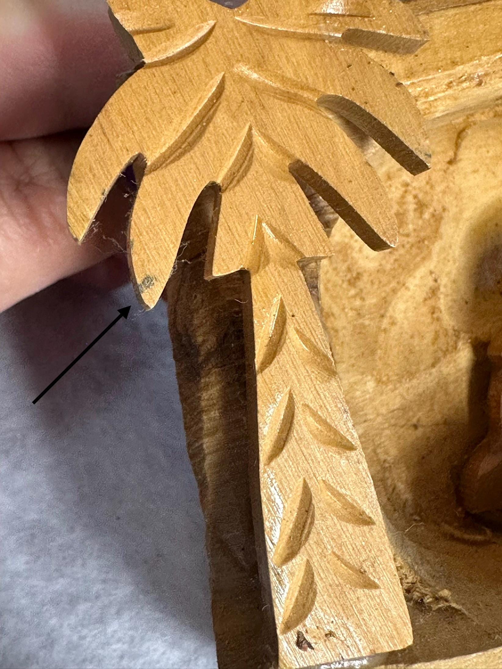 This is a unique hand-carved nativity scene in a piece of wood. This is partially glazed, and you can see the raw wood. This is 3 1/2 inches tall, 5 inches long, and 2 1/4 inches wide. You can see the glue under Joseph and the cradle. There is part of the palm tree branch that is missing. It can be corrected easily by sanding that area down.