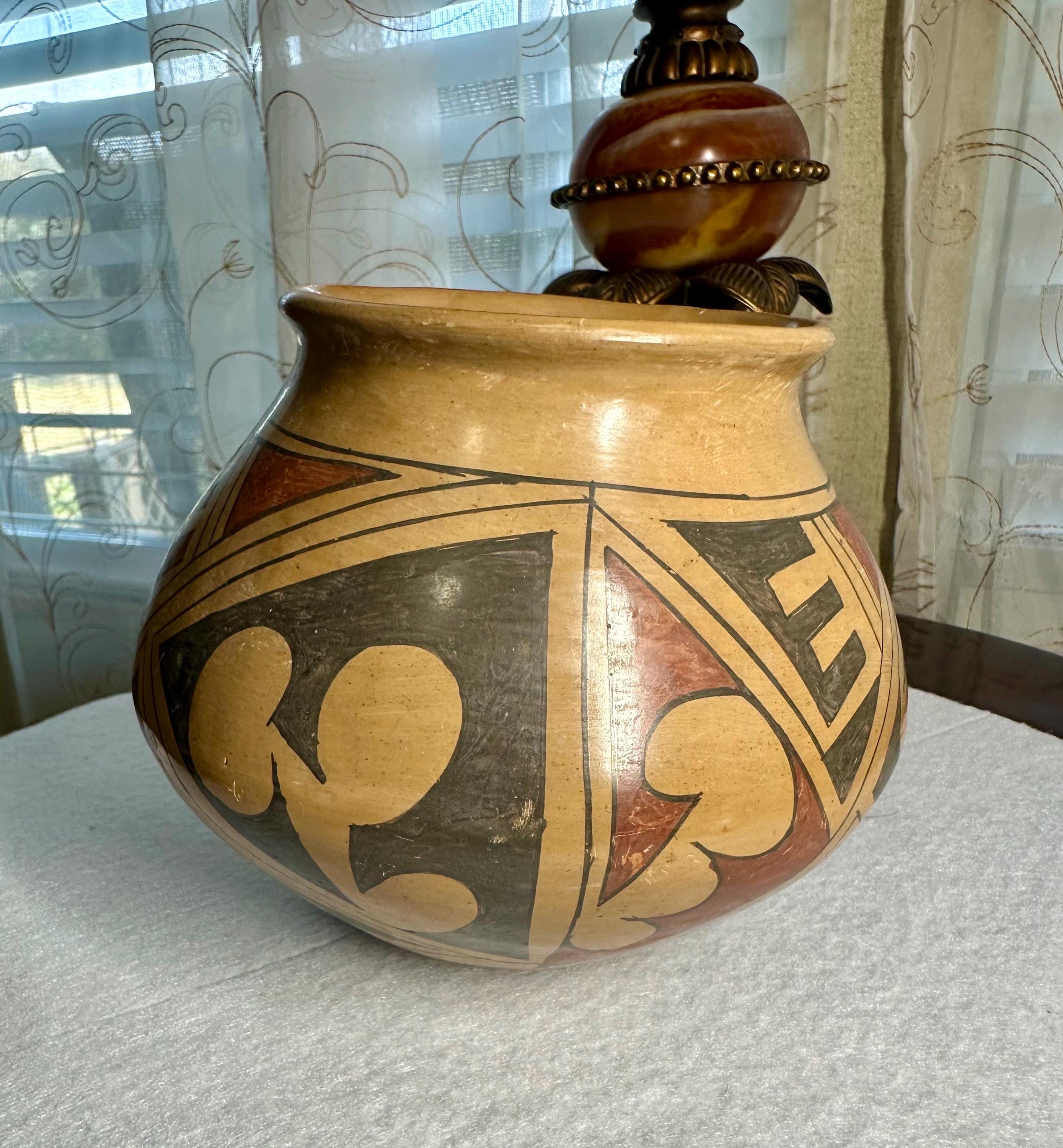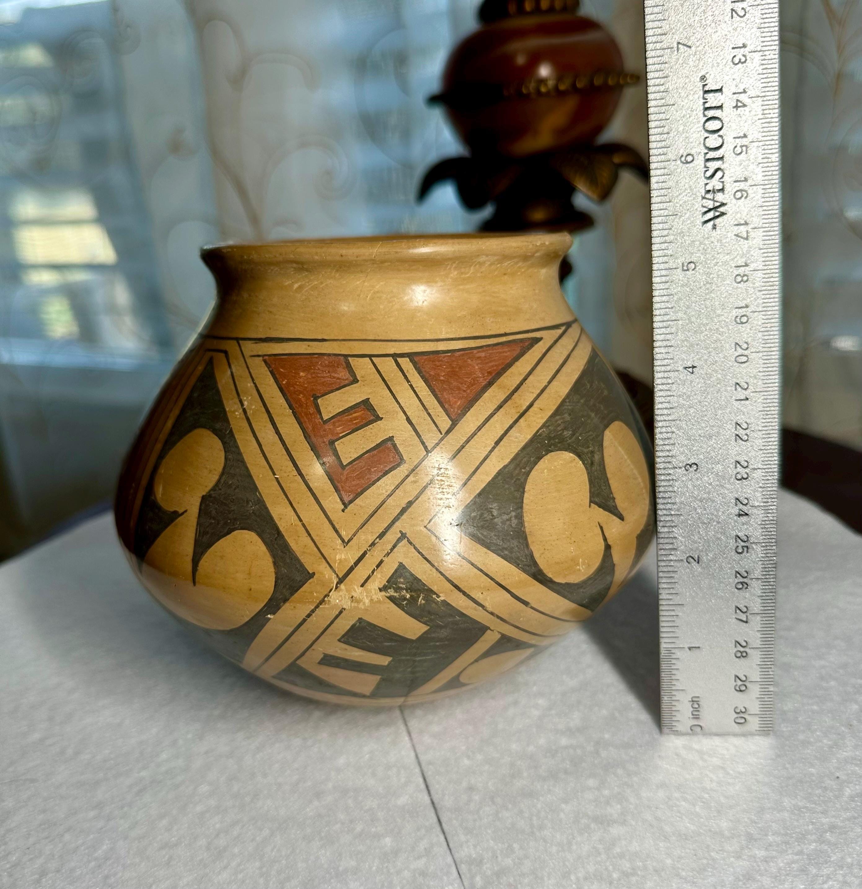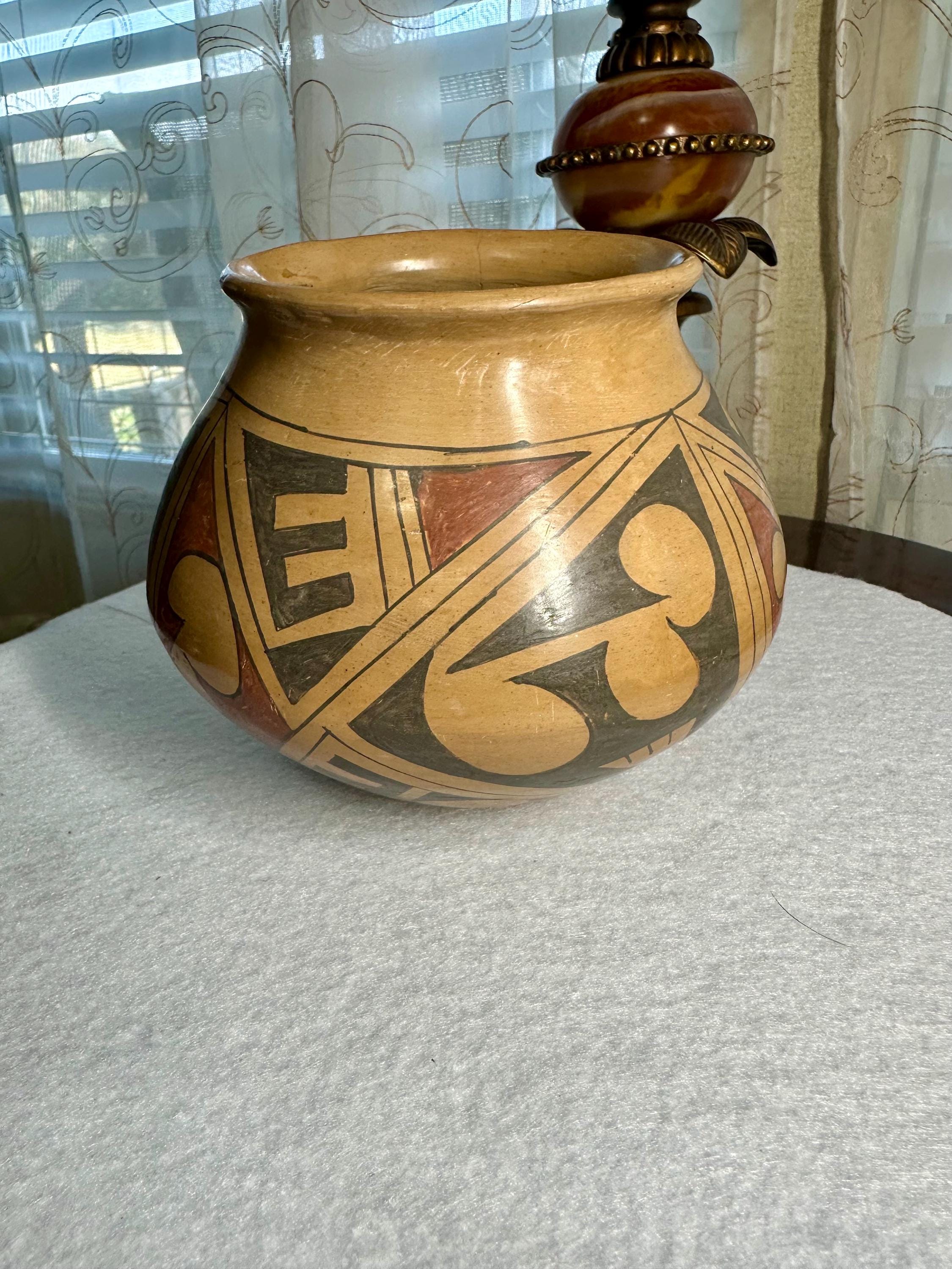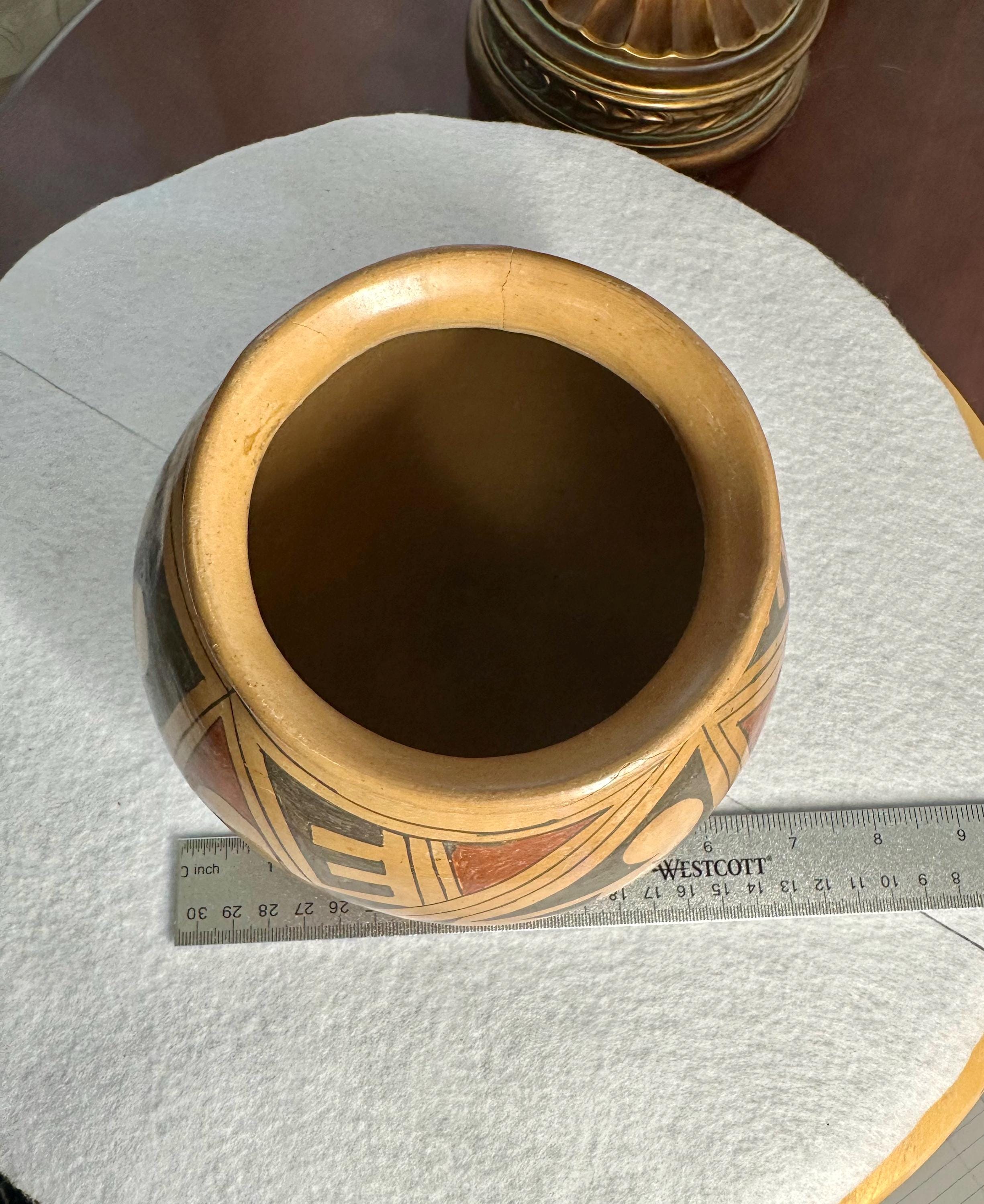This is a clay pot with "Eusibio Sanderal" written on the bottom. It stands at approximately 5 inches tall and 5 inches wide. There is a hairline crack through the pot, and you can see the raw clay on the inside where it is not glazed.