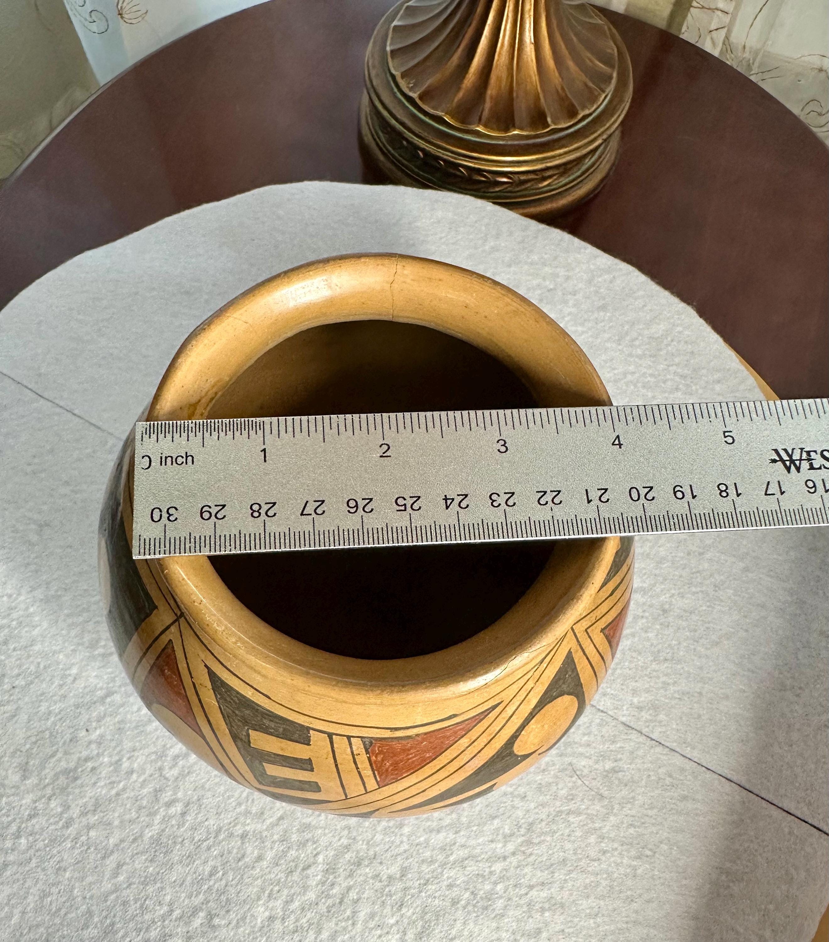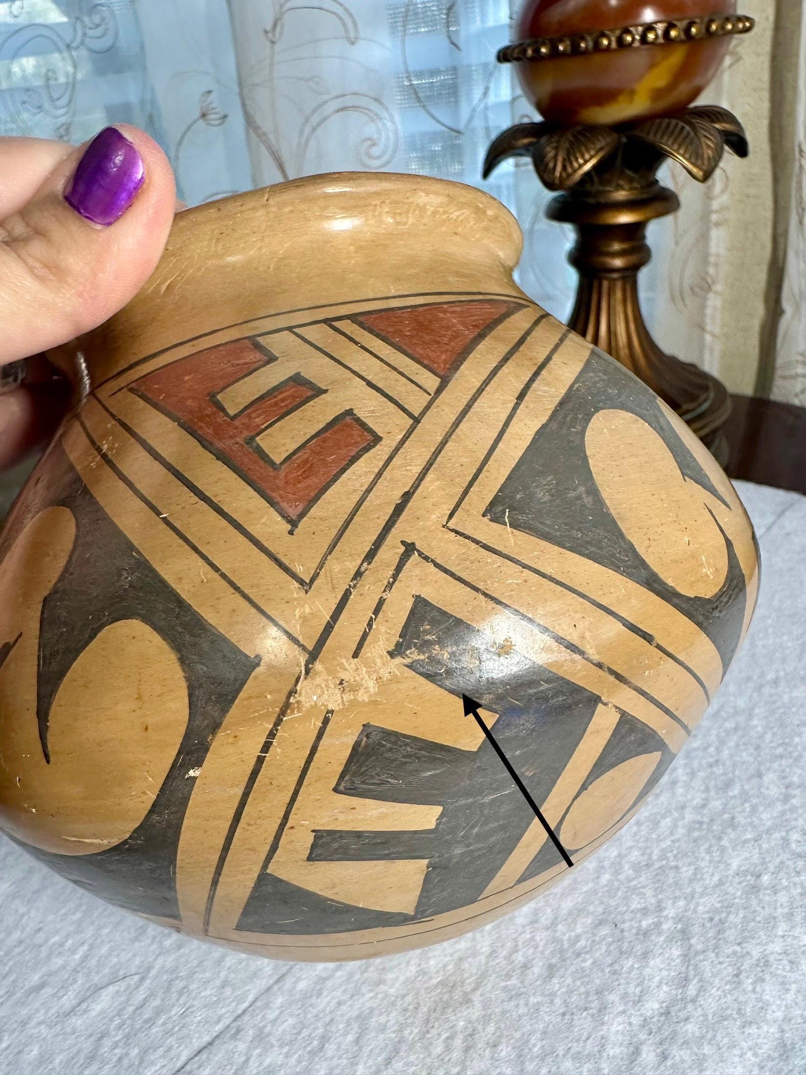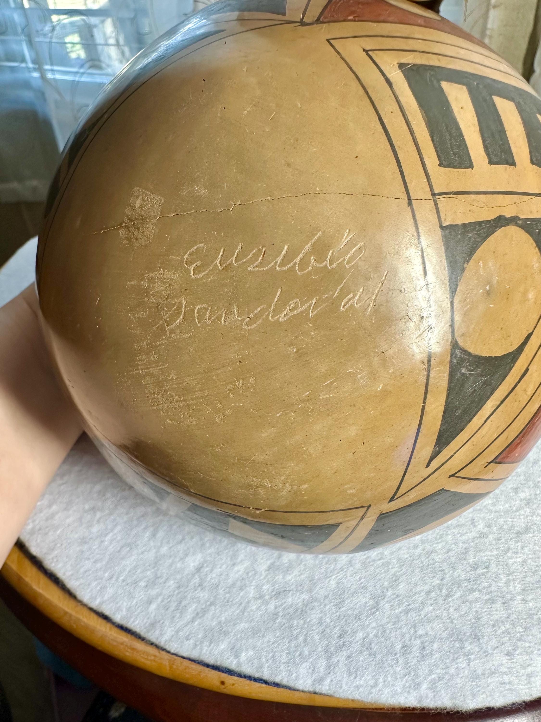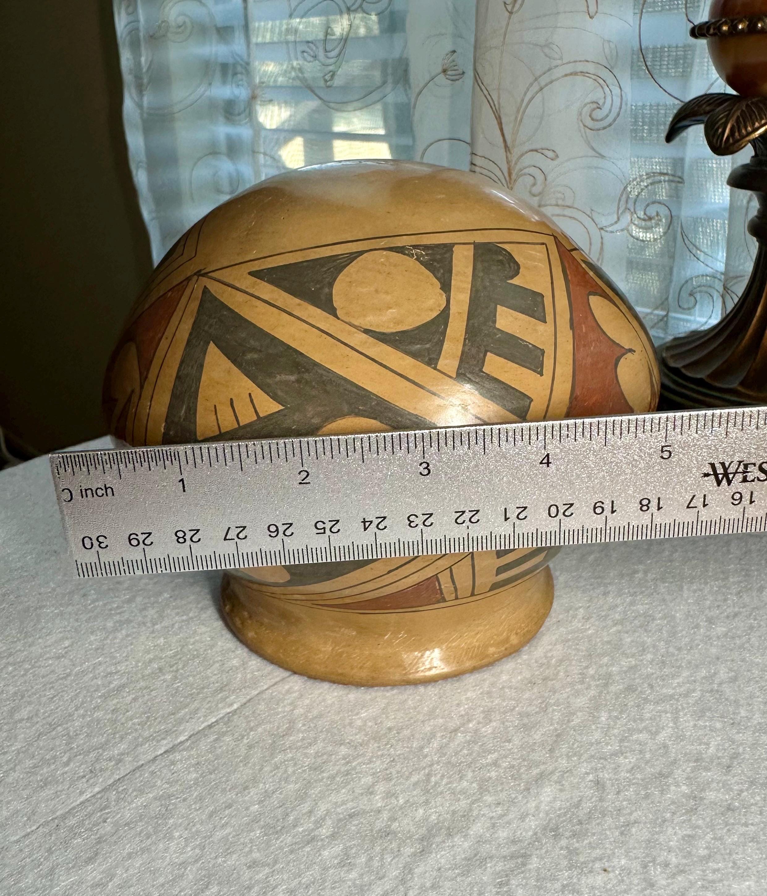This is a clay pot with "Eusibio Sanderal" written on the bottom. It stands at approximately 5 inches tall and 5 inches wide. There is a hairline crack through the pot, and you can see the raw clay on the inside where it is not glazed.