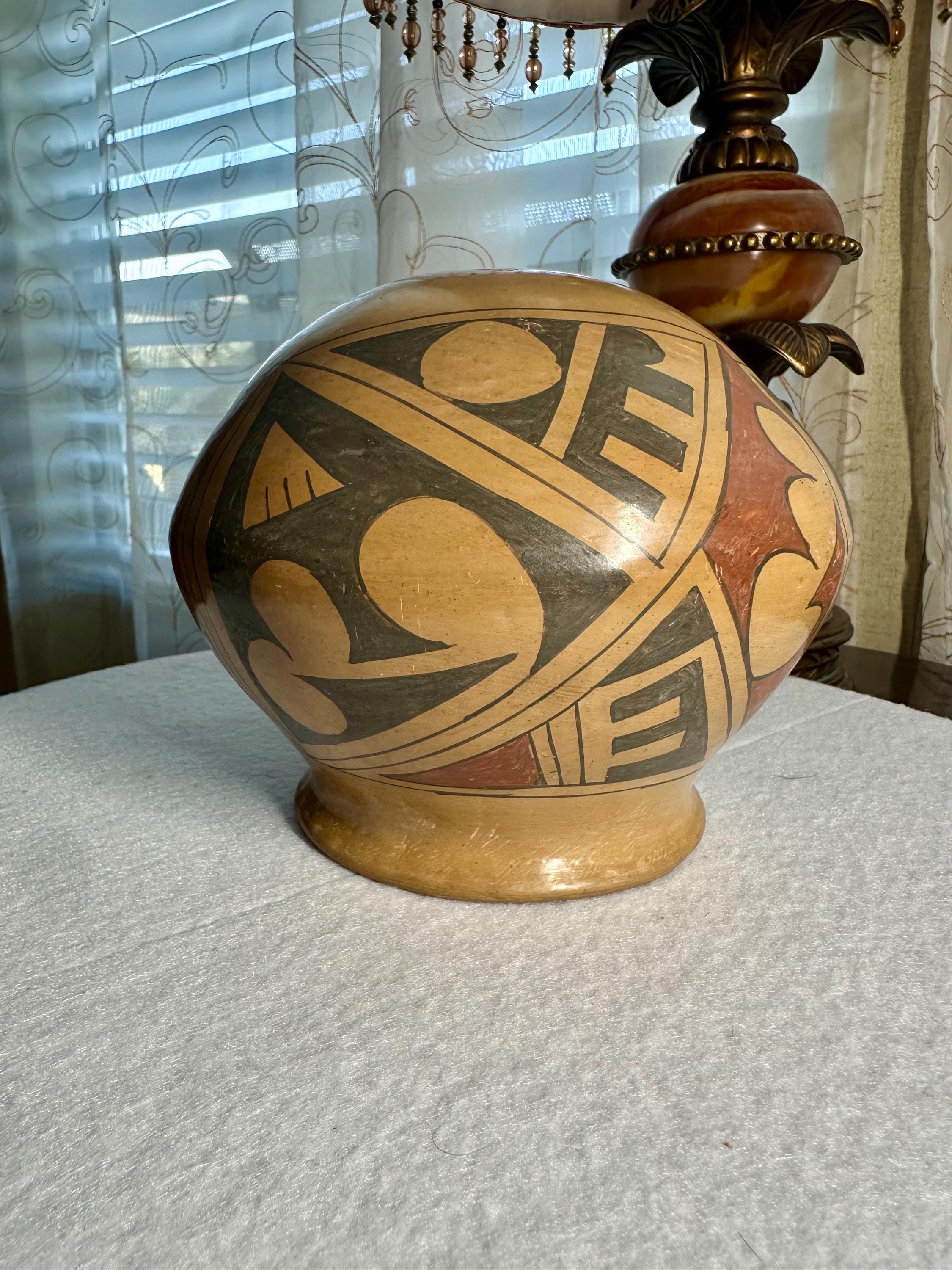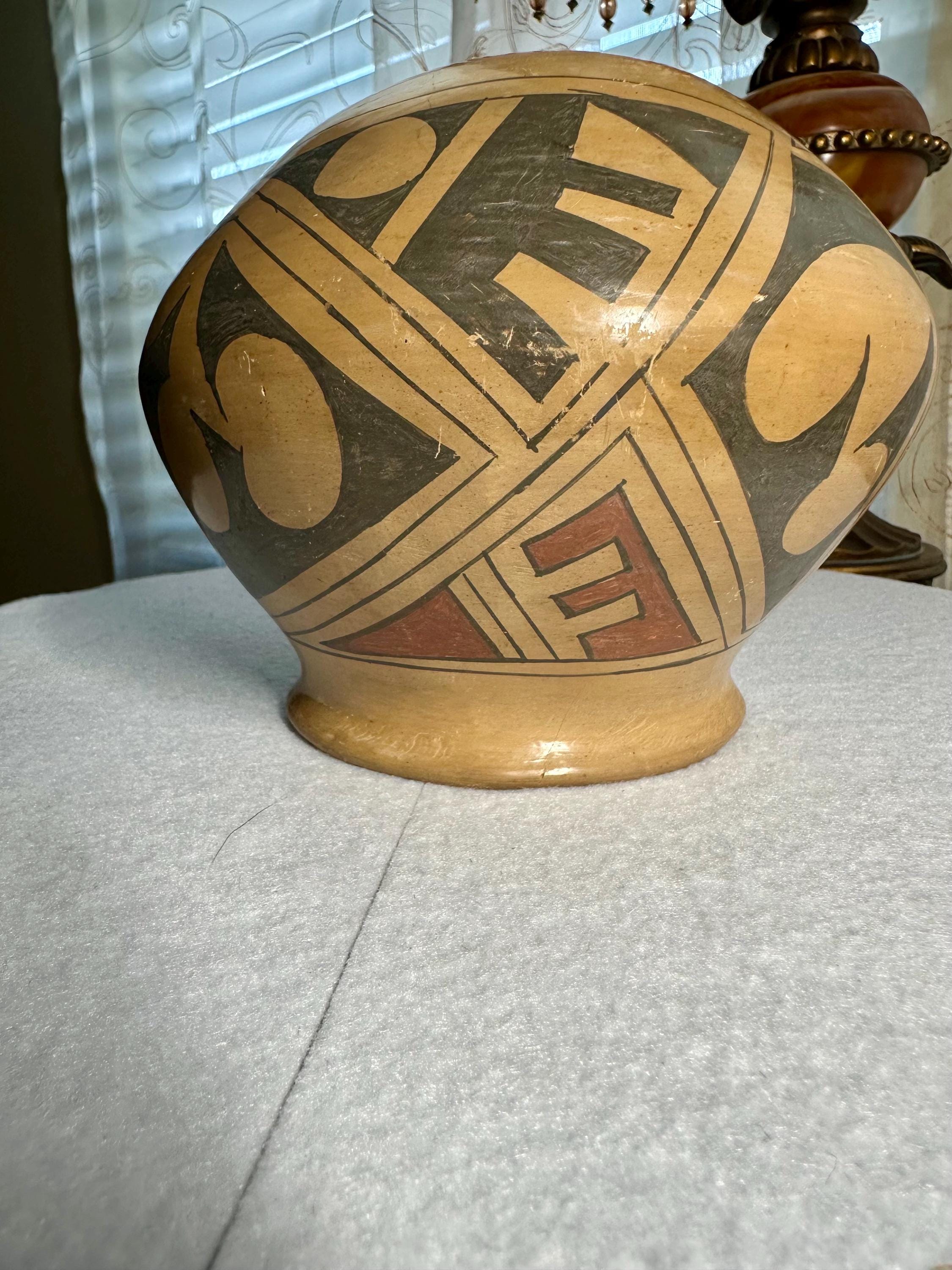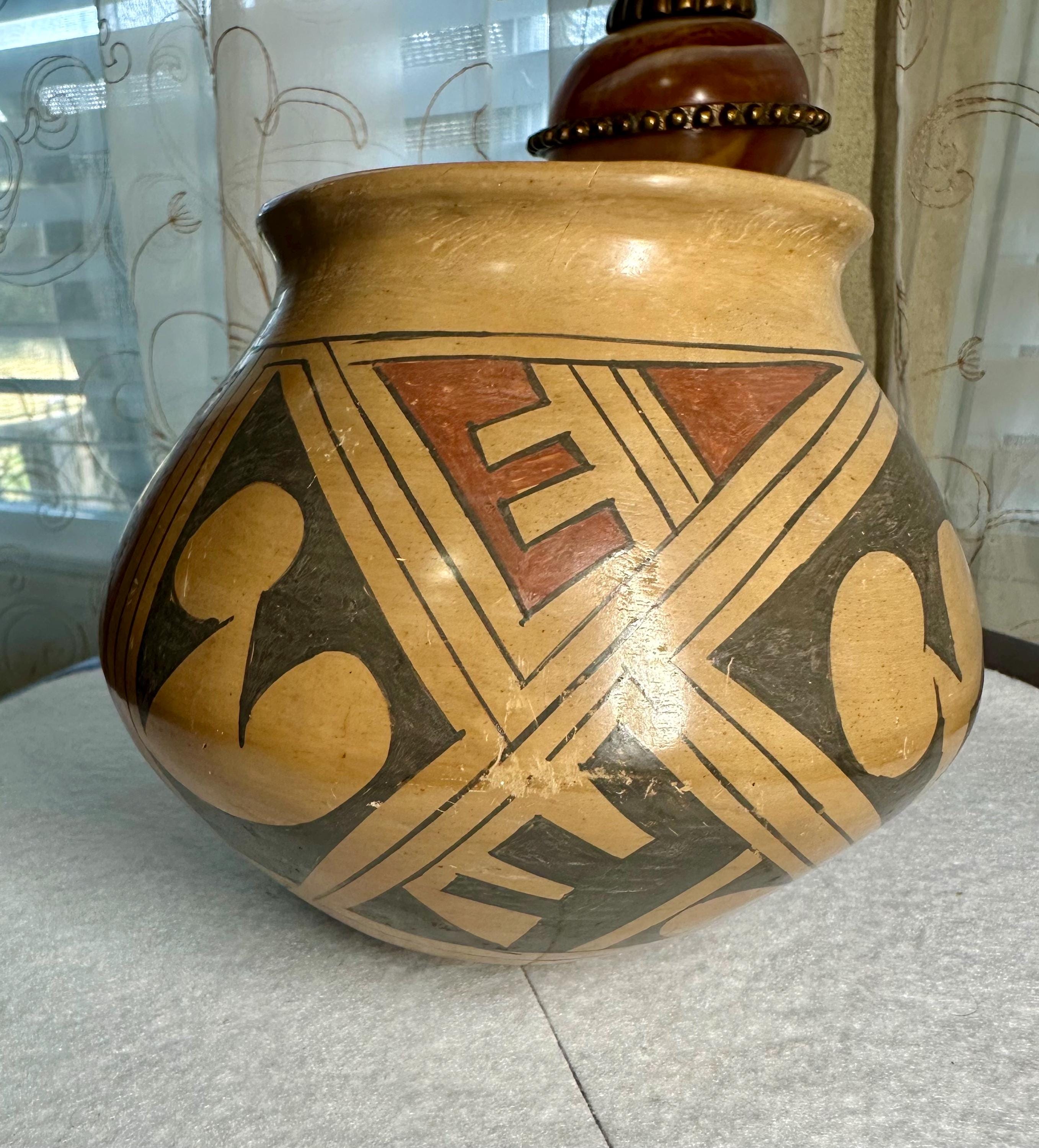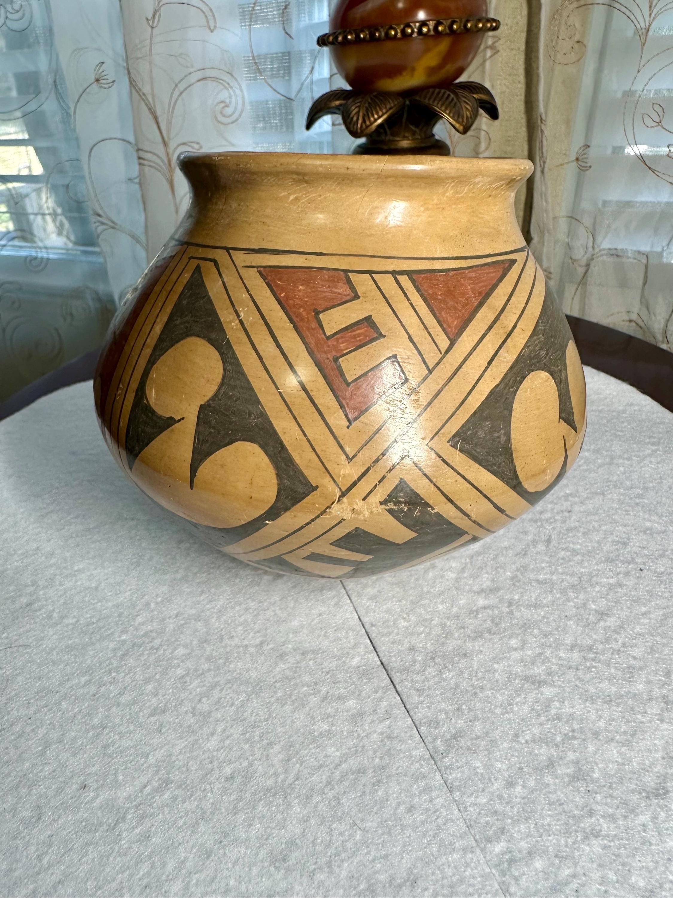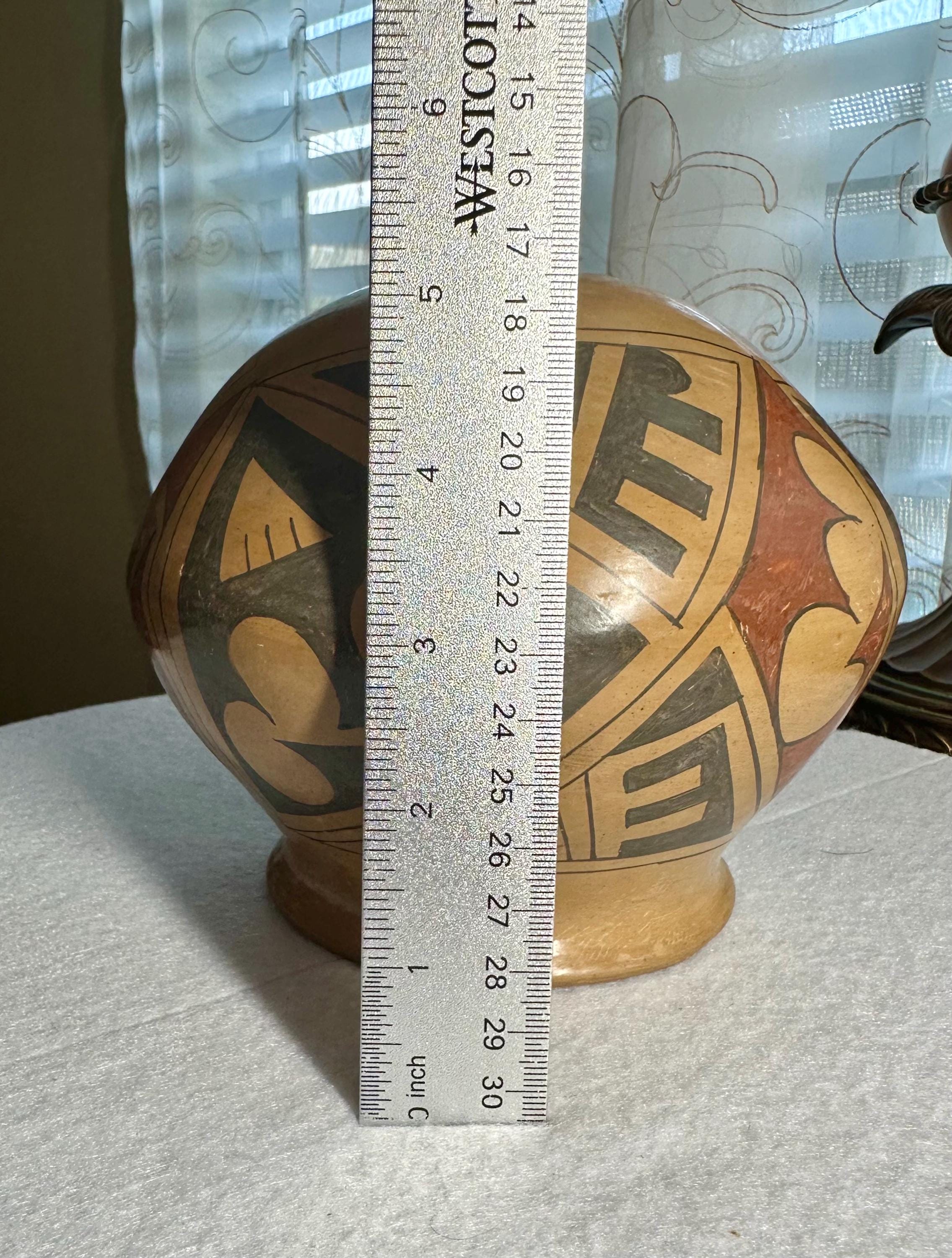 This is a clay pot with "Eusibio Sanderal" written on the bottom. It stands at approximately 5 inches tall and 5 inches wide. There is a hairline crack through the pot, and you can see the raw clay on the inside where it is not glazed.