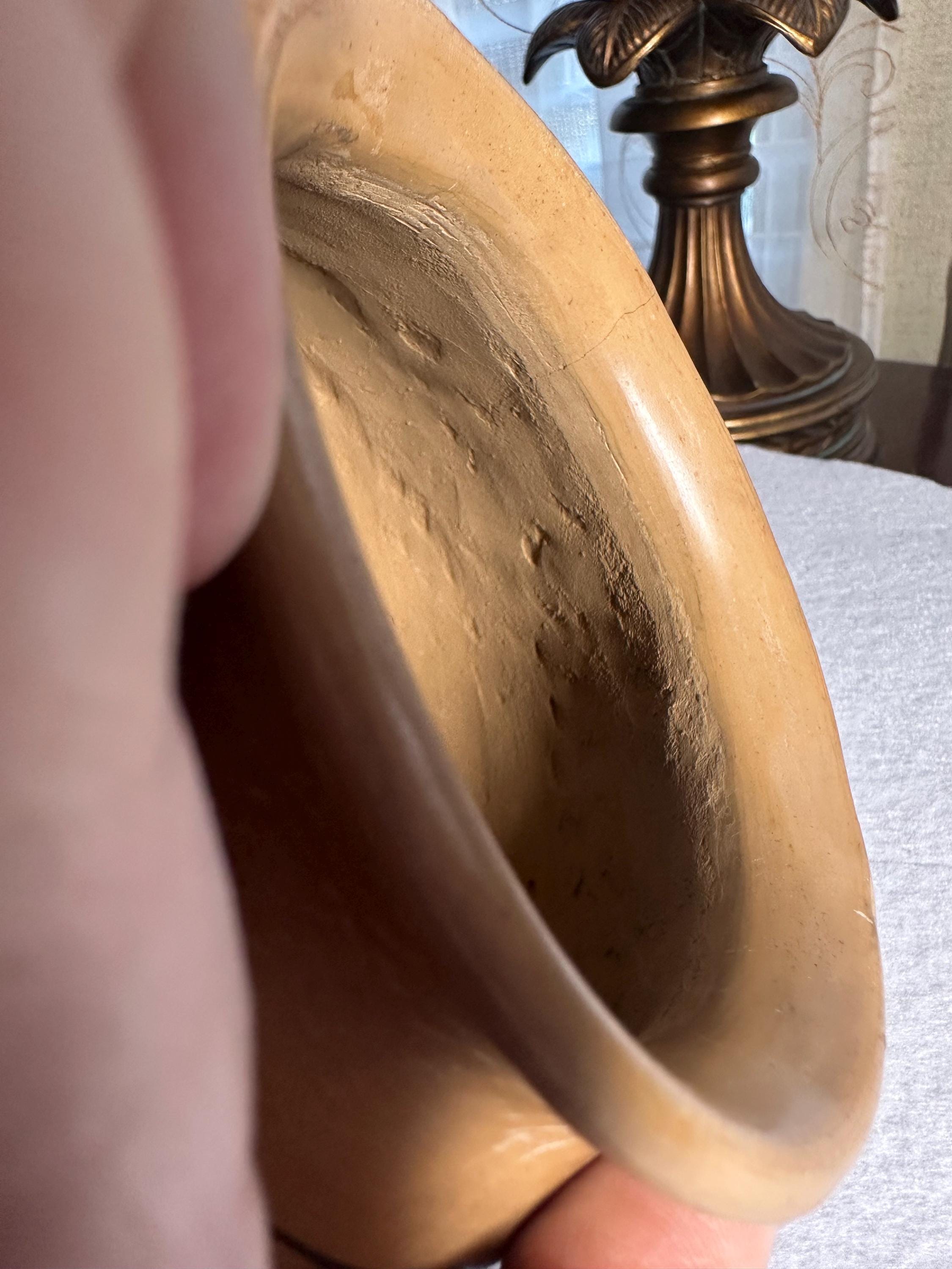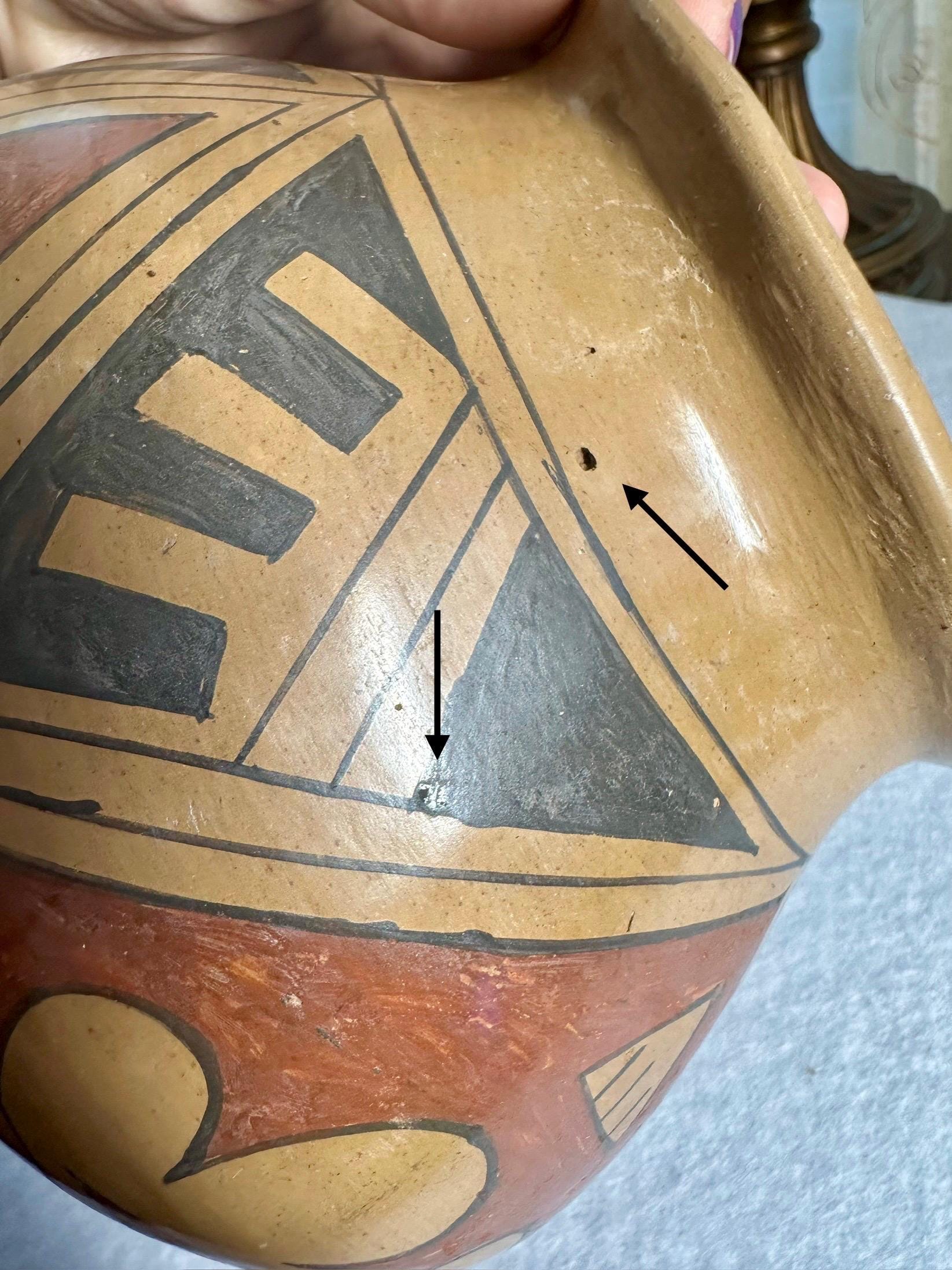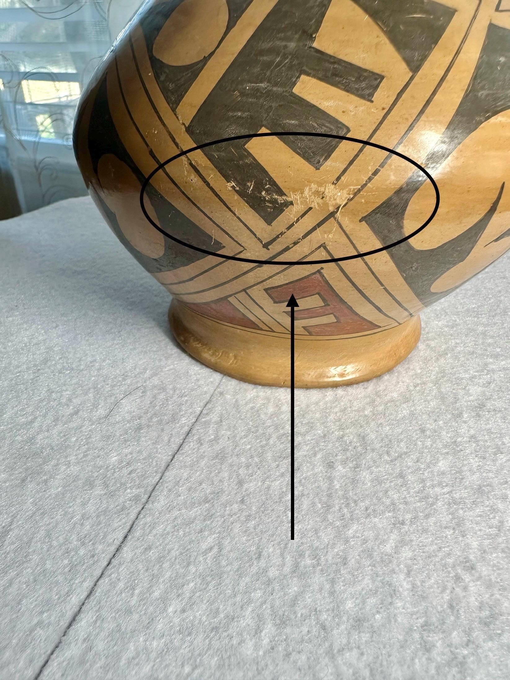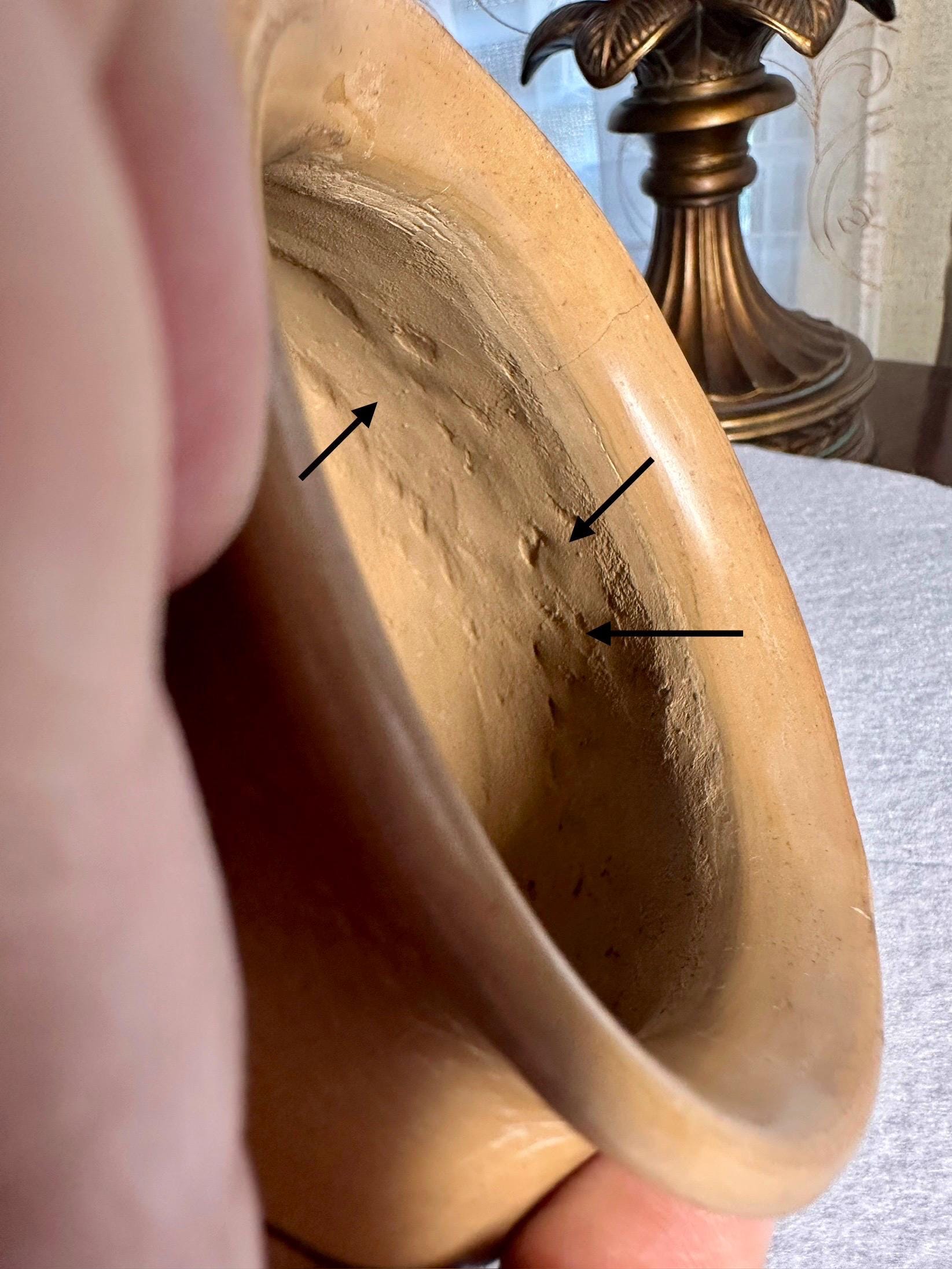 This is a clay pot with "Eusibio Sanderal" written on the bottom. It stands at approximately 5 inches tall and 5 inches wide. There is a hairline crack through the pot, and you can see the raw clay on the inside where it is not glazed.