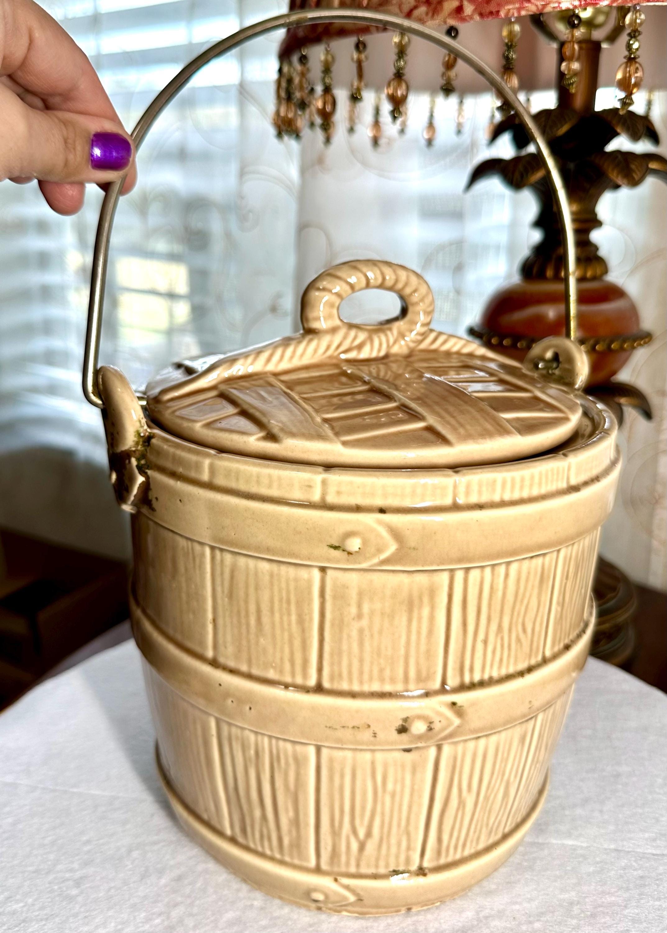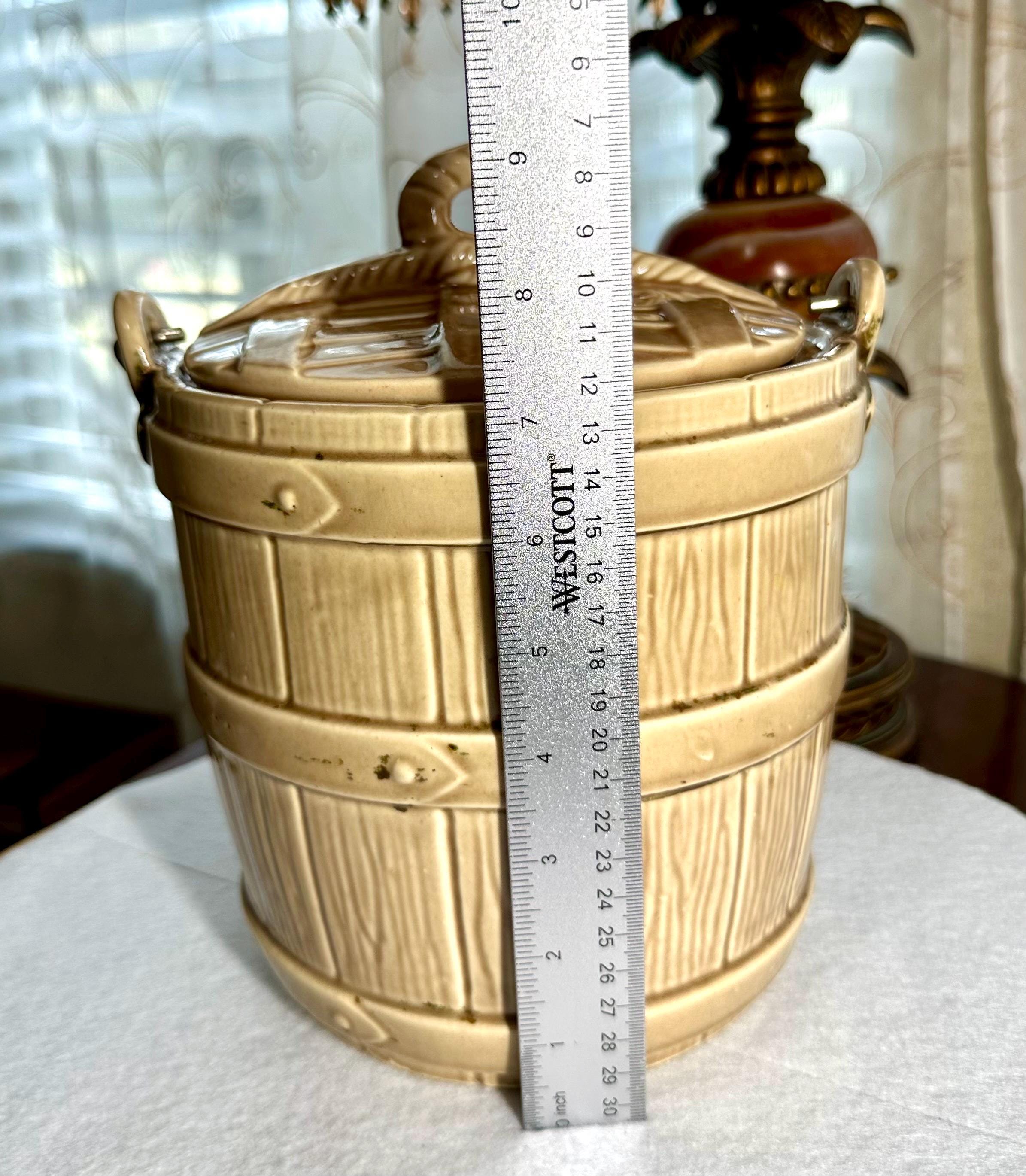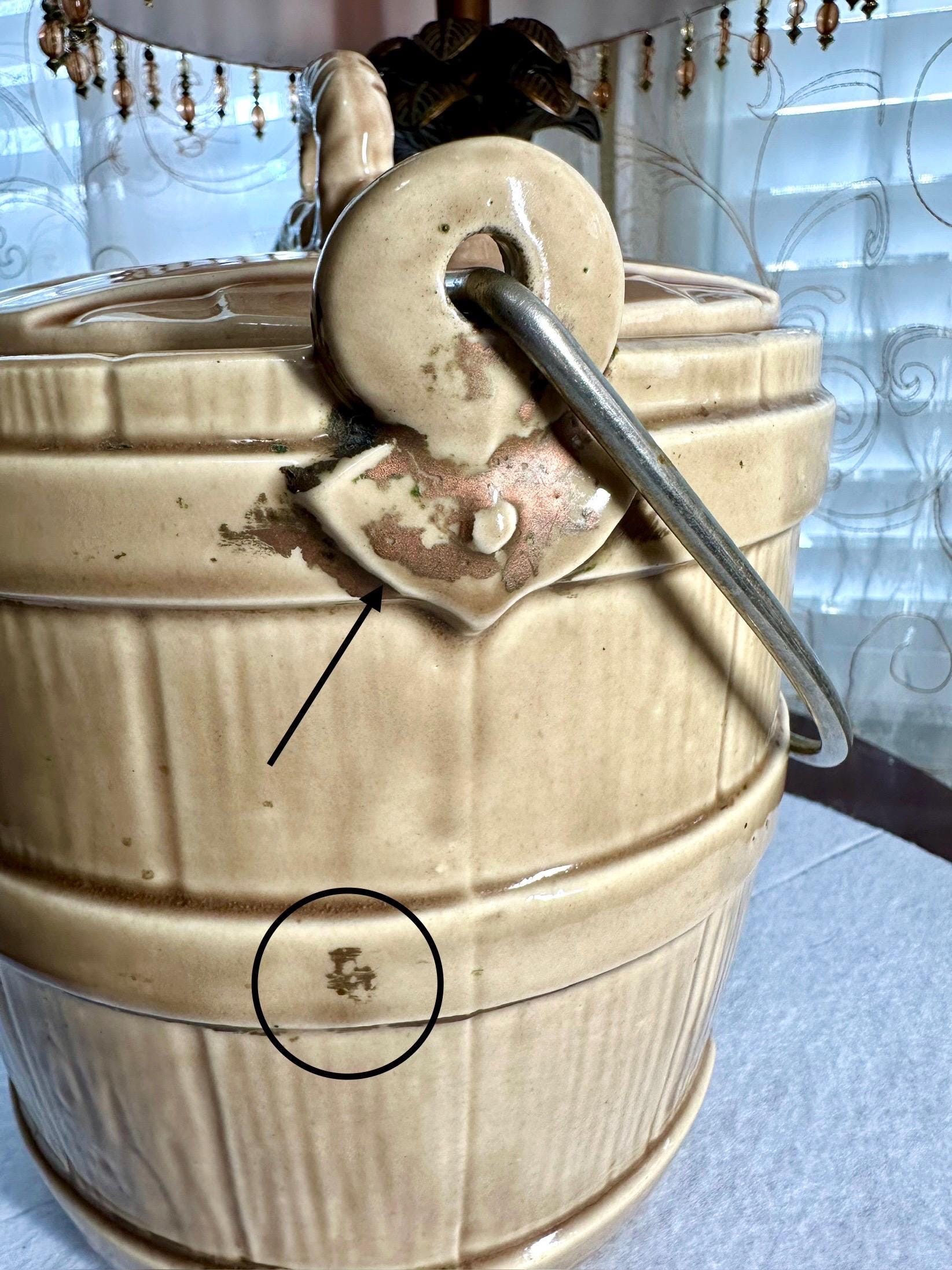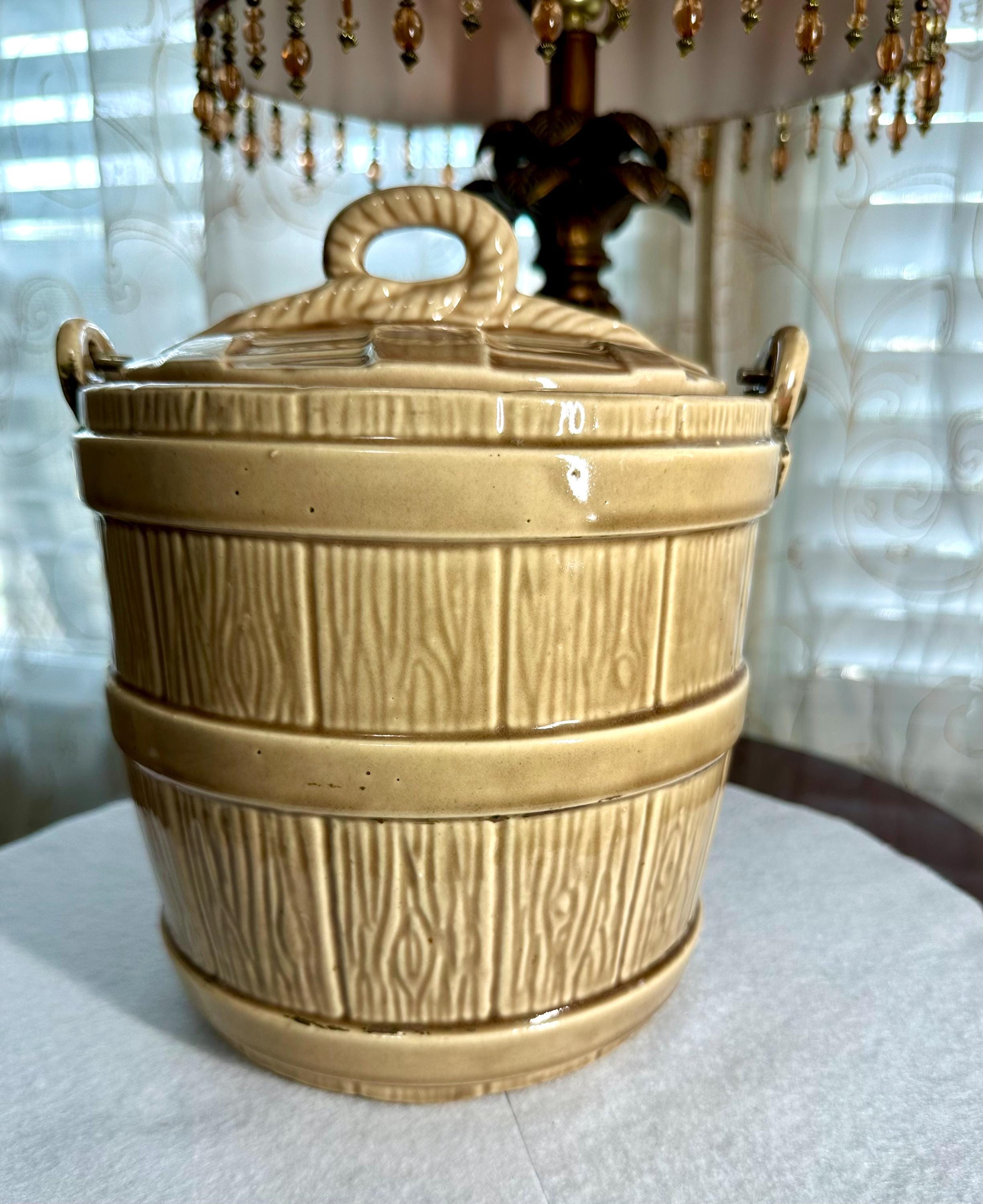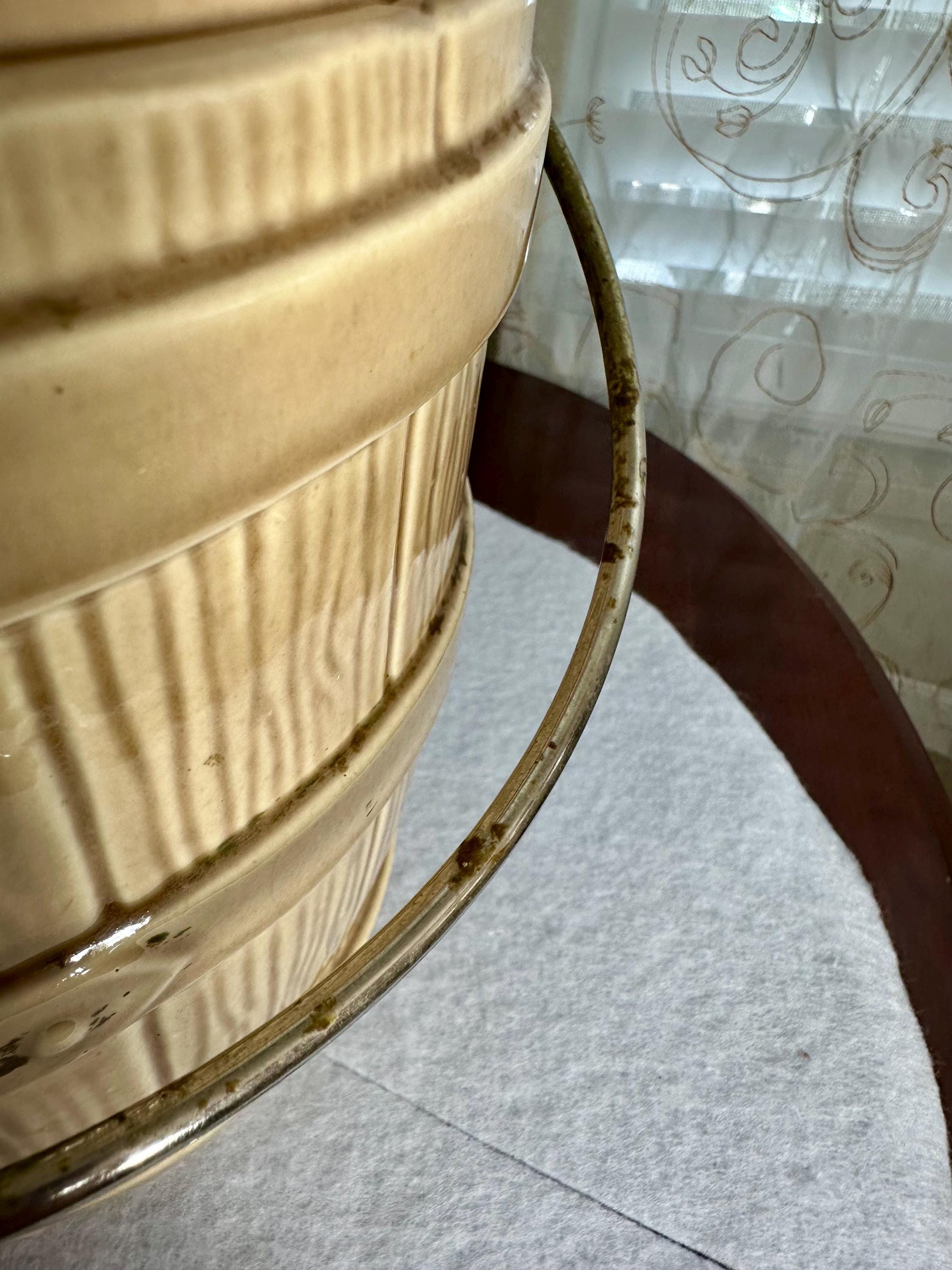 This is a McCoy Vintage Pottery Covered Barrel Jar and Lid. This is a fun piece that is ready for a new home. This does have some missing paint and discoloration inside the barrel. However, do believe this occurred during the glazing process. The metal handle does have natural wear and some rust on it. I chose not to restore that by cleaning it. If you use a little steel wool would be easily restored. But some people prefer their items to keep the "vintage" look. There is a chip on the lid and the original sticker on the underside. Due to the age,, the bottom of this is "dirty" at the unglazed portion. There are pictures included for all of these areas of concern. This stands at 7 inches tall without the lid, 9 inches tall with the lid.
