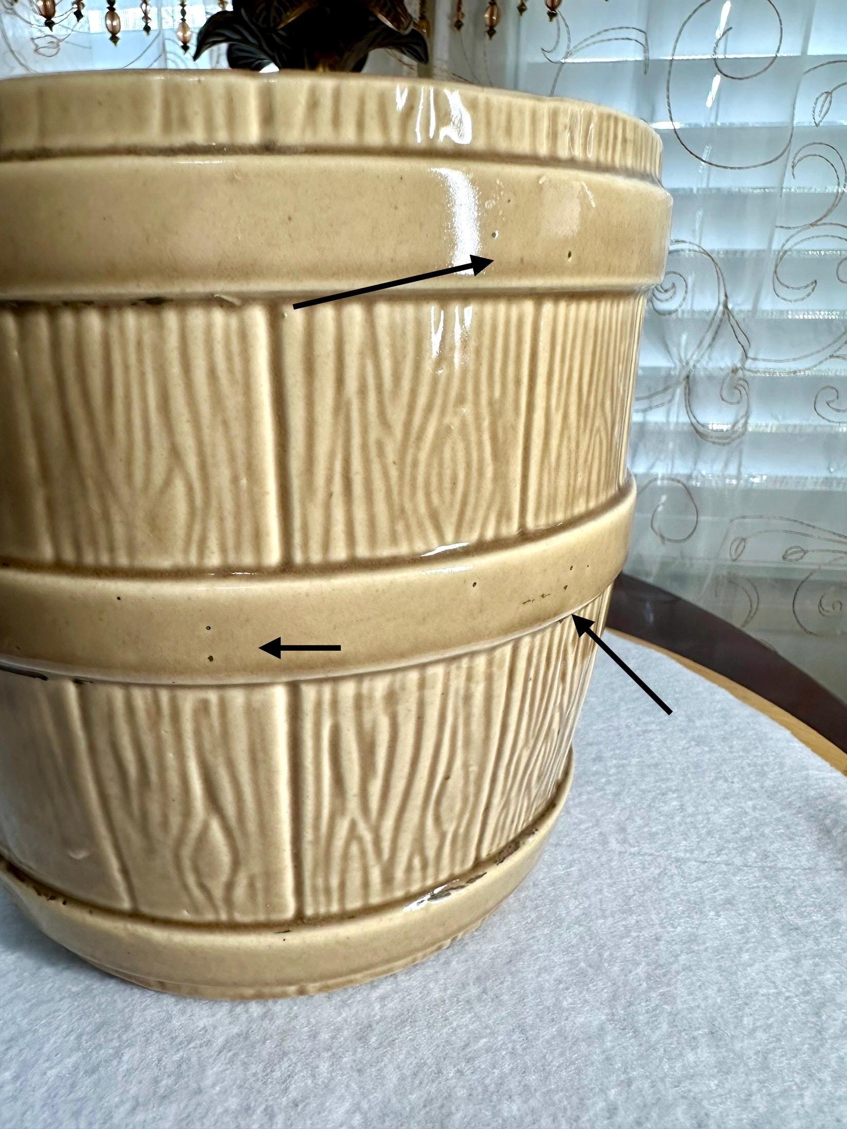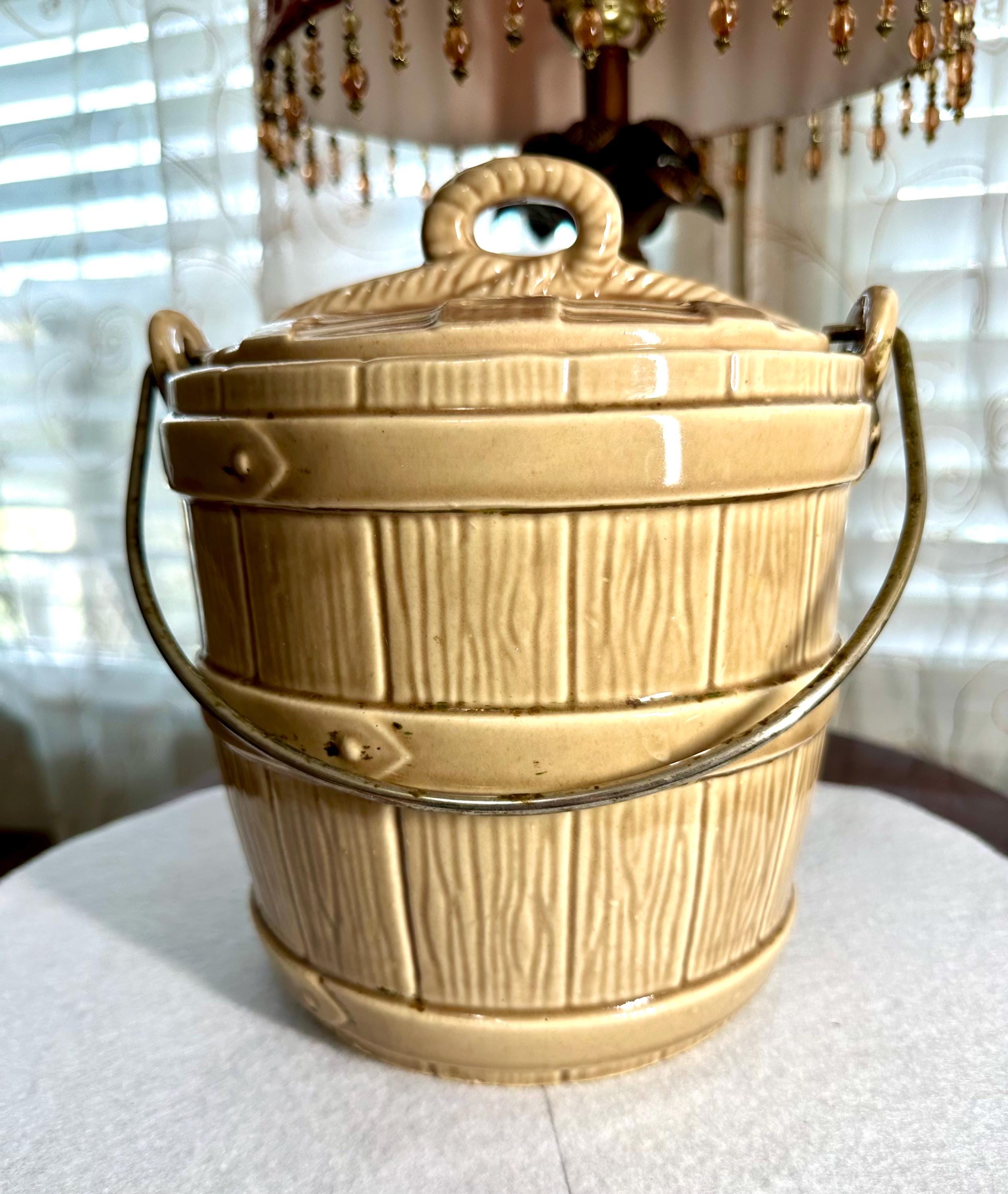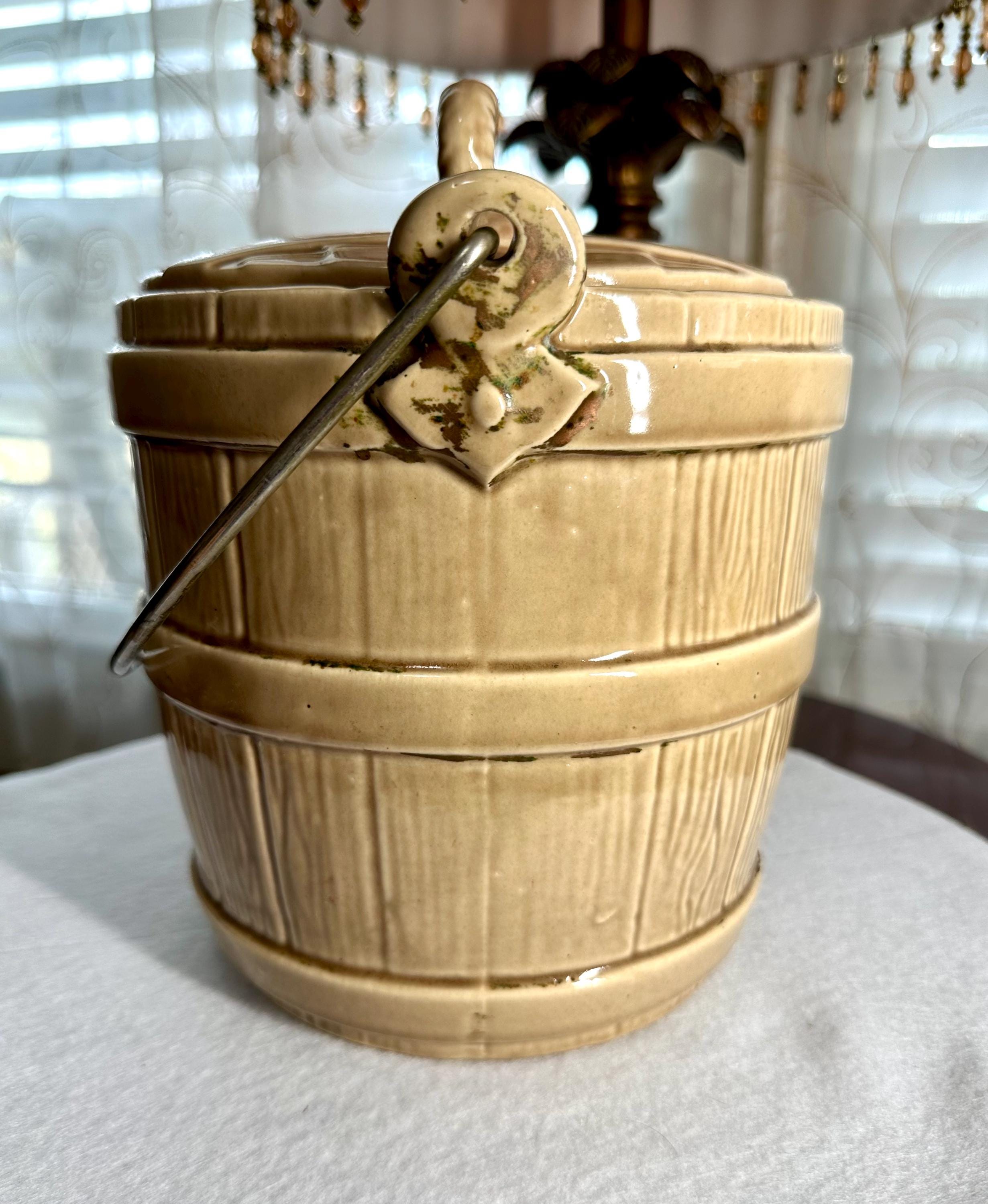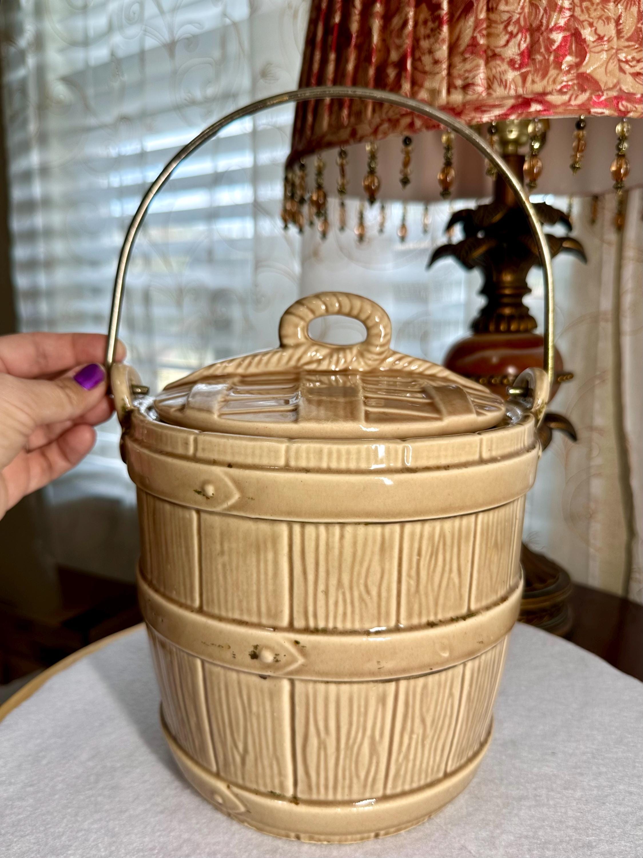 This is a McCoy Vintage Pottery Covered Barrel Jar and Lid. This is a fun piece that is ready for a new home. This does have some missing paint and discoloration inside the barrel. However, do believe this occurred during the glazing process. The metal handle does have natural wear and some rust on it. I chose not to restore that by cleaning it. If you use a little steel wool would be easily restored. But some people prefer their items to keep the "vintage" look. There is a chip on the lid and the original sticker on the underside. Due to the age,, the bottom of this is "dirty" at the unglazed portion. There are pictures included for all of these areas of concern. This stands at 7 inches tall without the lid, 9 inches tall with the lid.
