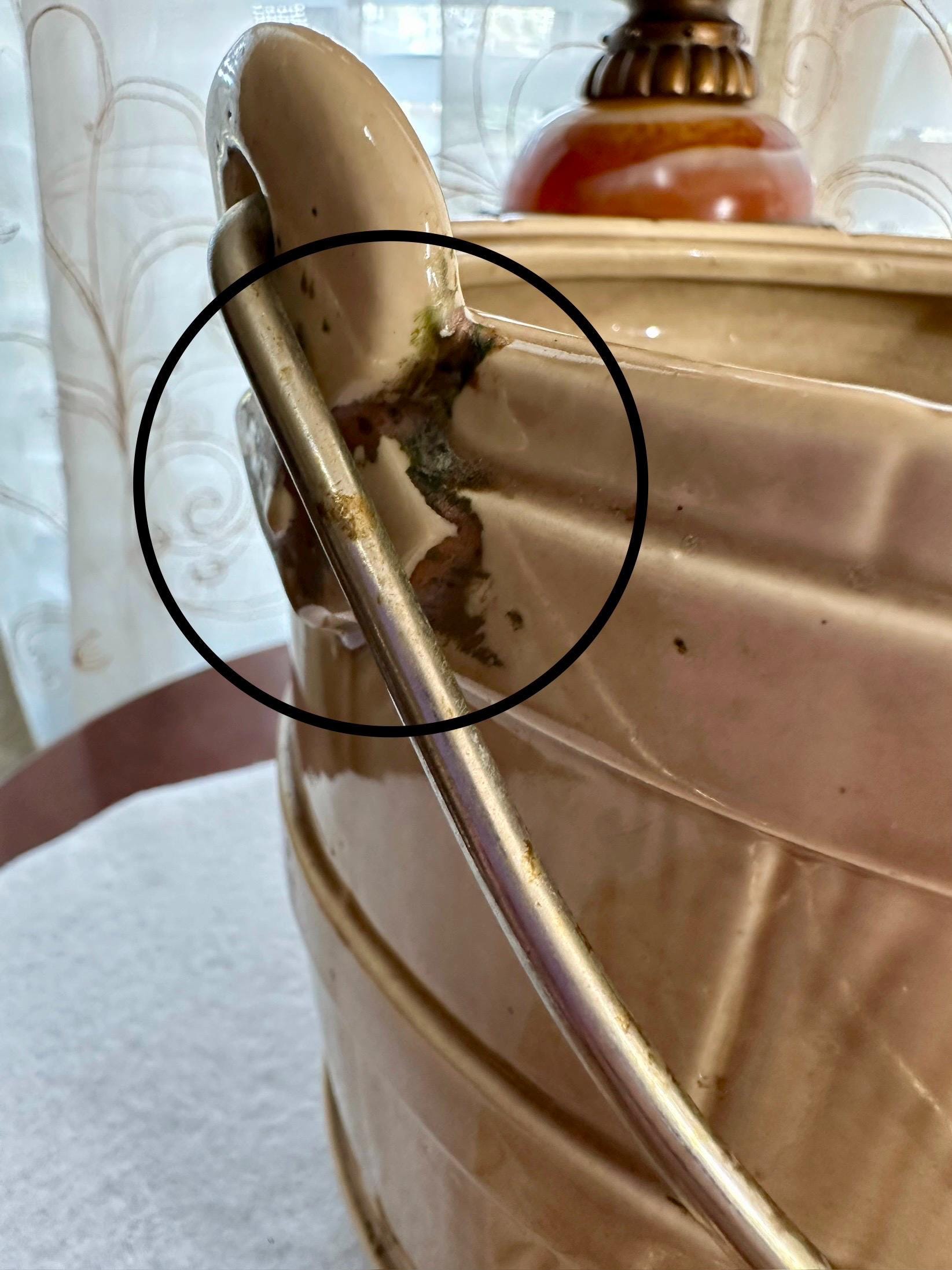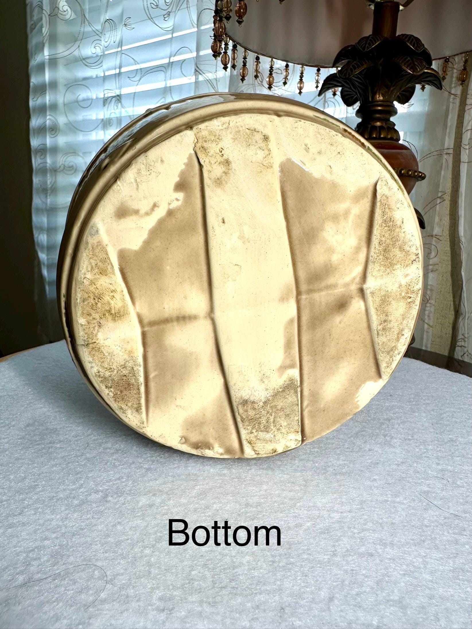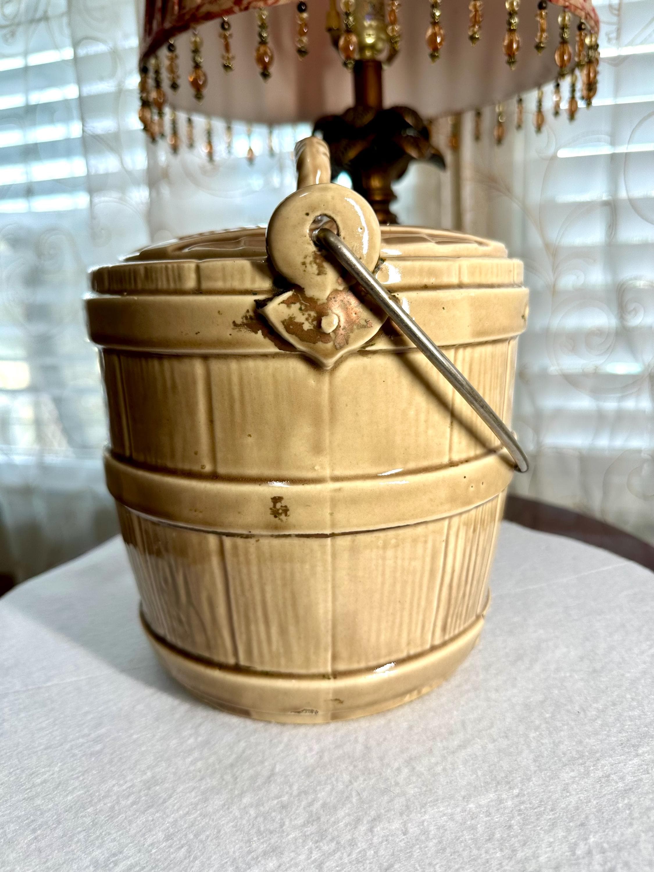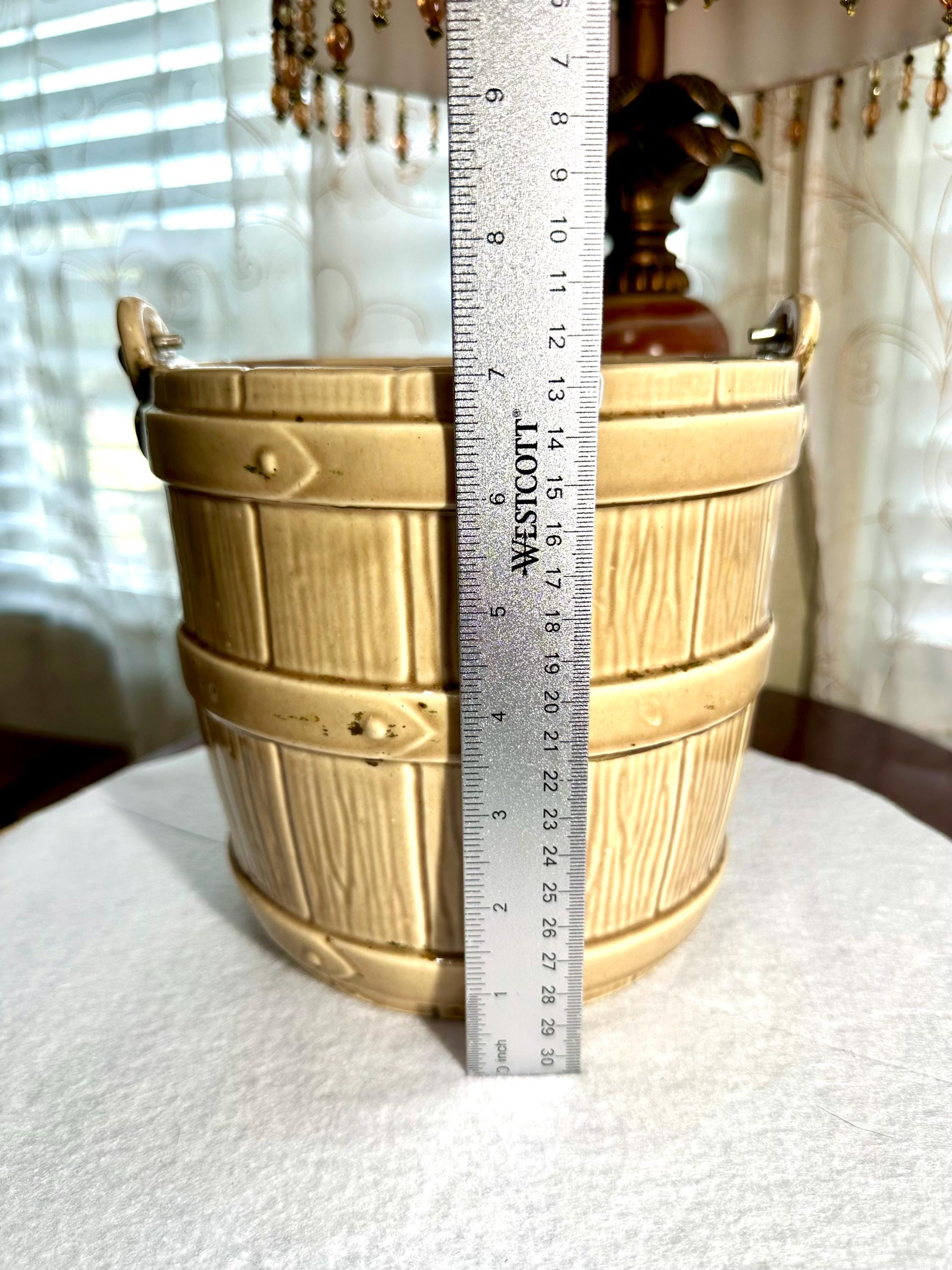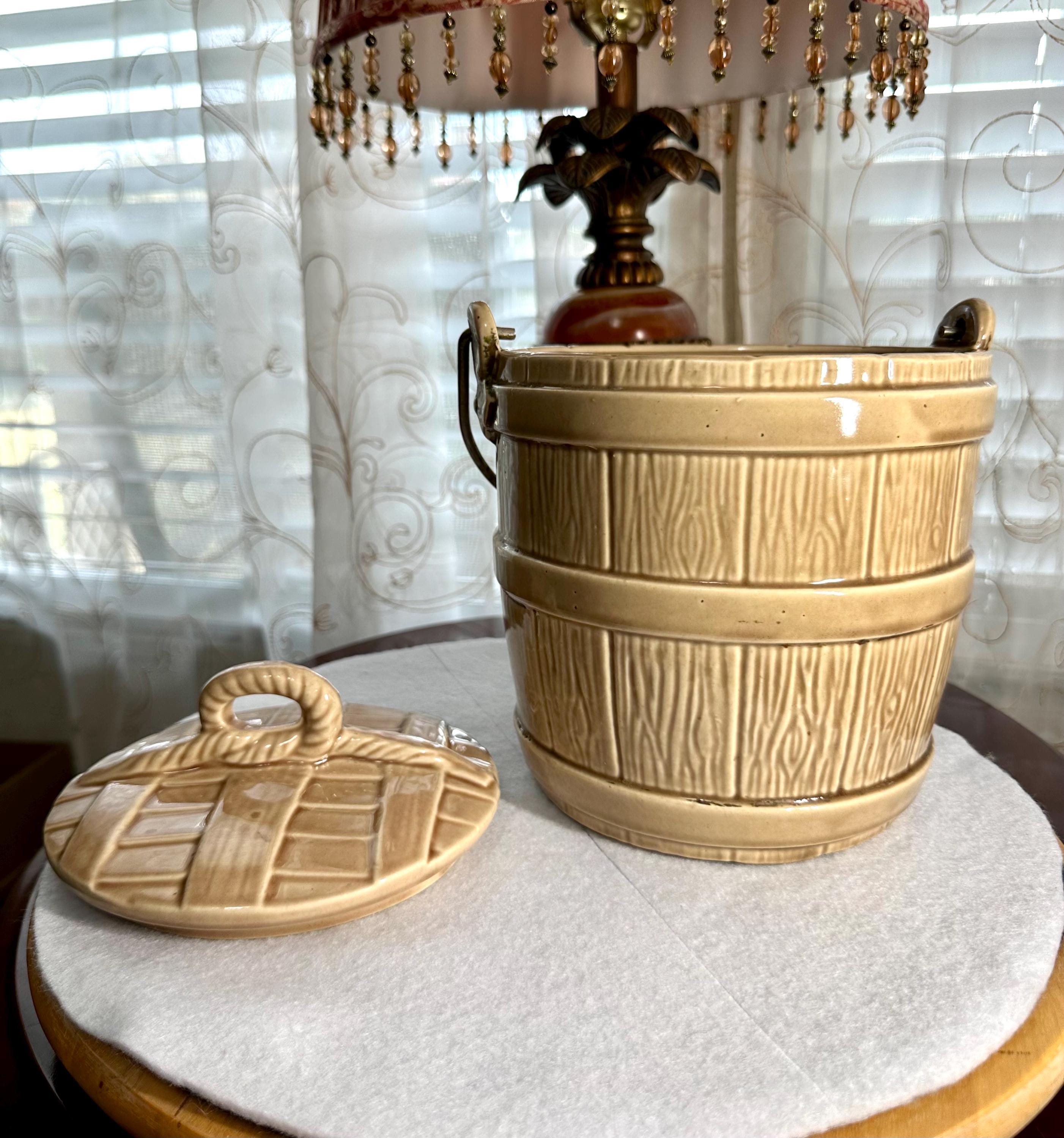 This is a McCoy Vintage Pottery Covered Barrel Jar and Lid. This is a fun piece that is ready for a new home. This does have some missing paint and discoloration inside the barrel. However, do believe this occurred during the glazing process. The metal handle does have natural wear and some rust on it. I chose not to restore that by cleaning it. If you use a little steel wool would be easily restored. But some people prefer their items to keep the "vintage" look. There is a chip on the lid and the original sticker on the underside. Due to the age,, the bottom of this is "dirty" at the unglazed portion. There are pictures included for all of these areas of concern. This stands at 7 inches tall without the lid, 9 inches tall with the lid.