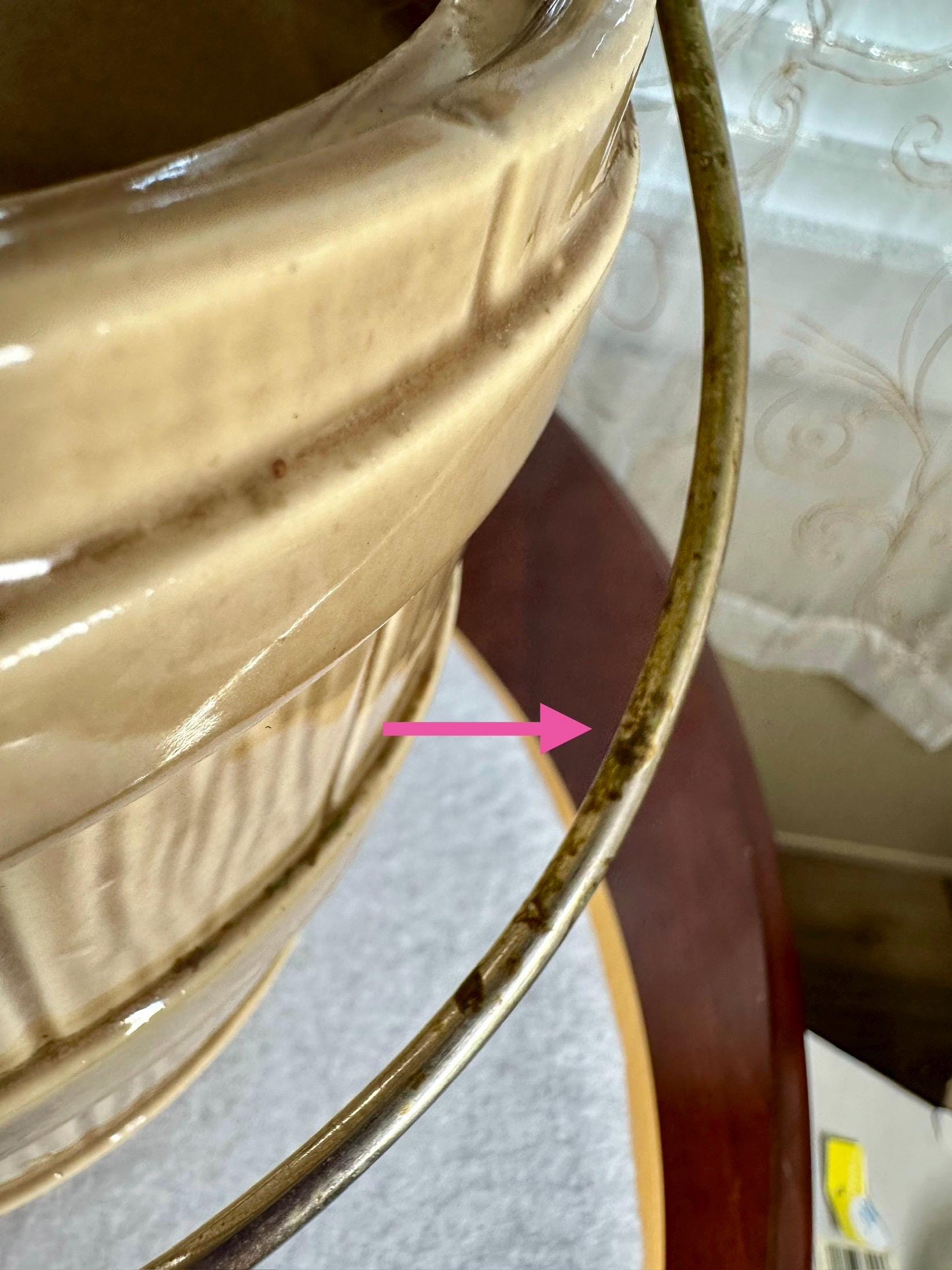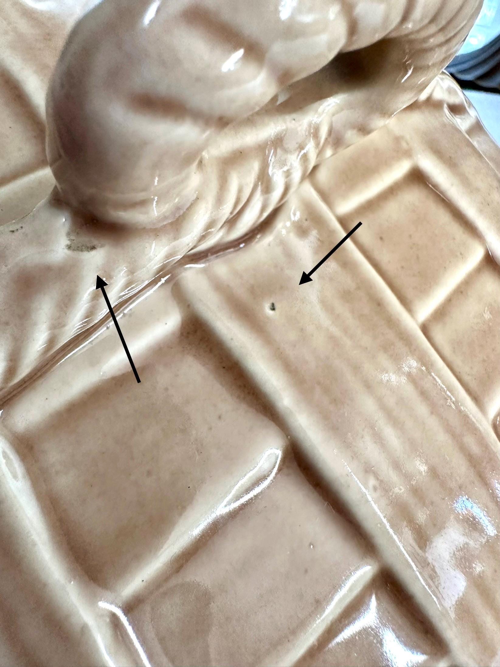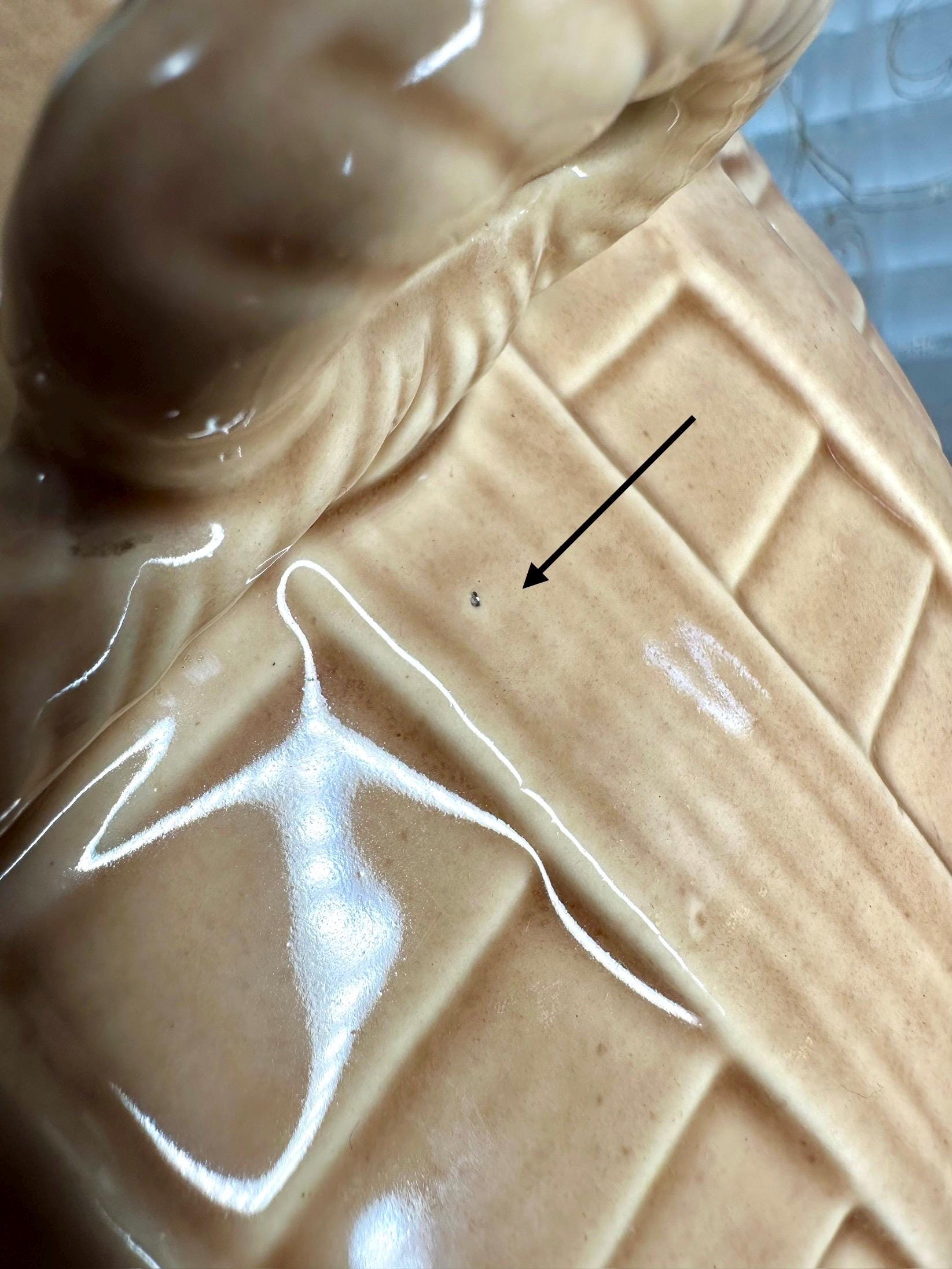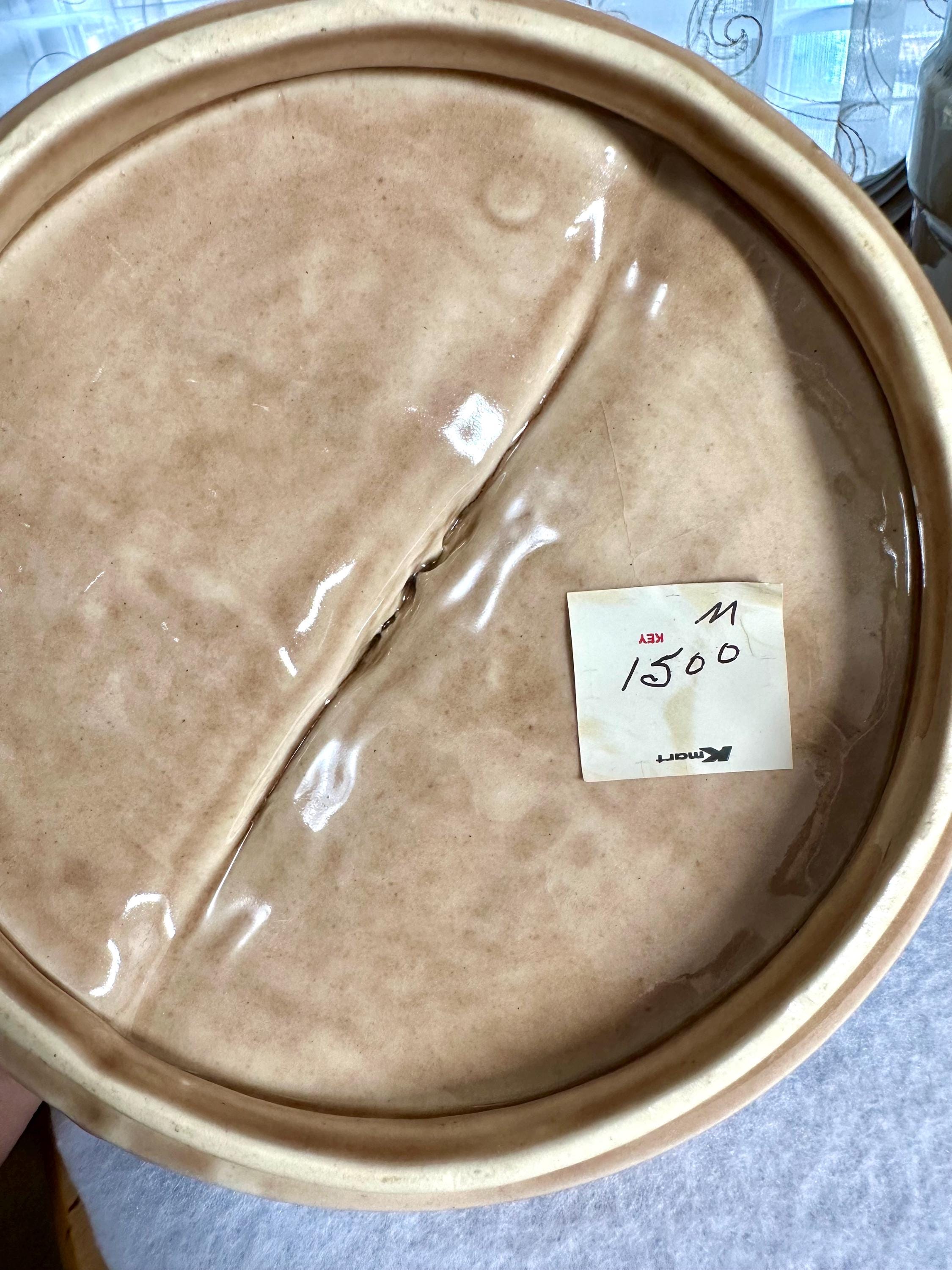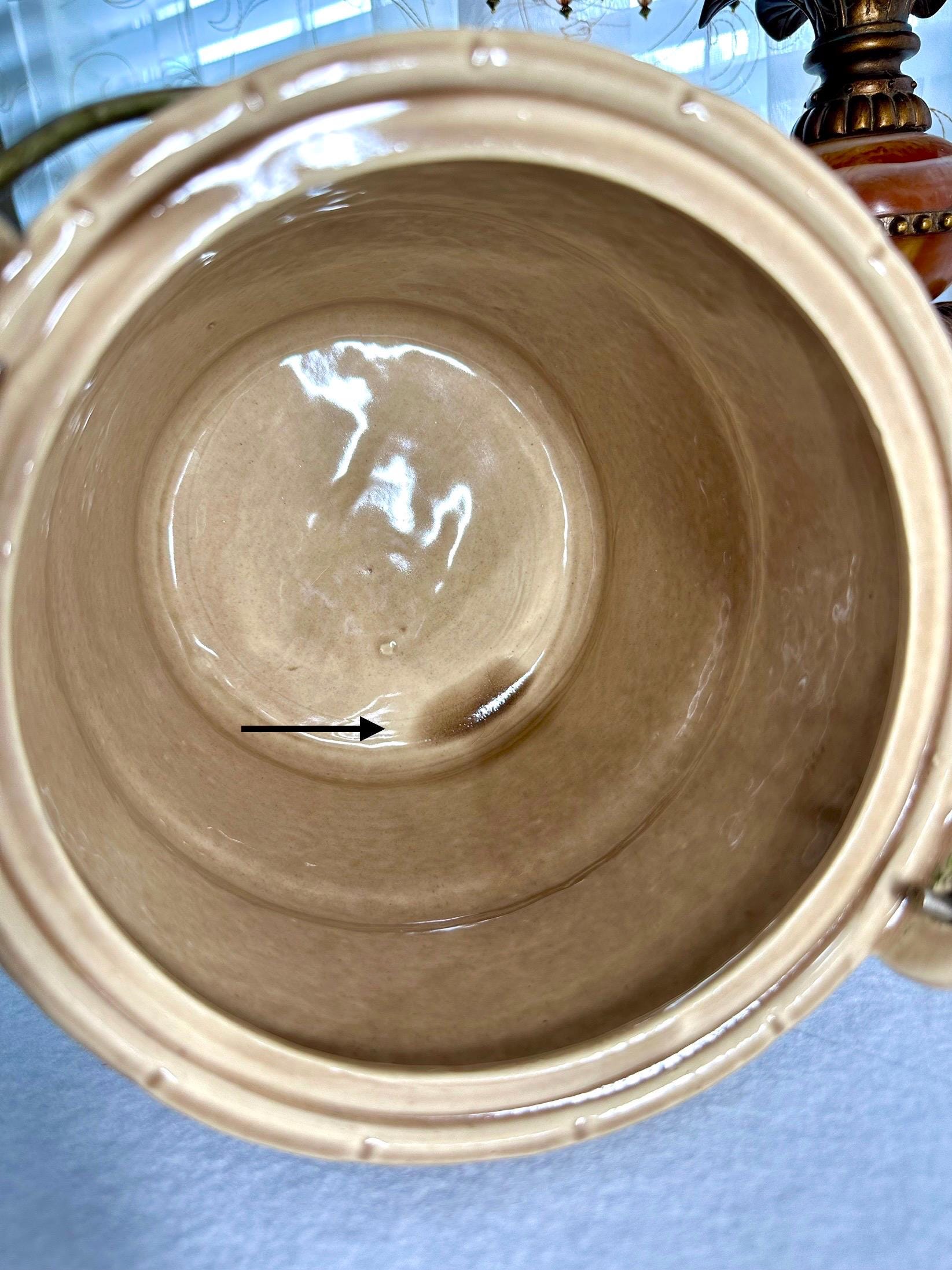 This is a McCoy Vintage Pottery Covered Barrel Jar and Lid. This is a fun piece that is ready for a new home. This does have some missing paint and discoloration inside the barrel. However, do believe this occurred during the glazing process. The metal handle does have natural wear and some rust on it. I chose not to restore that by cleaning it. If you use a little steel wool would be easily restored. But some people prefer their items to keep the "vintage" look. There is a chip on the lid and the original sticker on the underside. Due to the age,, the bottom of this is "dirty" at the unglazed portion. There are pictures included for all of these areas of concern. This stands at 7 inches tall without the lid, 9 inches tall with the lid.
