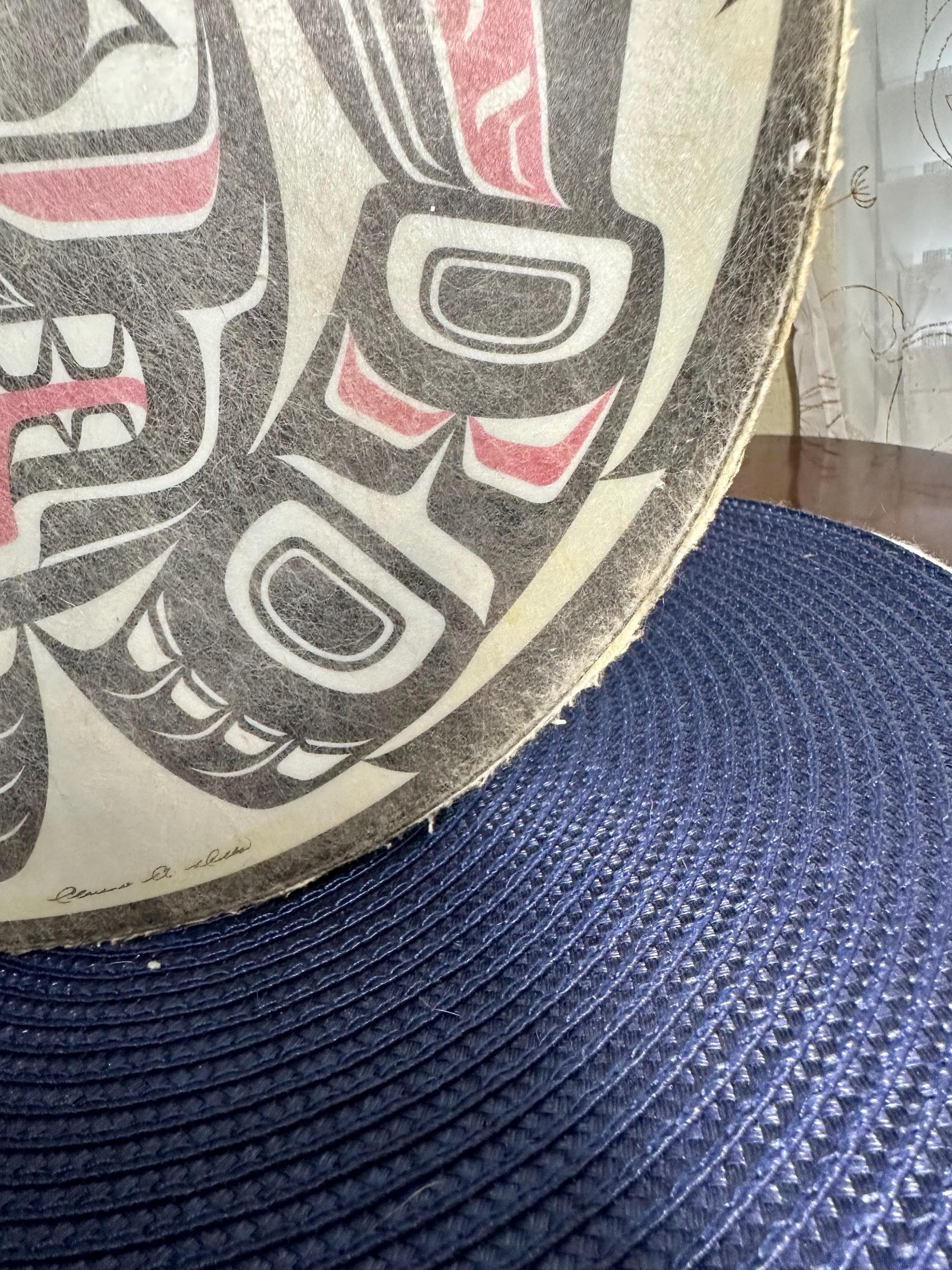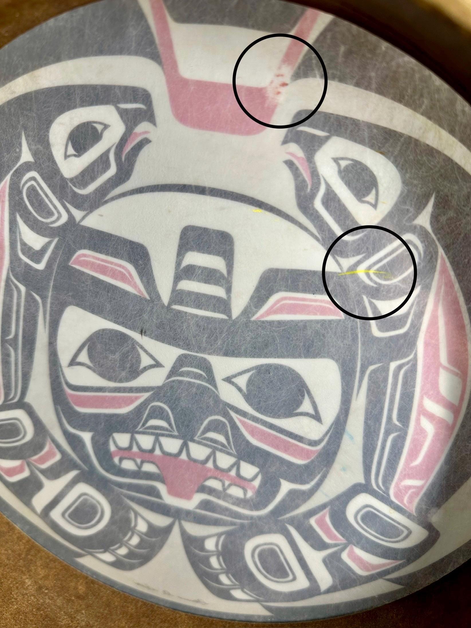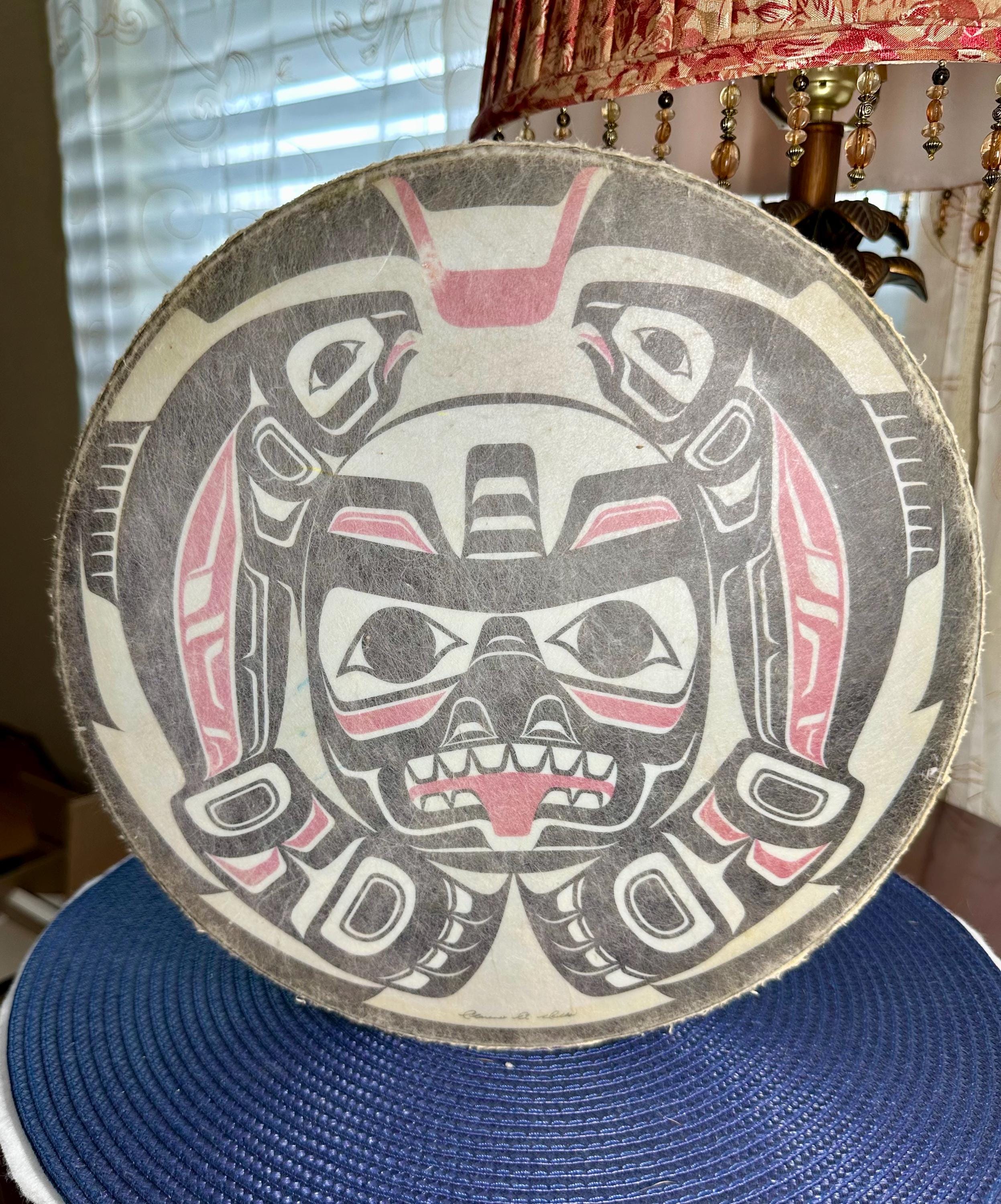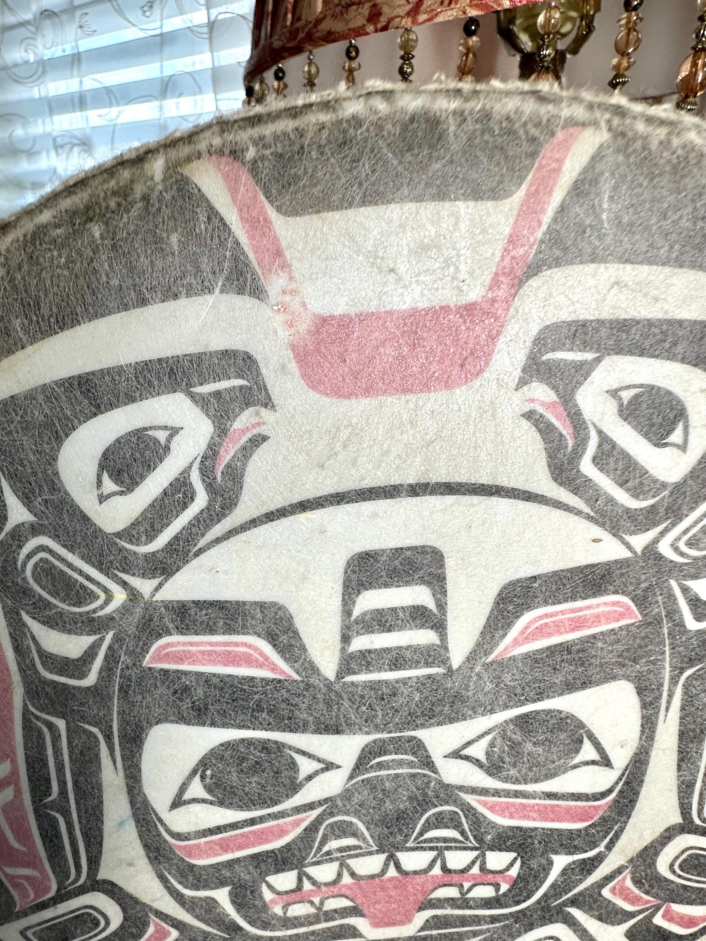 This is a Pacific Northwest Haida Art Hand Drum. This does not come with the mallet; however, it is a beautiful piece to add to your collection. There are a few areas on this drum that are age-appropriate. There is a blue mark on the drum and yellow paint on the underside of the drum. There are dimples on the drum surface buy you need to look closely to see those dimples. There are some spots where the coloring is missing. The outside of the drum edge is worn. There are pictures included for all of these areas. The condition of the drum has been taken into consideration during pricing. The drum is around 11 inches in diameter. There is a signature on the bottom of the drum, but I am not able to make out who signed it.