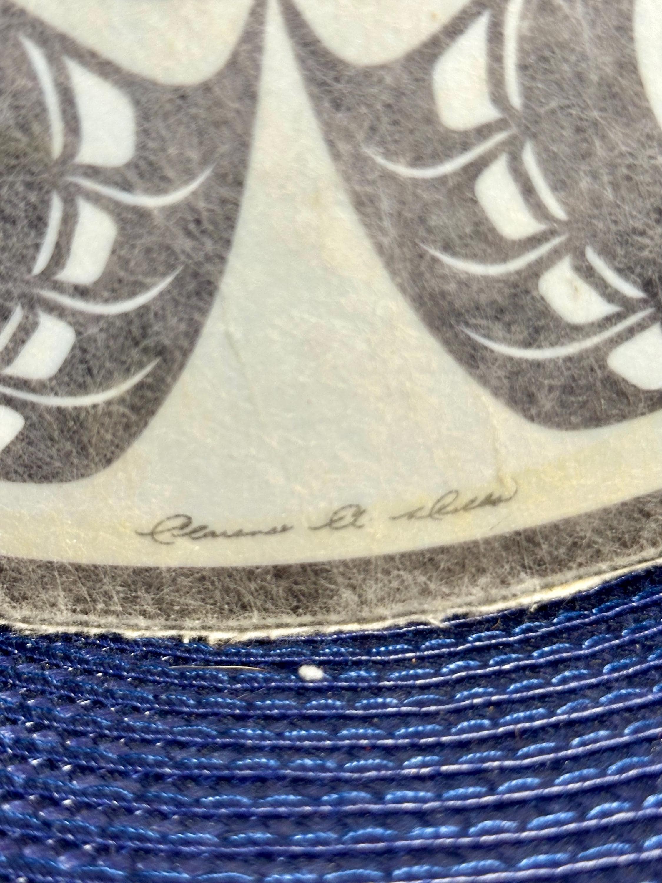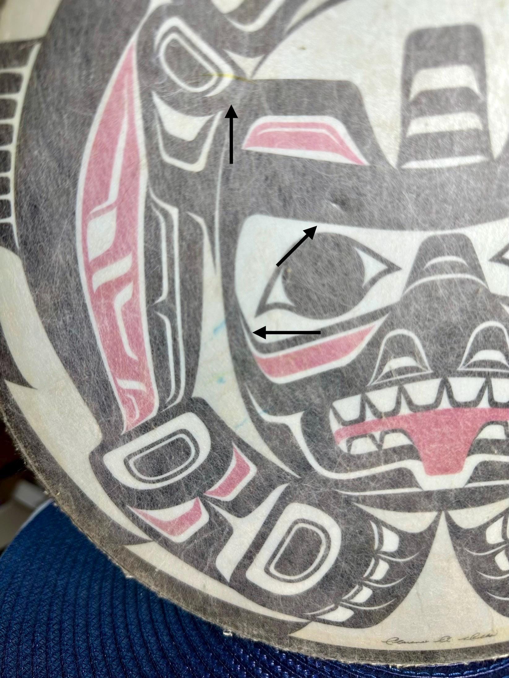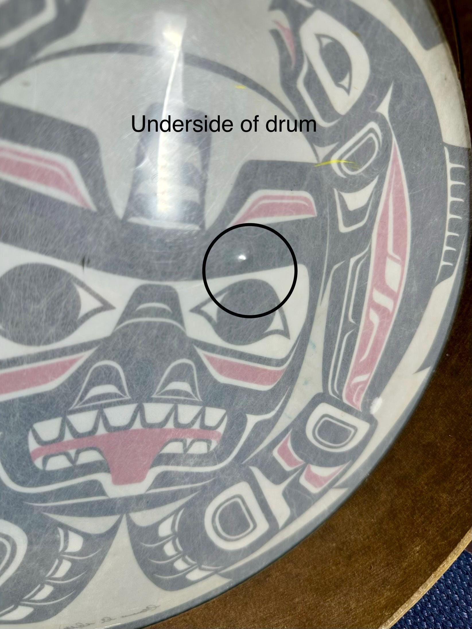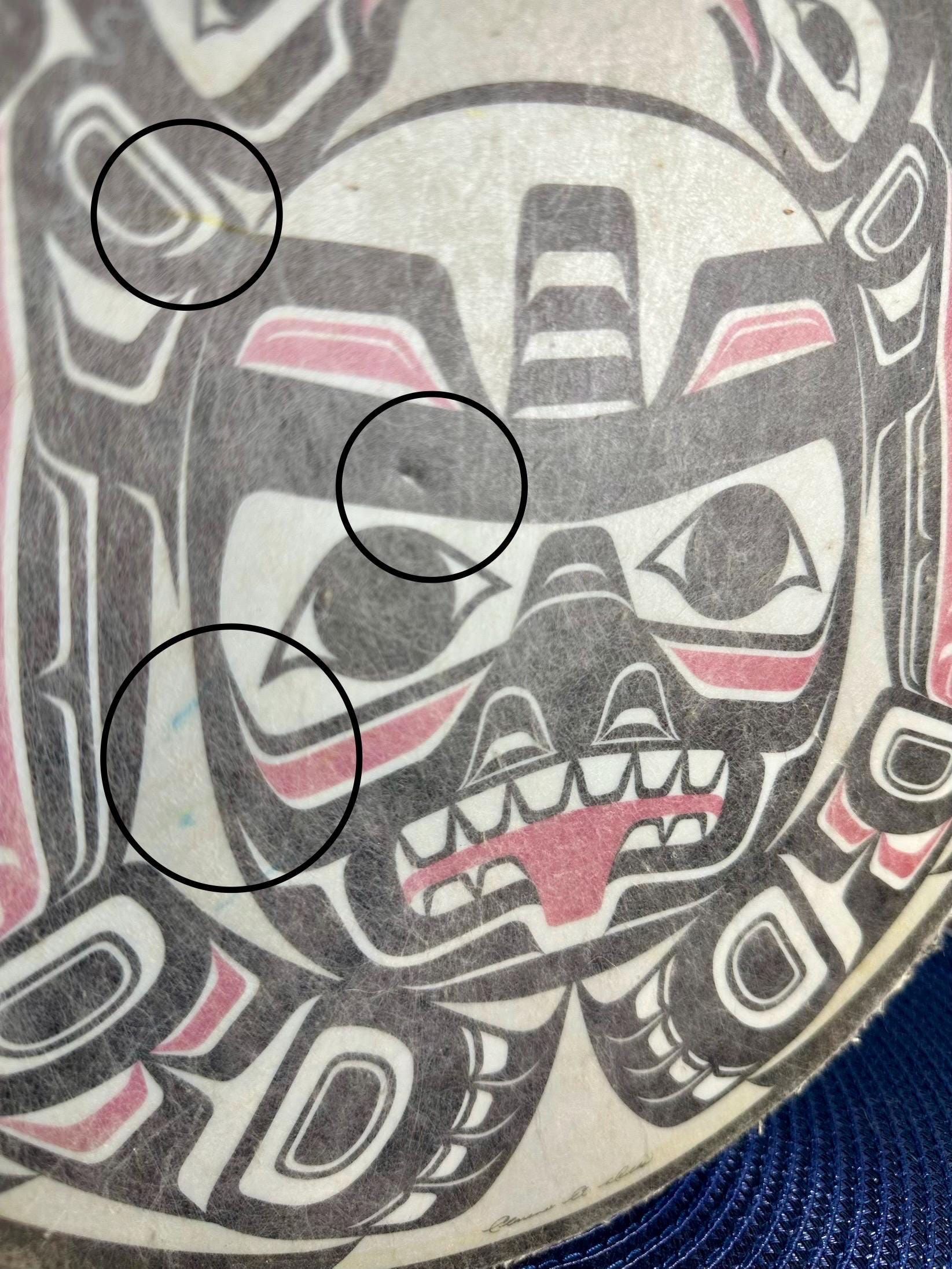 This is a Pacific Northwest Haida Art Hand Drum. This does not come with the mallet; however, it is a beautiful piece to add to your collection. There are a few areas on this drum that are age-appropriate. There is a blue mark on the drum and yellow paint on the underside of the drum. There are dimples on the drum surface buy you need to look closely to see those dimples. There are some spots where the coloring is missing. The outside of the drum edge is worn. There are pictures included for all of these areas. The condition of the drum has been taken into consideration during pricing. The drum is around 11 inches in diameter. There is a signature on the bottom of the drum, but I am not able to make out who signed it.